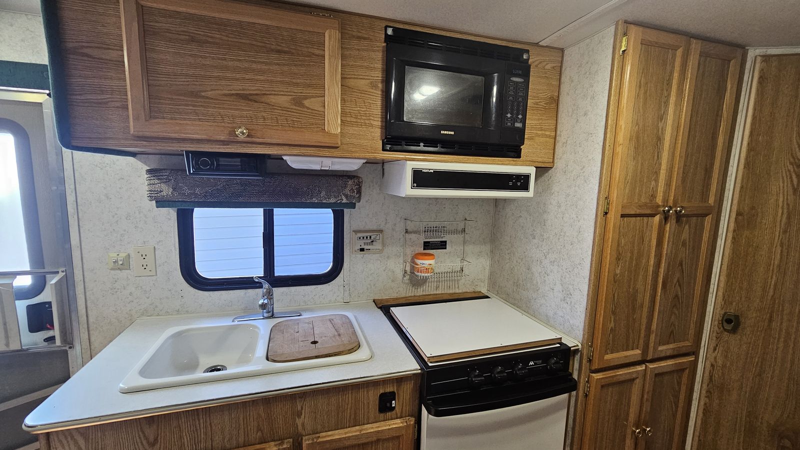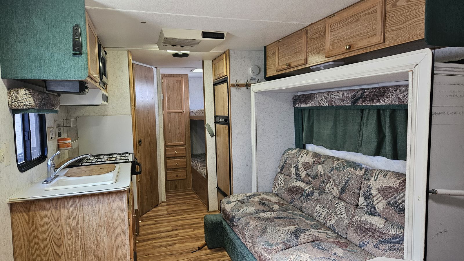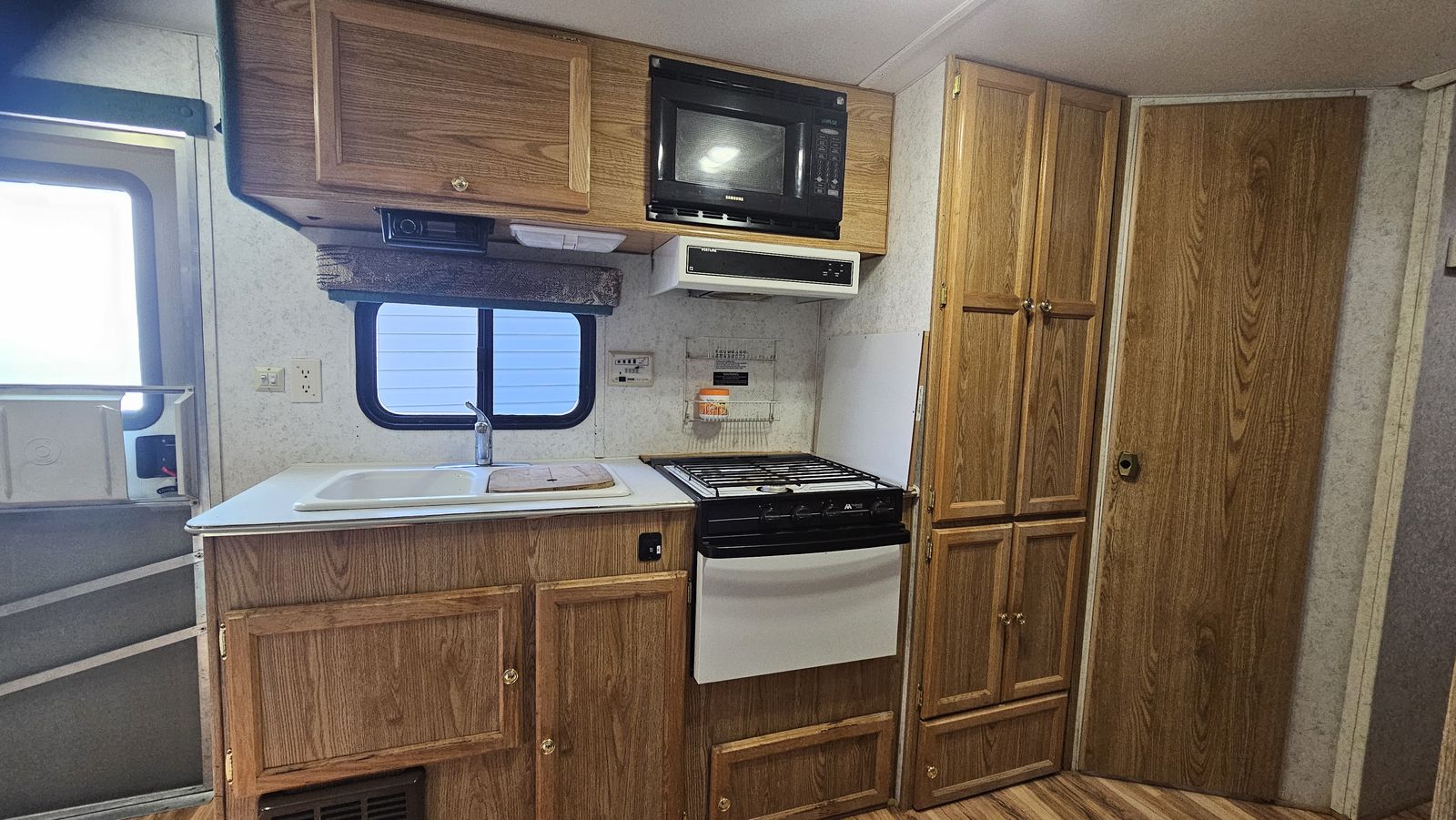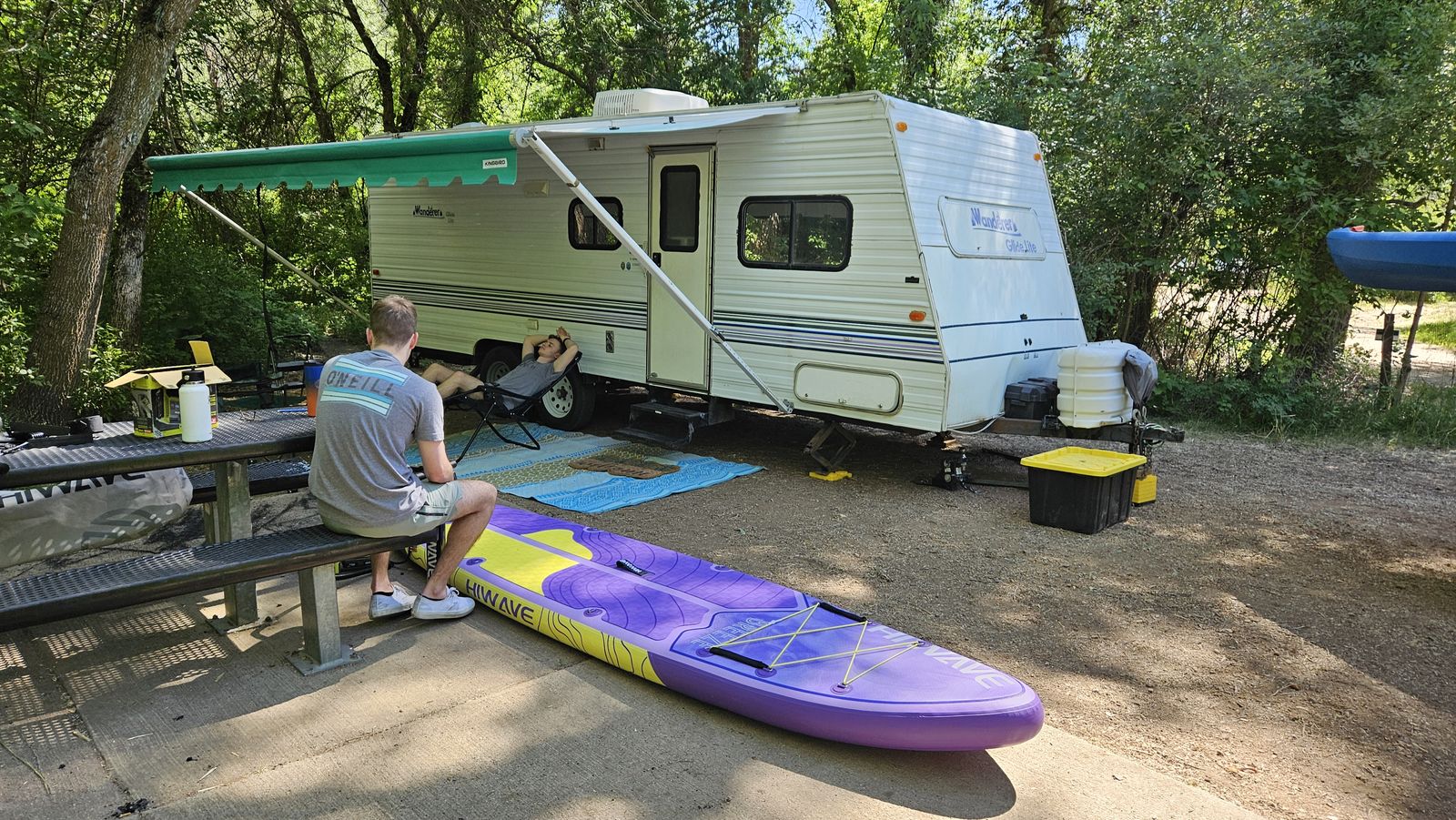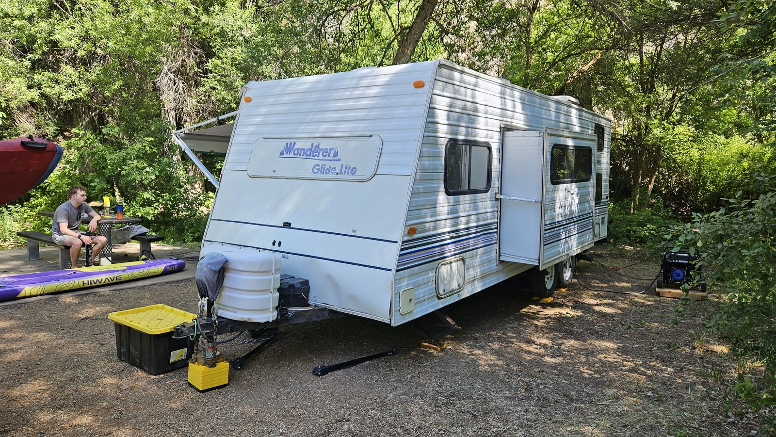 ZelleThis is a model "239MS GL" Wanderer Glide Lite Travel Trailer, that is in very good condition for its age. We just upgraded to a newer camper, but I've spent the 2 years we've had this making it really nice. This camper is an ideal entry-level camper. It weighs just 3580 lbs empty, with a max gross of 5600. The dual-axle design makes it very comfortable to tow. Includes mounted backup camera and monitor. Also includes anti-sway trailer bars and hitch. It is fully-functional (water heater, furnace, AC, stove, Bluetooth stereo, etc.). I upgraded the internal lighting to LEDs, including dimmers over the sleep areas. Added an electric hitch, for easy setup. I bought a new awning 2 years ago. New entry lock and outdoor shower. I added mirror tint to all the windows this year. I added 2 SAE wire pass-through ports to the front to easily connect solar panels. Water holds are 25g fresh, 15g gray, and 10g black. 3-burner stove with oven. Refrigerator works off 110V AC or propane. Comes with two 20lb propane tanks. Side pop-out for the inside couch/bed. This camper has lots of storage! I also added gas struts to all the vertical-opening cabinets.