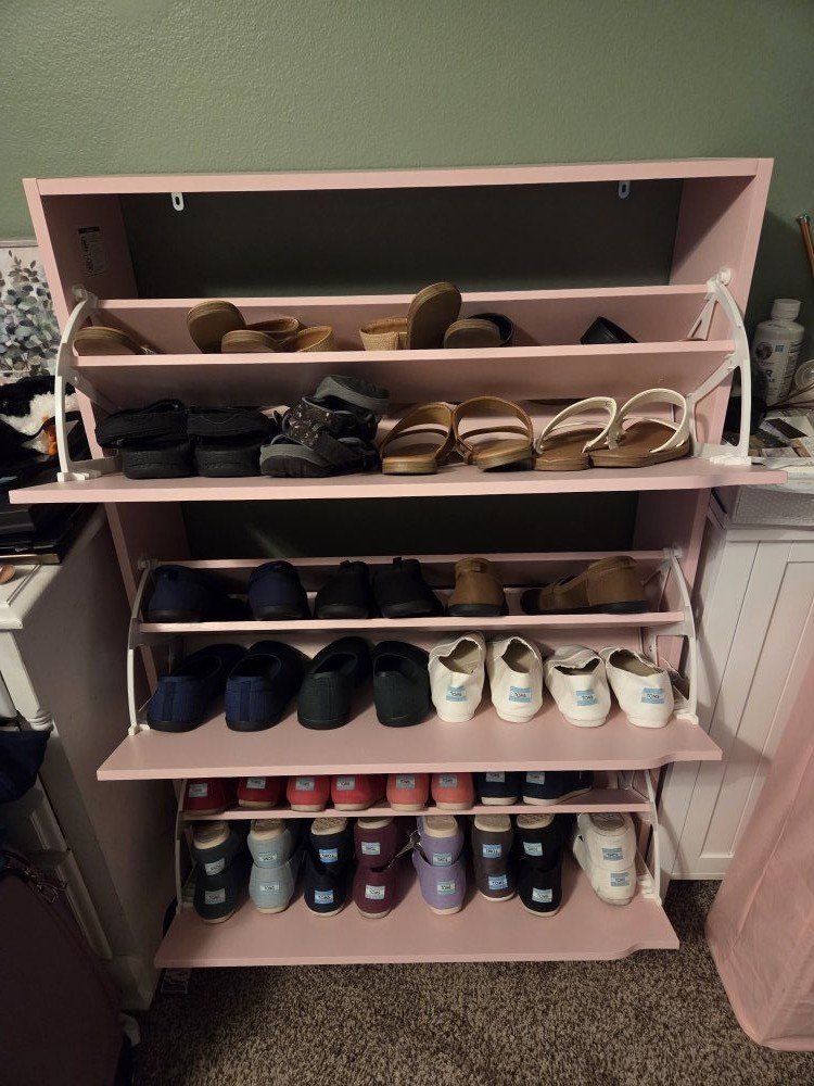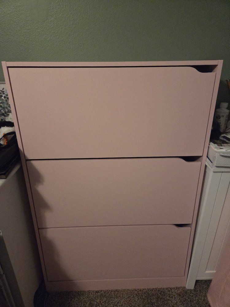 VenmoThis pink shoe cabinet is a perfect way to store your shoes with a colorful accent for your bedroom or living room! Each drawer tilts out and has a divider so it can hold six levels of shoes. It's brand new, just used for a few months. $60 OBO