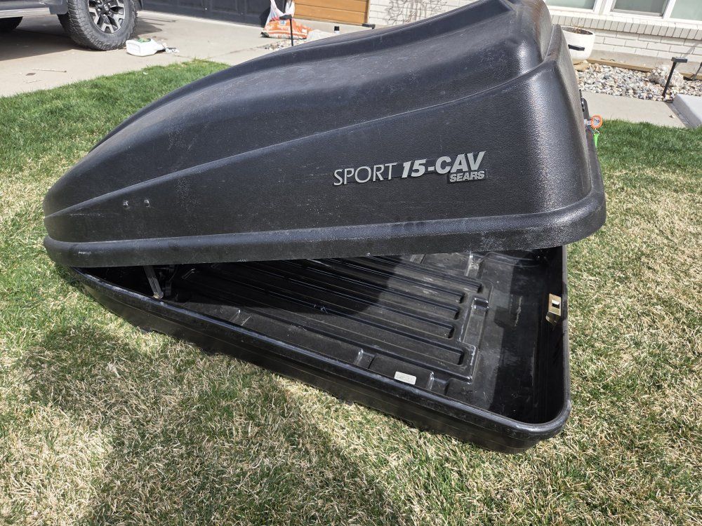 VenmoSport 15-CAV roof box/cargo box in great condition. There are no cracks, holes, or leaks. It includes all hardware and two keys with a working lock. Perfect for hauling camping gear and luggage.