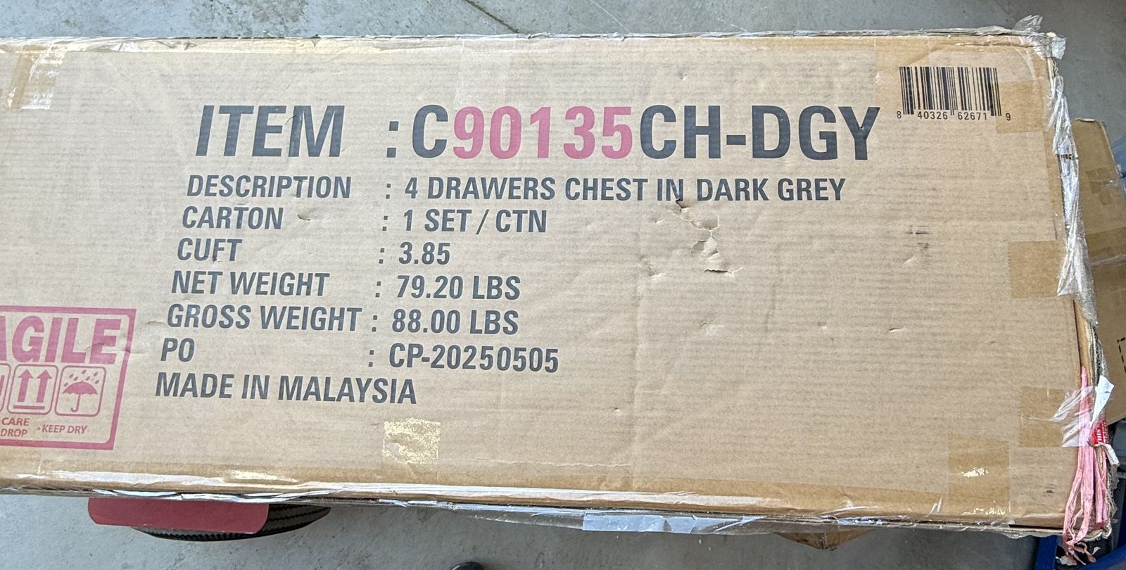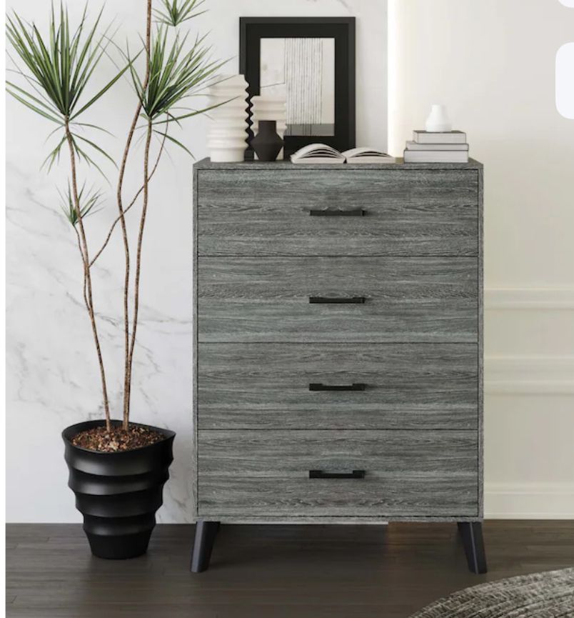 Discover the perfect blend of elegance and functionality with our Four-Tier Wooden Chest. Crafted with meticulous attention to detail, this chest features four tiers drawers, each equipped with pre-assembled metal slides, guaranteeing smooth and hassle-free operation. Supported by four gracefully tapered solid wood legs, it exudes stability and enduring durability. Combining the richness of solid wood with the reliability of engineered wood, this drawer is designed to last. Its generously spacious drawers provide ample room for all your storage needs, effortlessly concealing clutter and creating a tidy, organized space. Maintenance is a breeze, ensuring that its beauty stands the test of time. Assembly is straightforward with the included hardware pack and clear instructions, all packaged neatly in one box for your convenience. Dark Grey with sleek Black finishing on the handles and legs, this drawer seamlessly blends classic design with a modern touch. Elevate your living space with our Four-Tier Wooden Chest - a perfect marriage of style, utility, and enduring quality. • Featuring four tiers of wooden drawers equipped with pre-assembled metal slides. • Enhanced by four elegantly tapered solid wood legs, ensuring both stability and long-lasting durability. • Constructed from a combination of solid wood and engineered wood. • The generously spacious drawers offer ample room for various items, effectively concealing clutter for a neat and organized look. • Easy care and cleaning • Easy to assembly with sorting hardware pack and assembly instructions