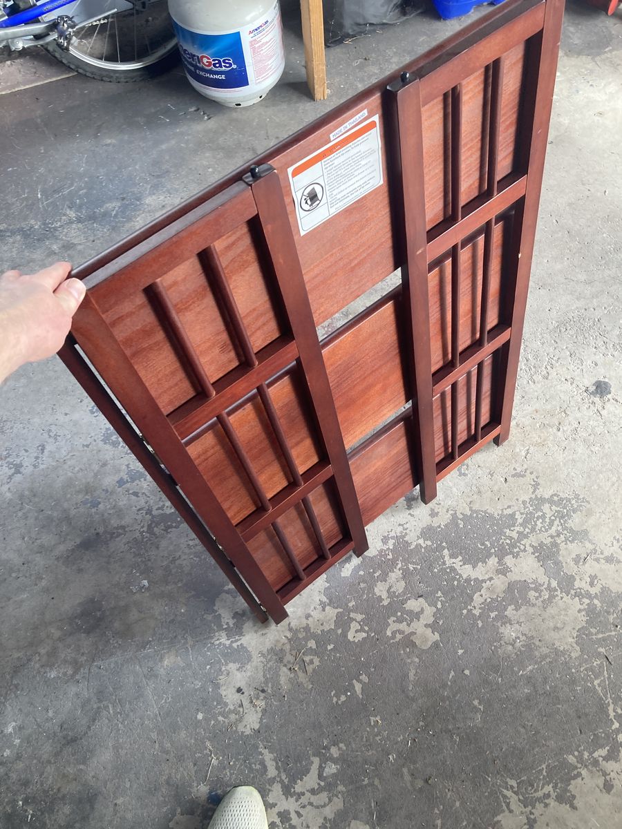 PayPalBurgundy/red stain color. Folds flat. 27” wide, 12” deep, 38” tall.