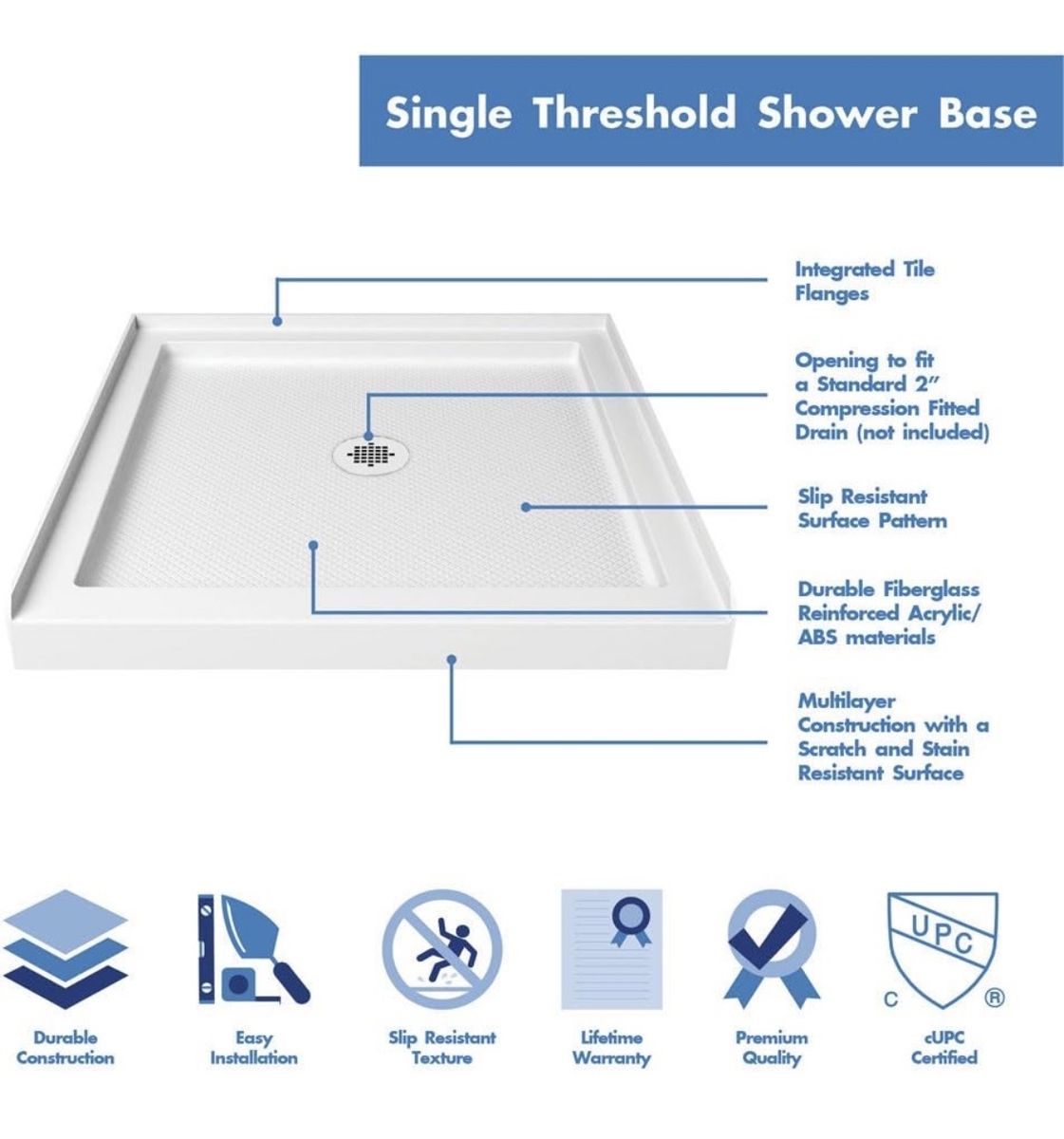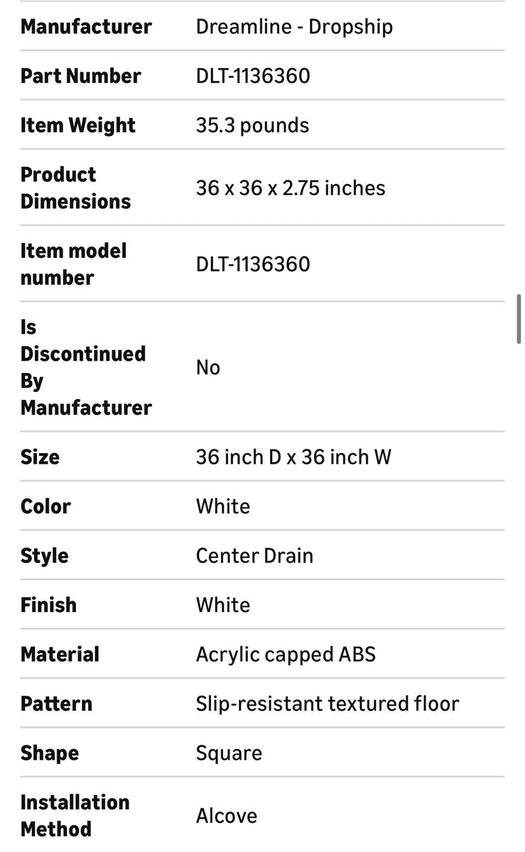 ZelleDreamLine SlimLine 36 in. D x 36 in. W x 2 3/4 in. H Center Drain Single Threshold Shower Base in White, DLT-1136360