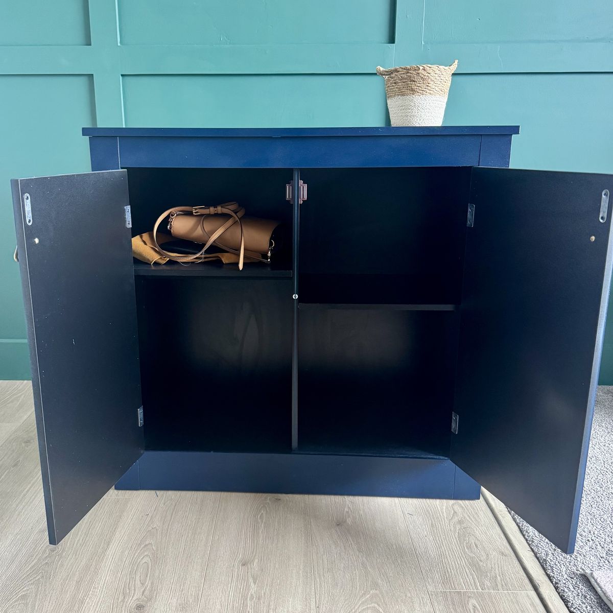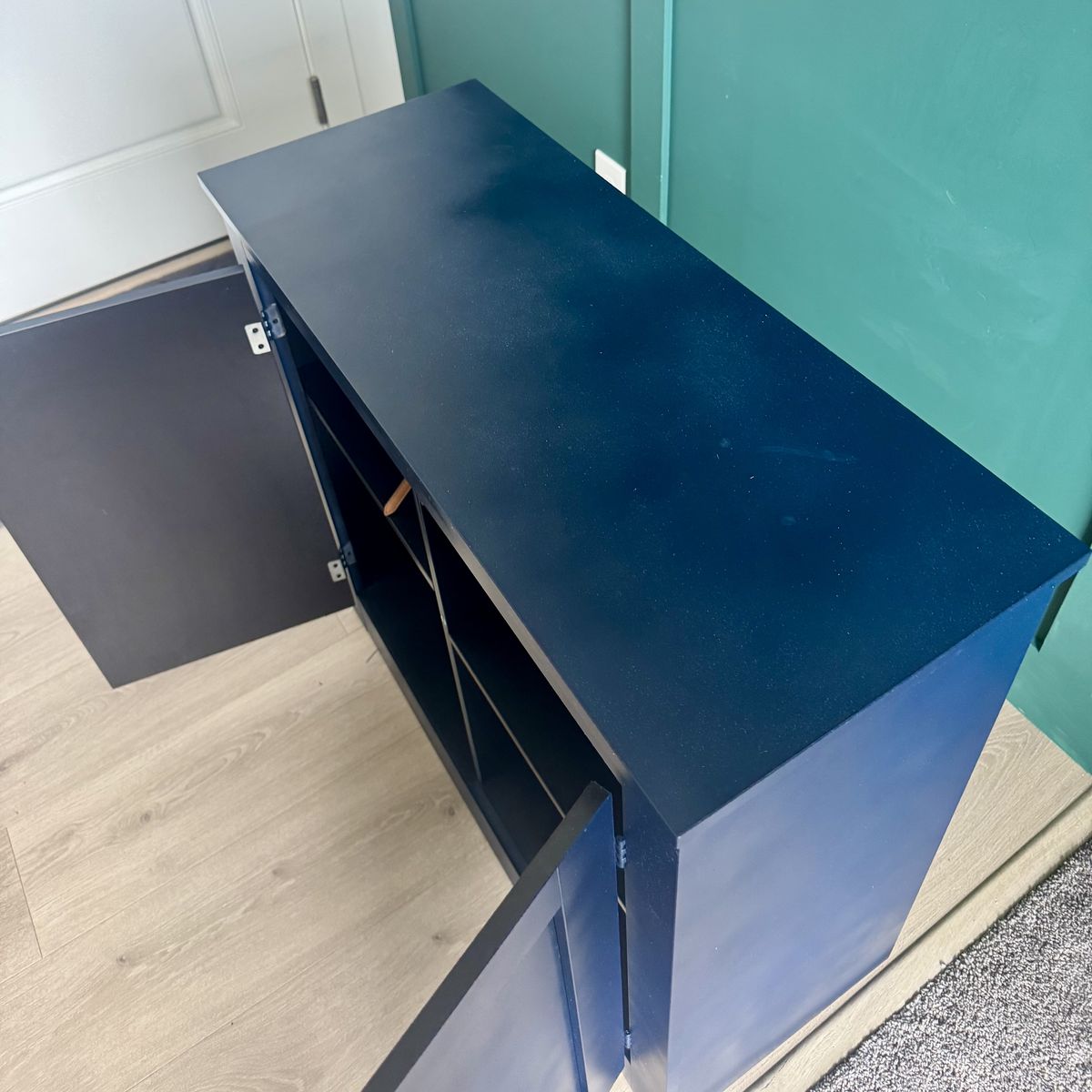 VenmoNavy blue modern cabinet for sale! We have used it as an entryway cabinet console, but it’s a versatile piece for any space in need of some extra storage. Great condition, with normal wear and tear.
