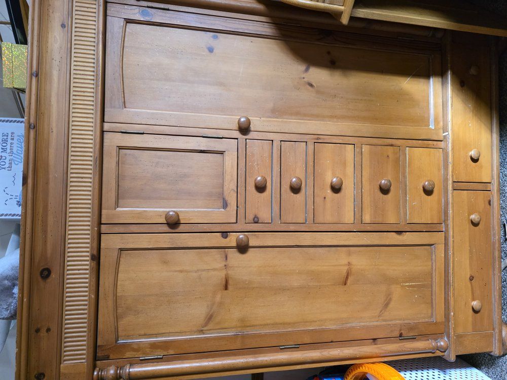 VenmoSolid Wood Baby Furniture Set – Changing Table + Armoire (Great Condition!) Beautiful, sturdy baby furniture set made from solid wood—built to last and perfect for a nursery or kids’ room! Included: Changing Table / Dresser Spacious top for diaper changing Multiple drawers + cabinet for storage Classic design with raised back and sides for safety Armoire / Wardrobe Double doors with hanging/storage space Center drawers for organizing clothes, blankets, and essentials Bottom drawers for extra storage Details: Solid wood (not particle board) Warm, timeless finish that works with any décor All drawers and doors function well Normal wear from use (light scratches shown in photos) Perfect for: Nursery setup, toddler room, or extra storage for kids’ clothes and gear.