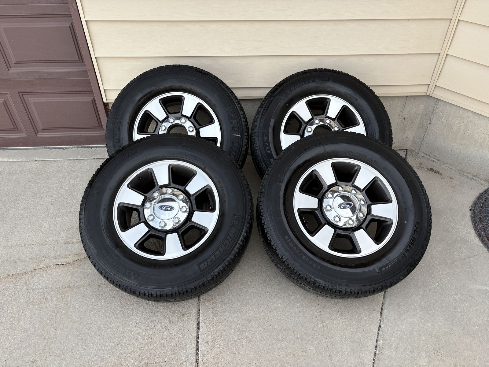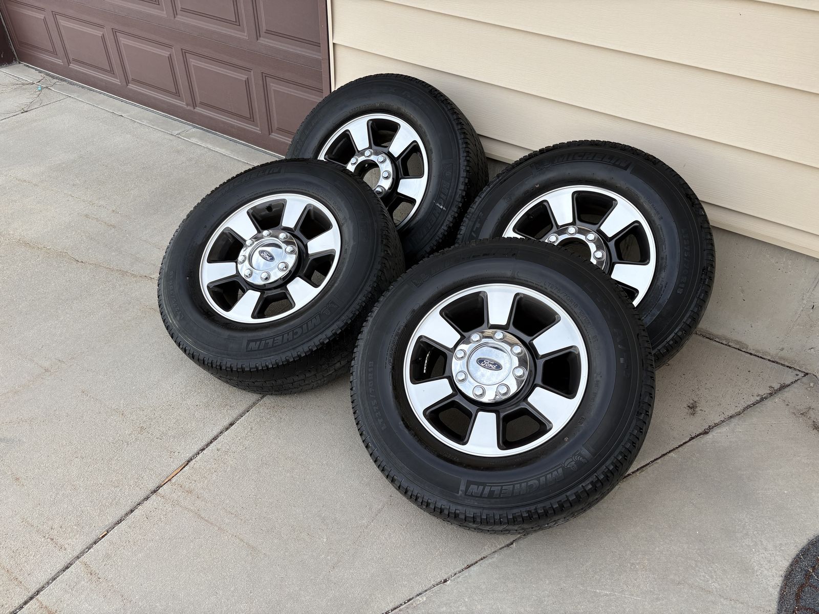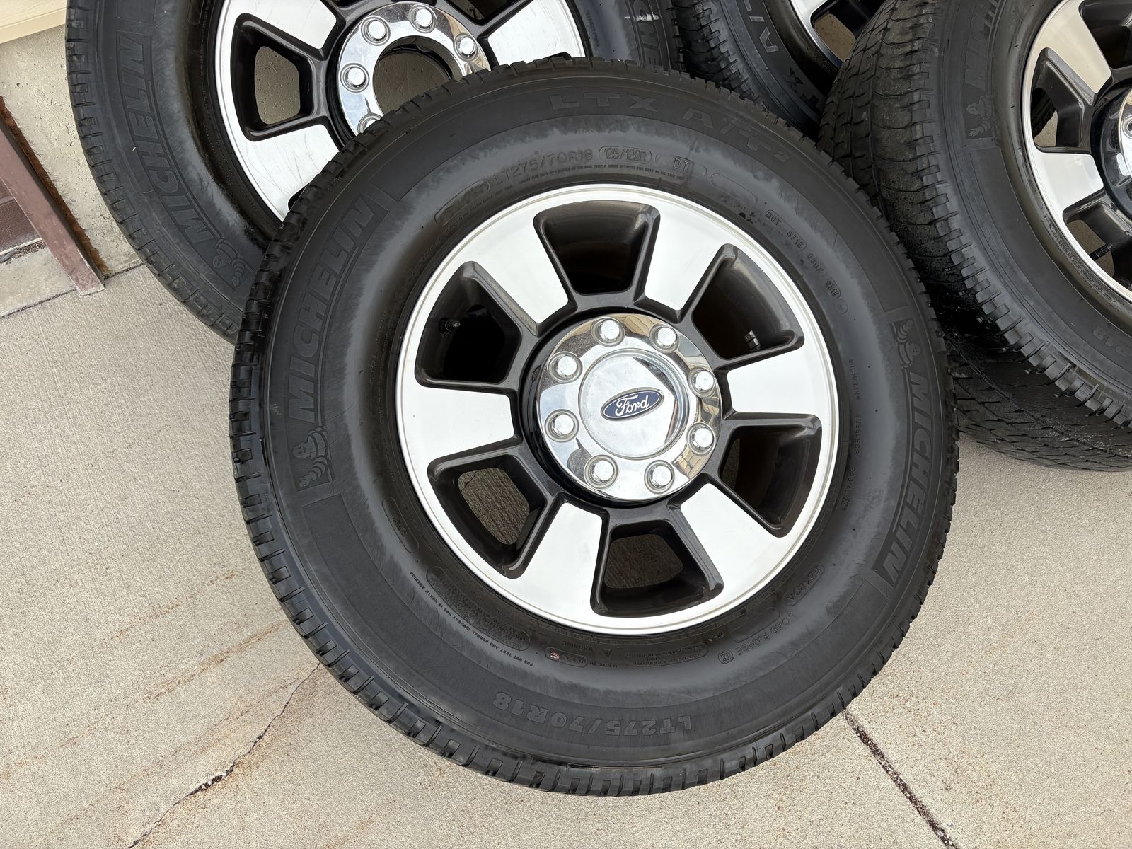 VenmoStocks off a 2016 Ford F350 Lariat. Lug pattern 8x170. 275/70r18 Michelin tires. In good shape, tires have roughly 30-40% tread left. Located in tremonton