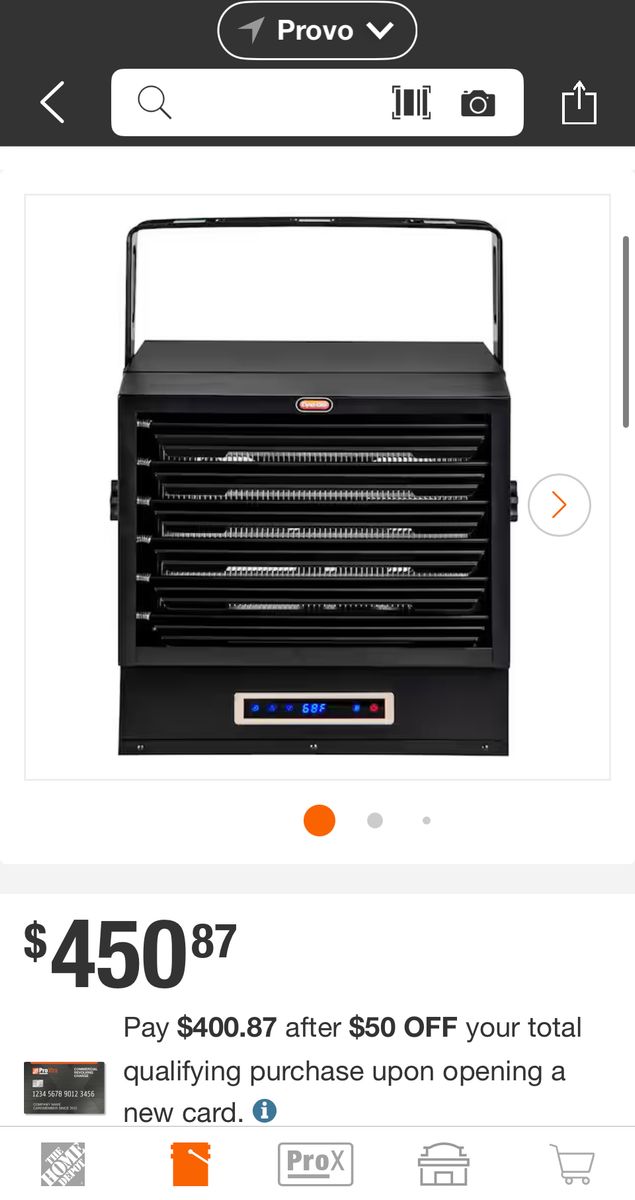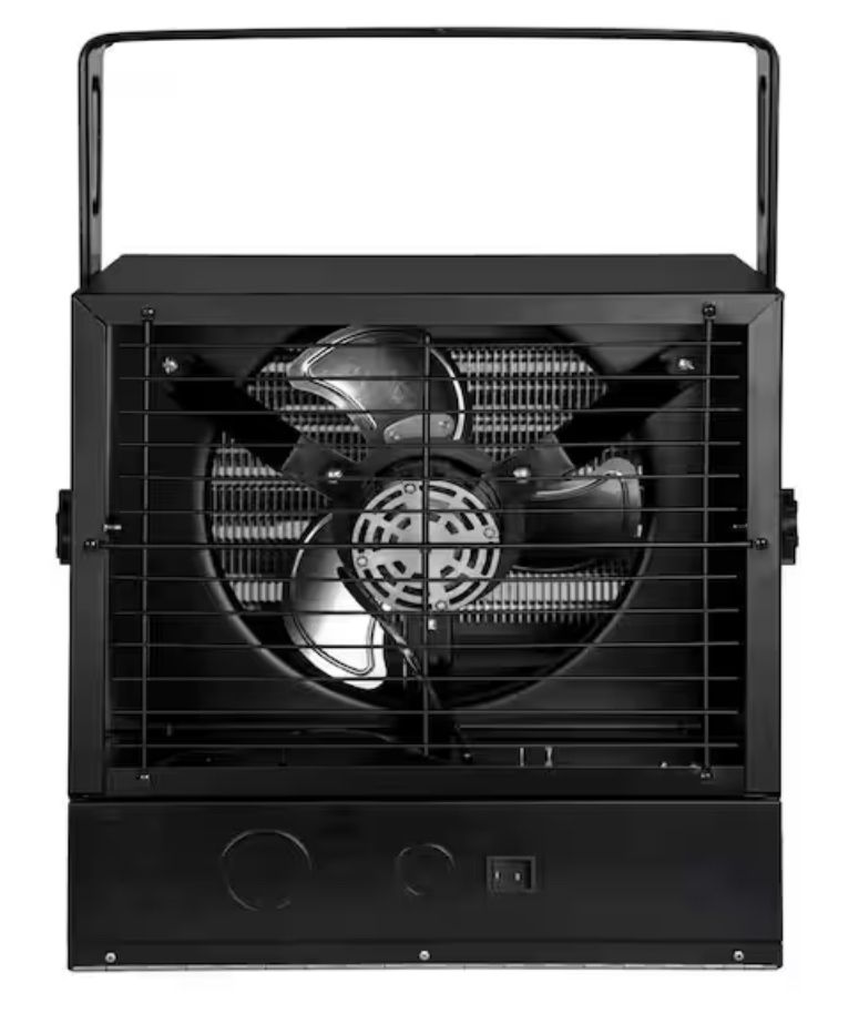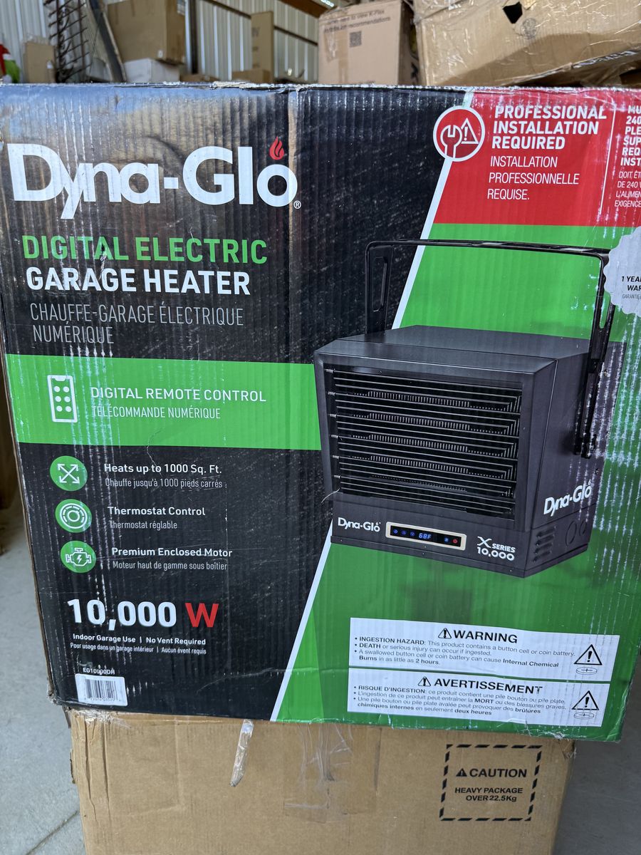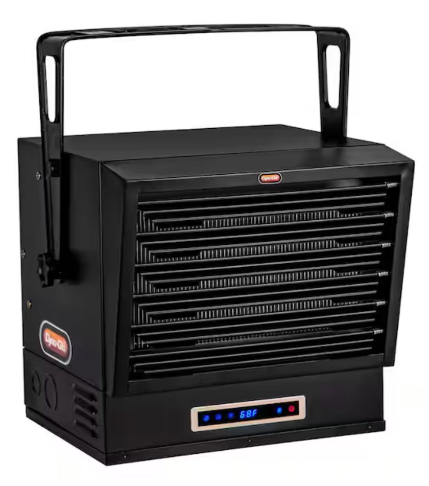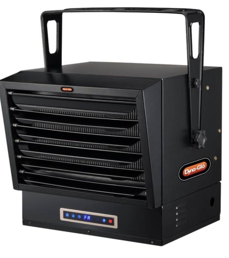 The Dyna-Glo X-Series 10000W Electric Garage Heater is the ideal heating solution for your garage, warehouse, or workshop. This unit includes multiple heat and timer settings as well as a 'fan only' setting, all easily controlled by remote control and displayed on the LED touch screen. The heater provides 25,589 and 34,121 BTUs while efficiently heating areas up 1,000-sq ft. To ensure safety this heater was designed with overheat protection and a caution indicator light.