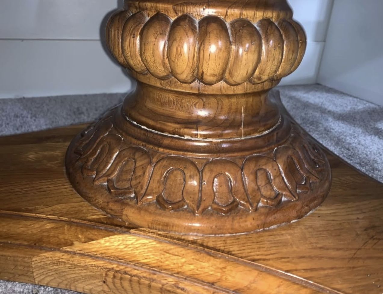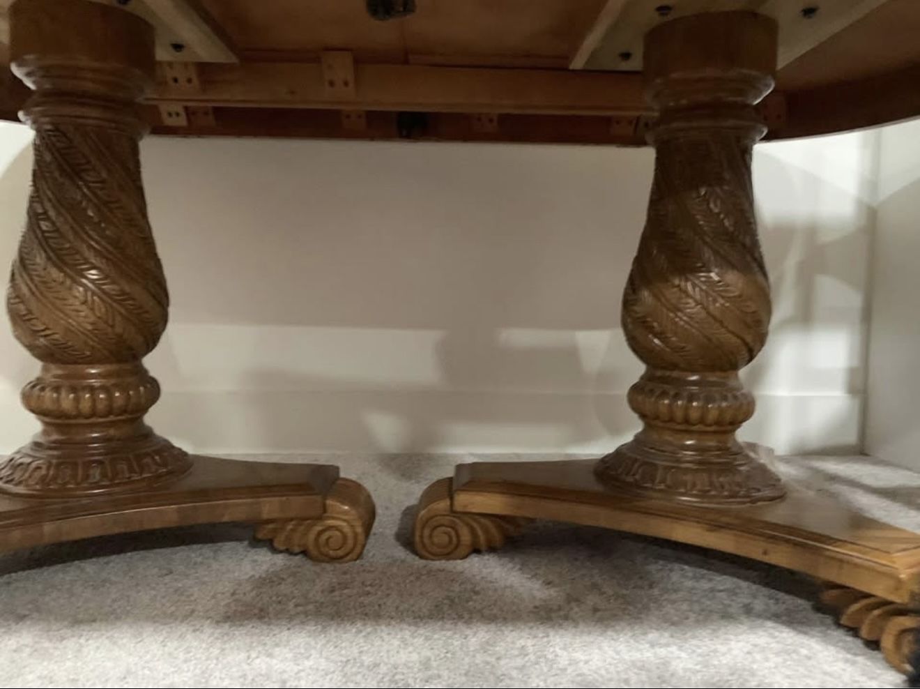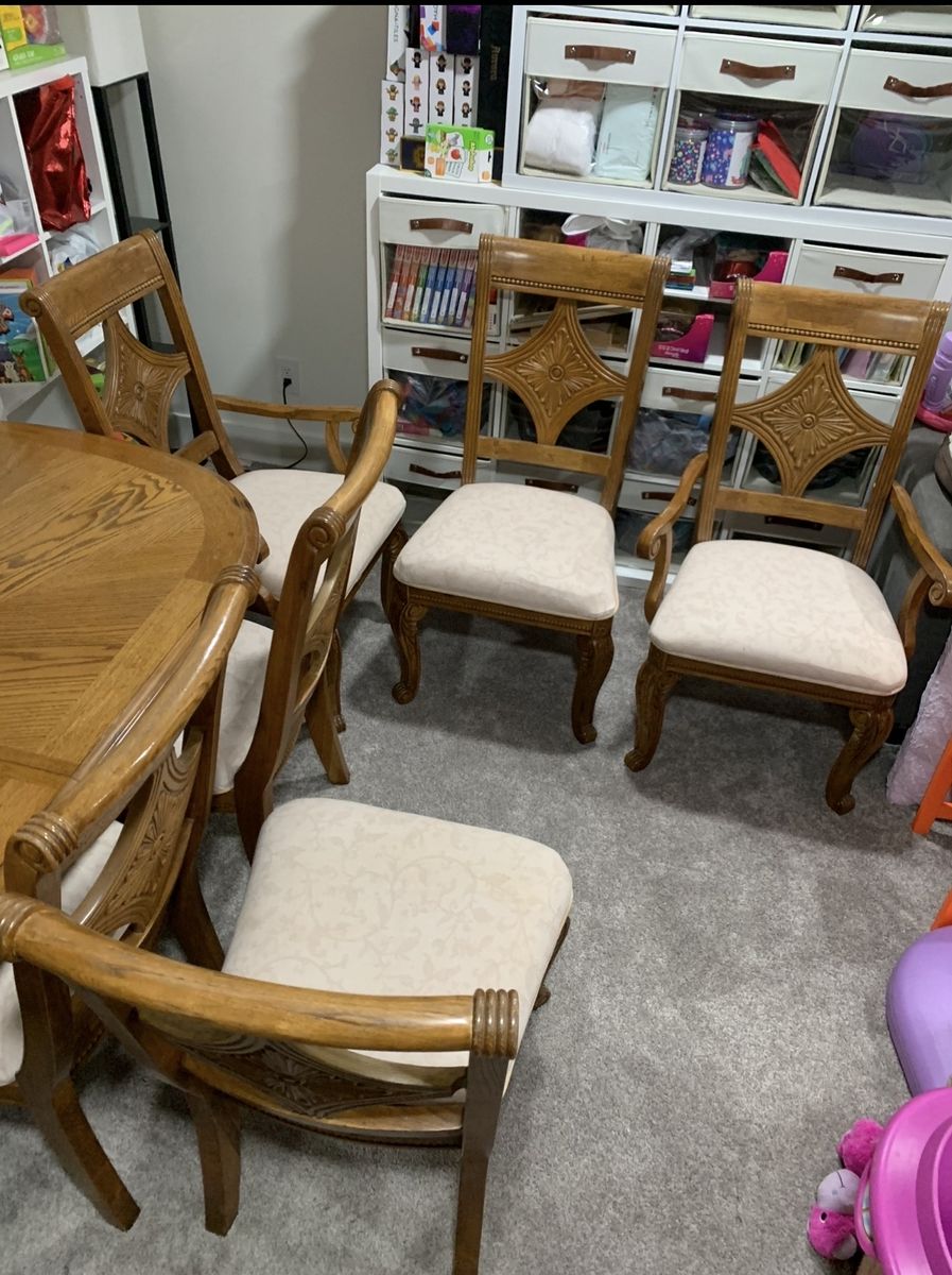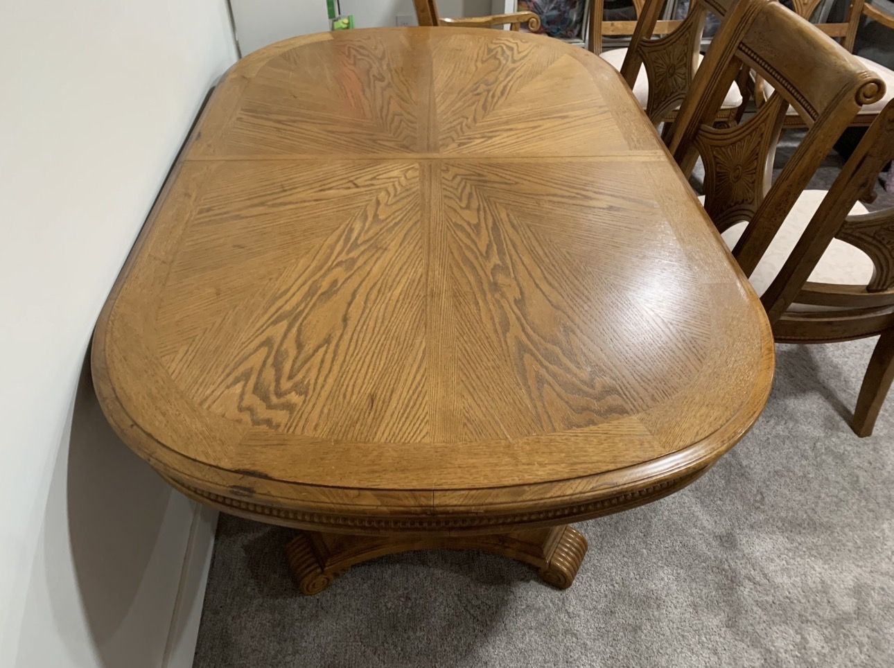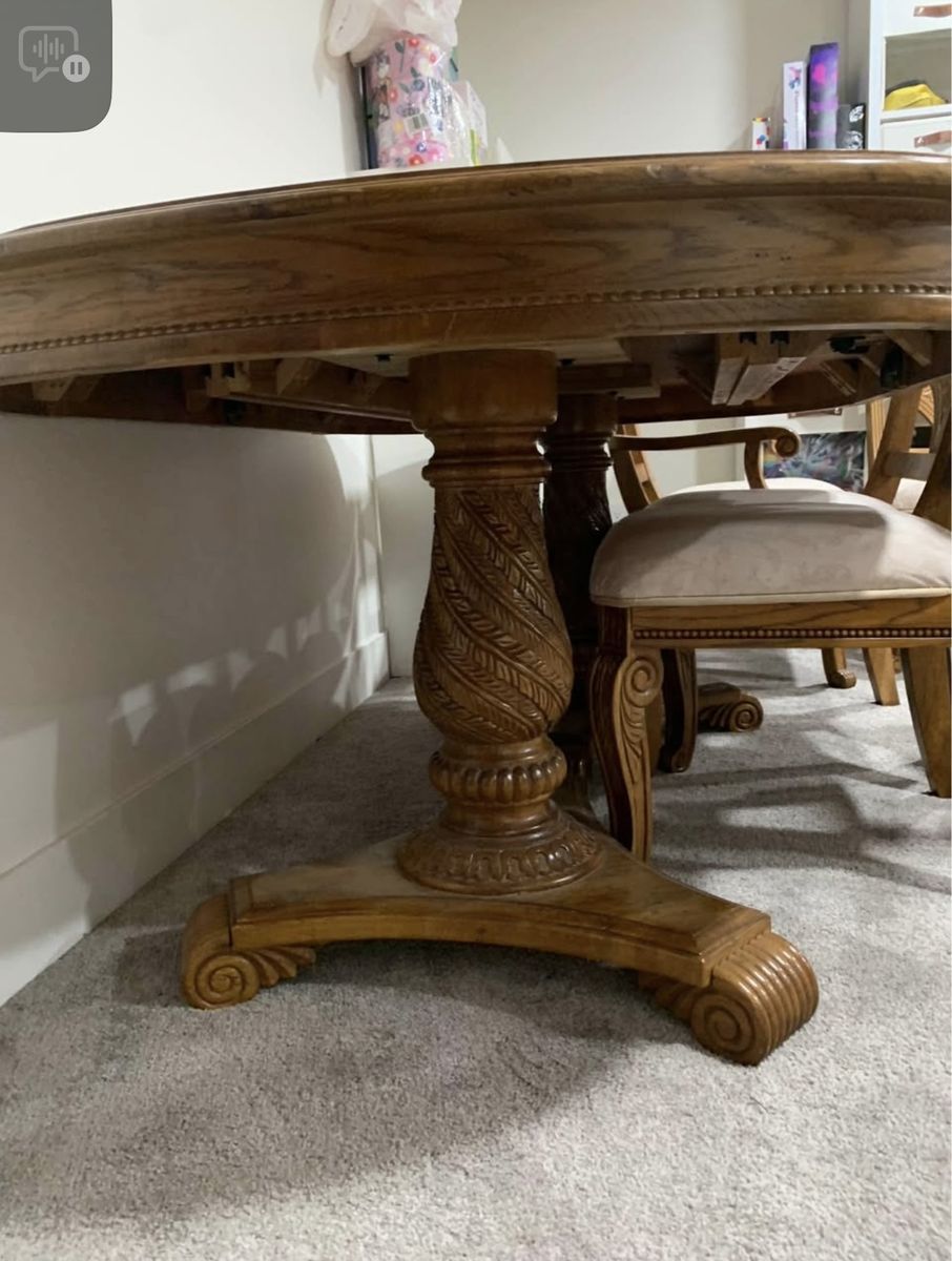 It has a beautiful detailed matching table and chairs. The table is taken apart because it doesn’t fit in our new house. It will be much easier to move this way. The table and chairs has wear. One of the legs is coming unscrewed and needs to be tightened and possibly glued. The table is still functional and sturdy. You just need to be careful moving it. The table has a leaf so that the table can become longer. The leaf isn’t in the table in the picture.