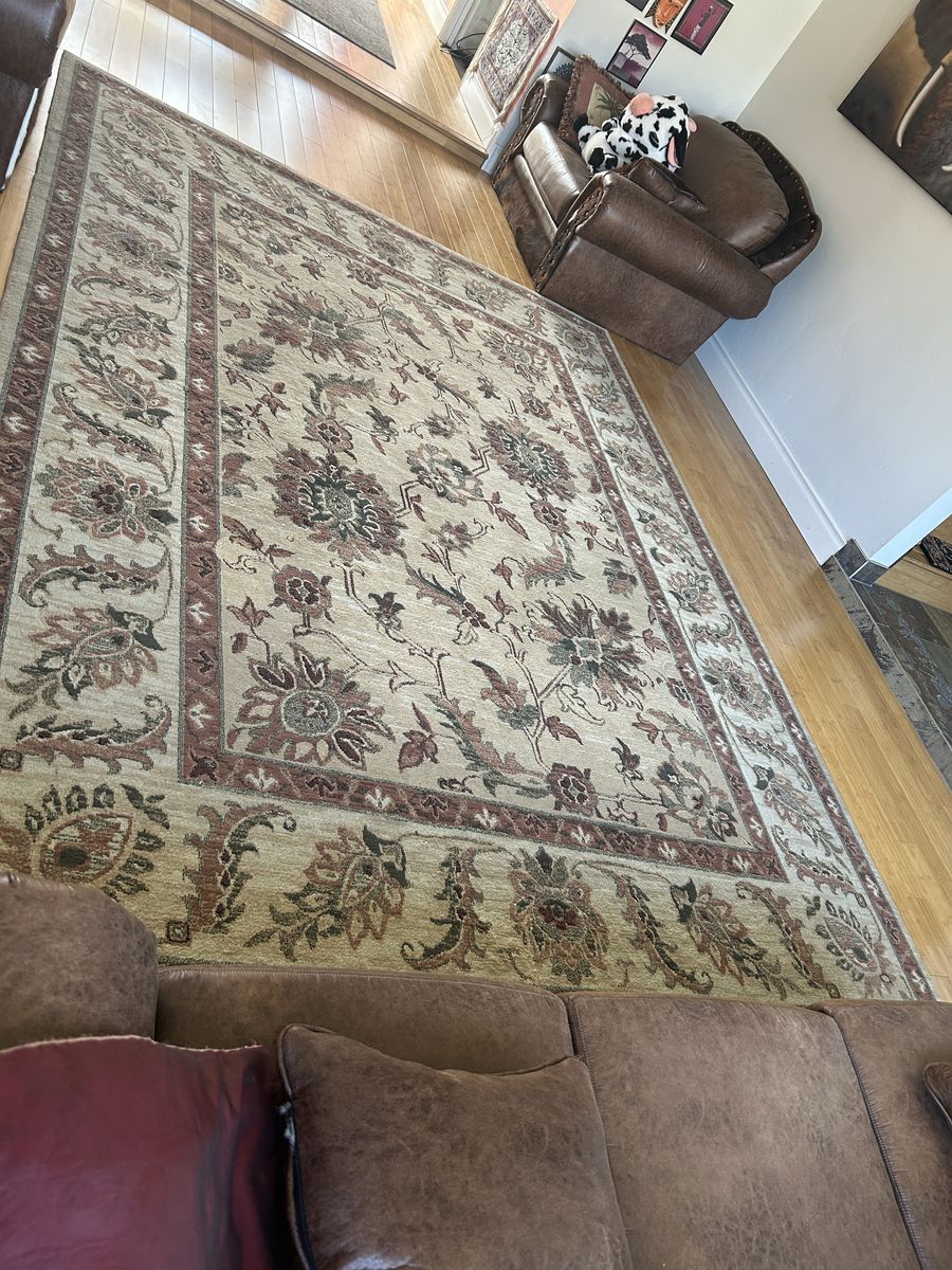 Beautiful large area rug (approx. 8’ x 11’) in great condition. Very thick, soft, and comfortable — much higher quality than the thin rugs you usually see.