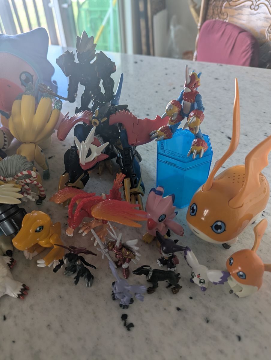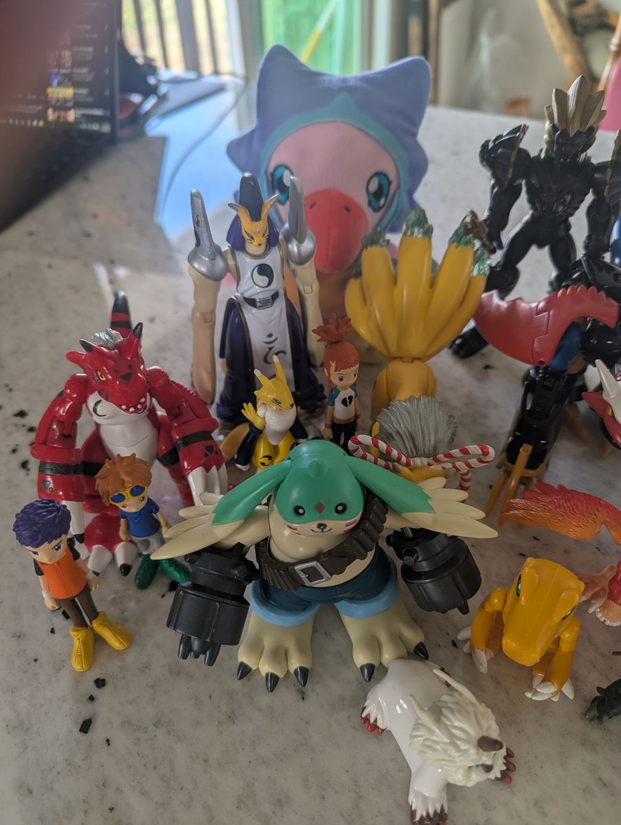 GooglePayLot of Digimon figurines. Seasons1-4. A few have scuff marks but in very good condition. Plush is new.