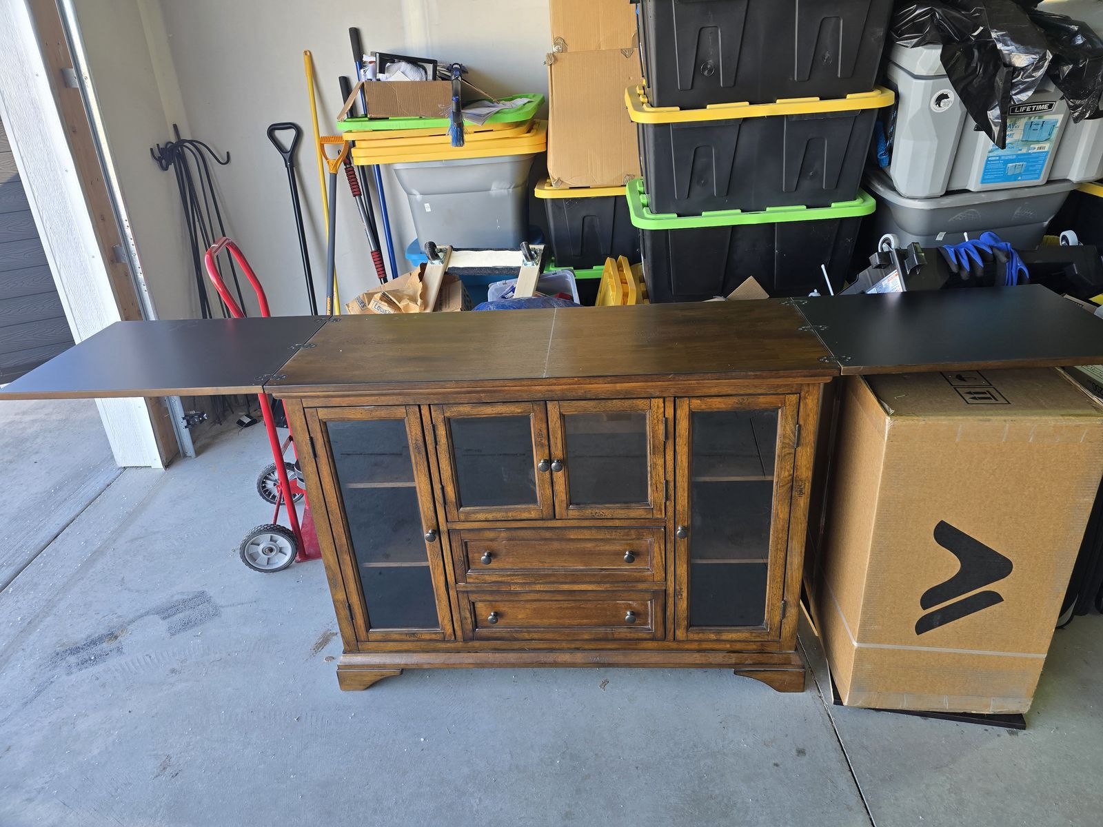 Beautiful Mariposa Collection by A-America. Constructed of Solid Asian Hardwood 20% with NC top coat, Rustic Whiskey finish. Actual hardwood, No particle board or MDF. Beveled glass doors. Felt lined drawers with English Dovetailed drawer boxes. Fold out top for extra server space Dimensions: 36" H x 47.5 - 95" W x 18.11" D