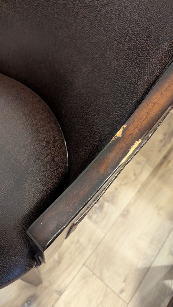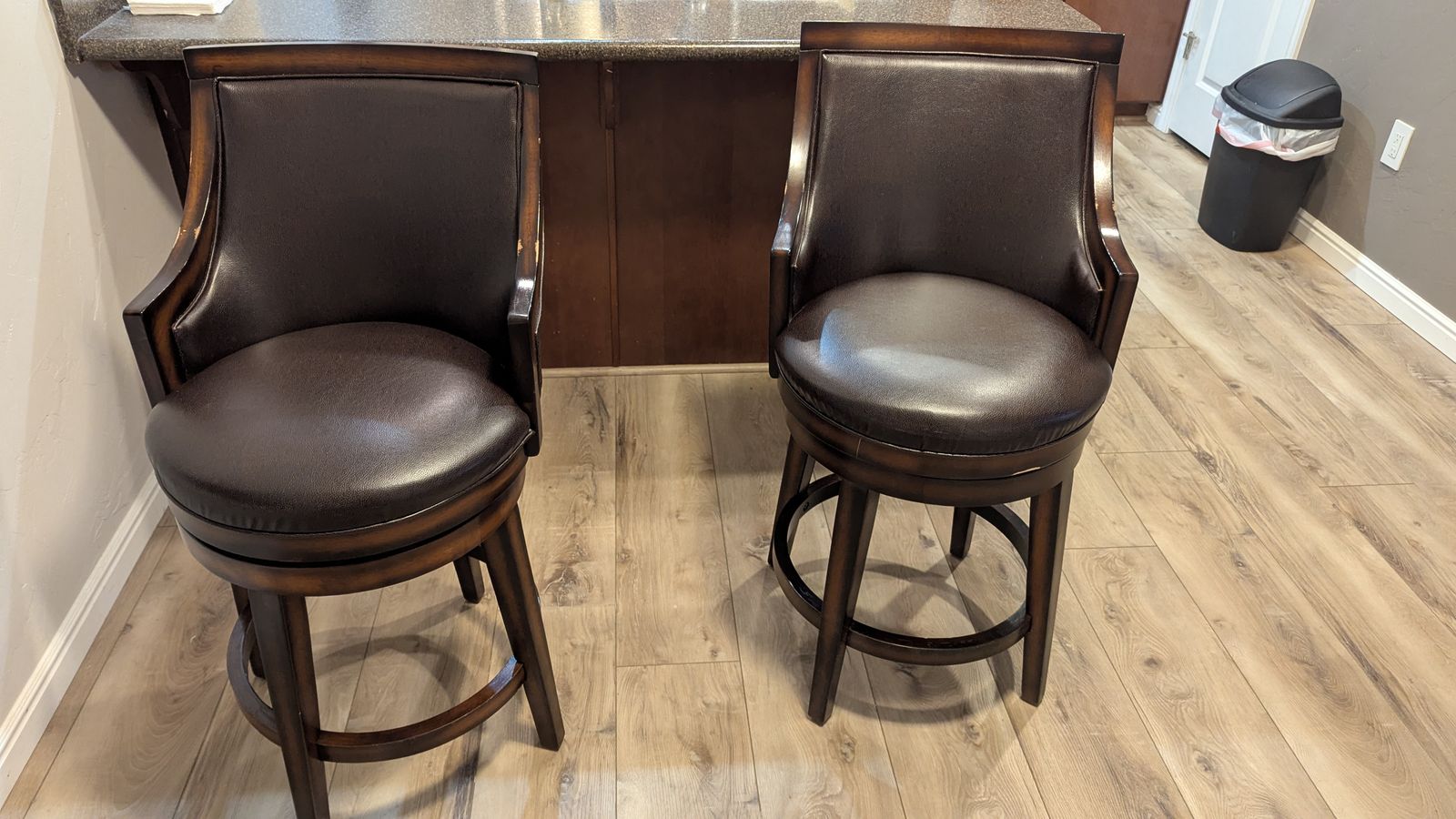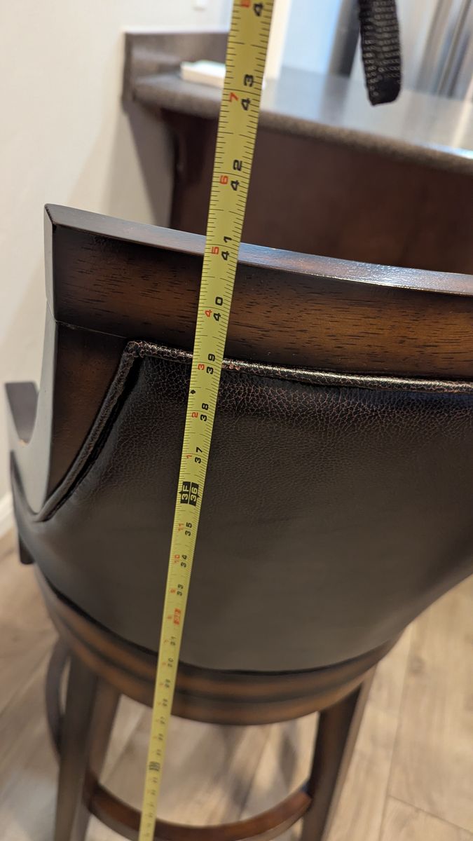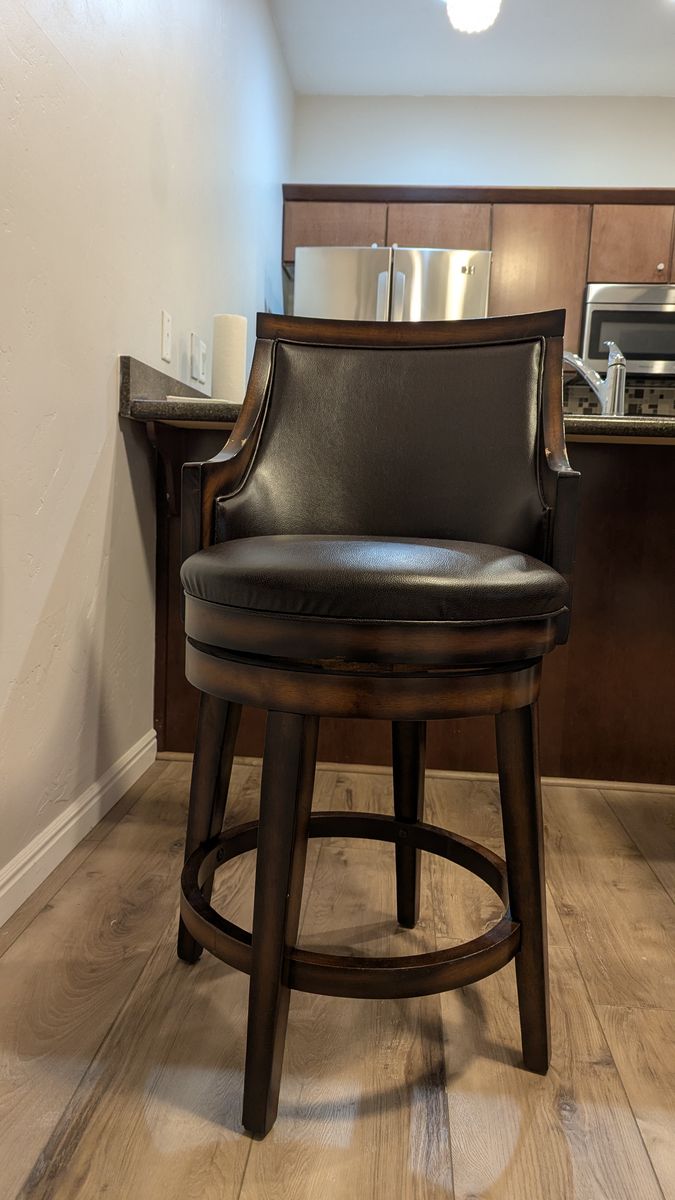 Traditional with a contemporary edge, this Swivel Bar & Counter Stool is a handsome addition to any bar or kitchen area. Gently sloping arms compliment the square back and tapered legs, while durable brown vinyl covers the seat and back. A rustic oak finish with burnished edges completes the look of this stunning stool.