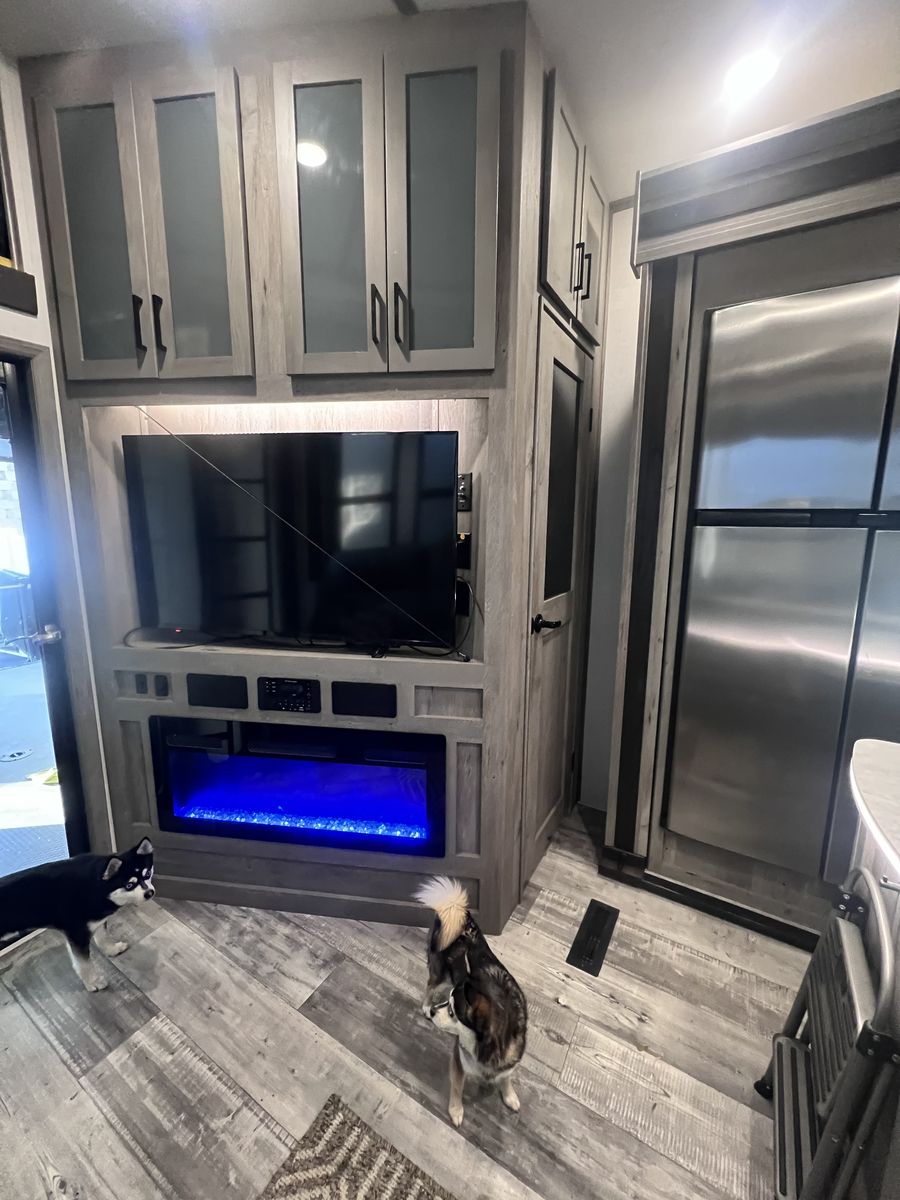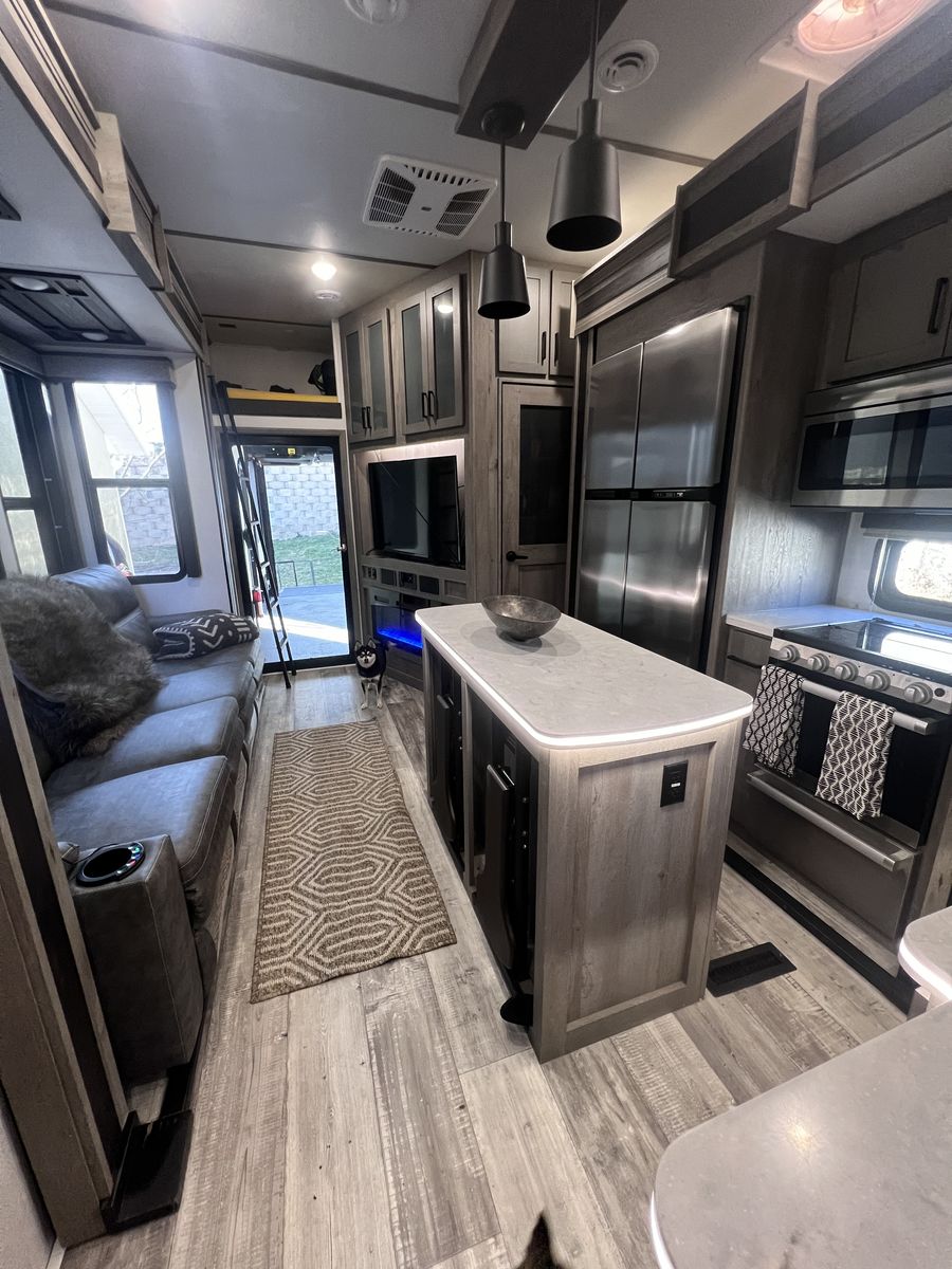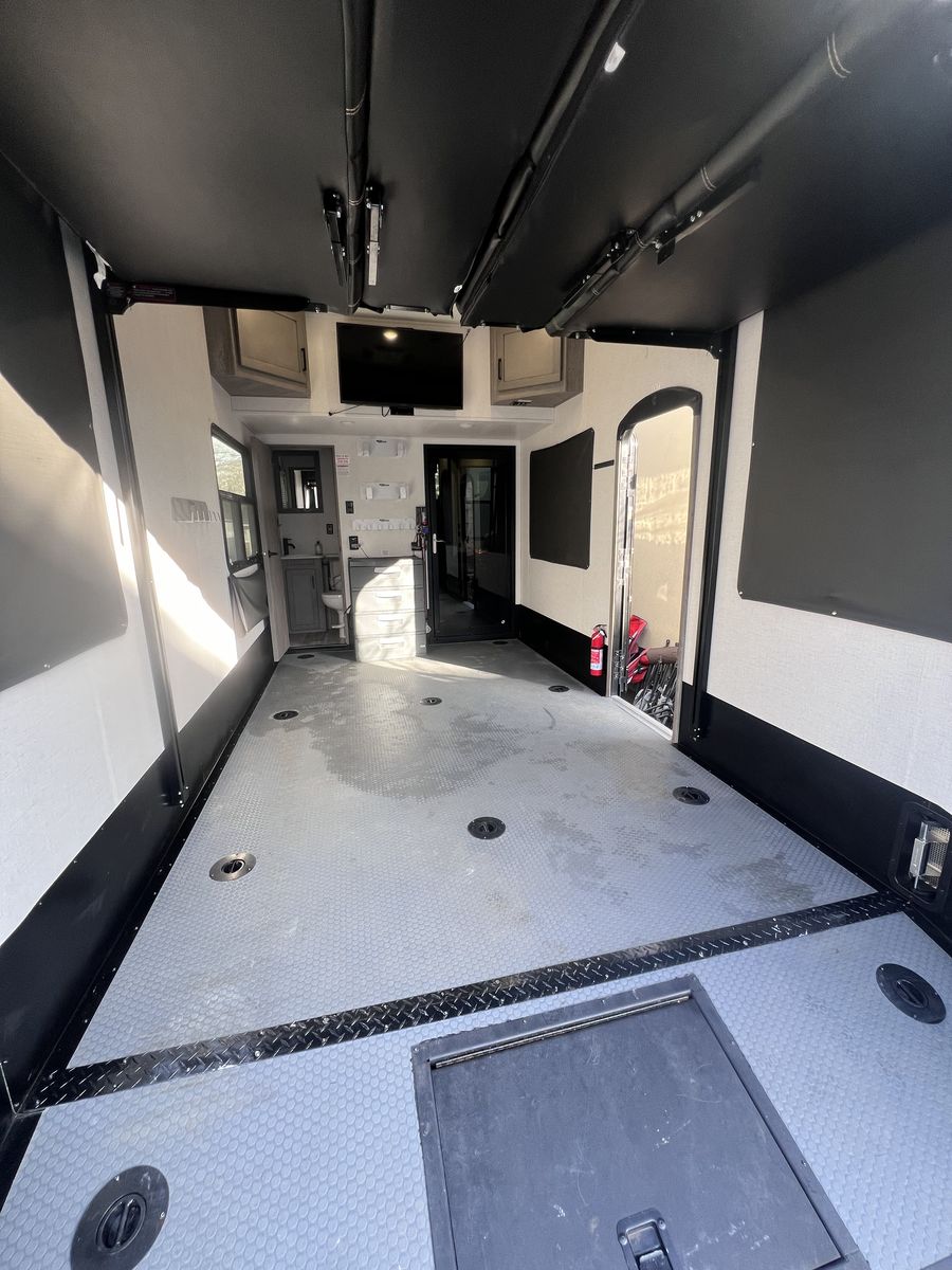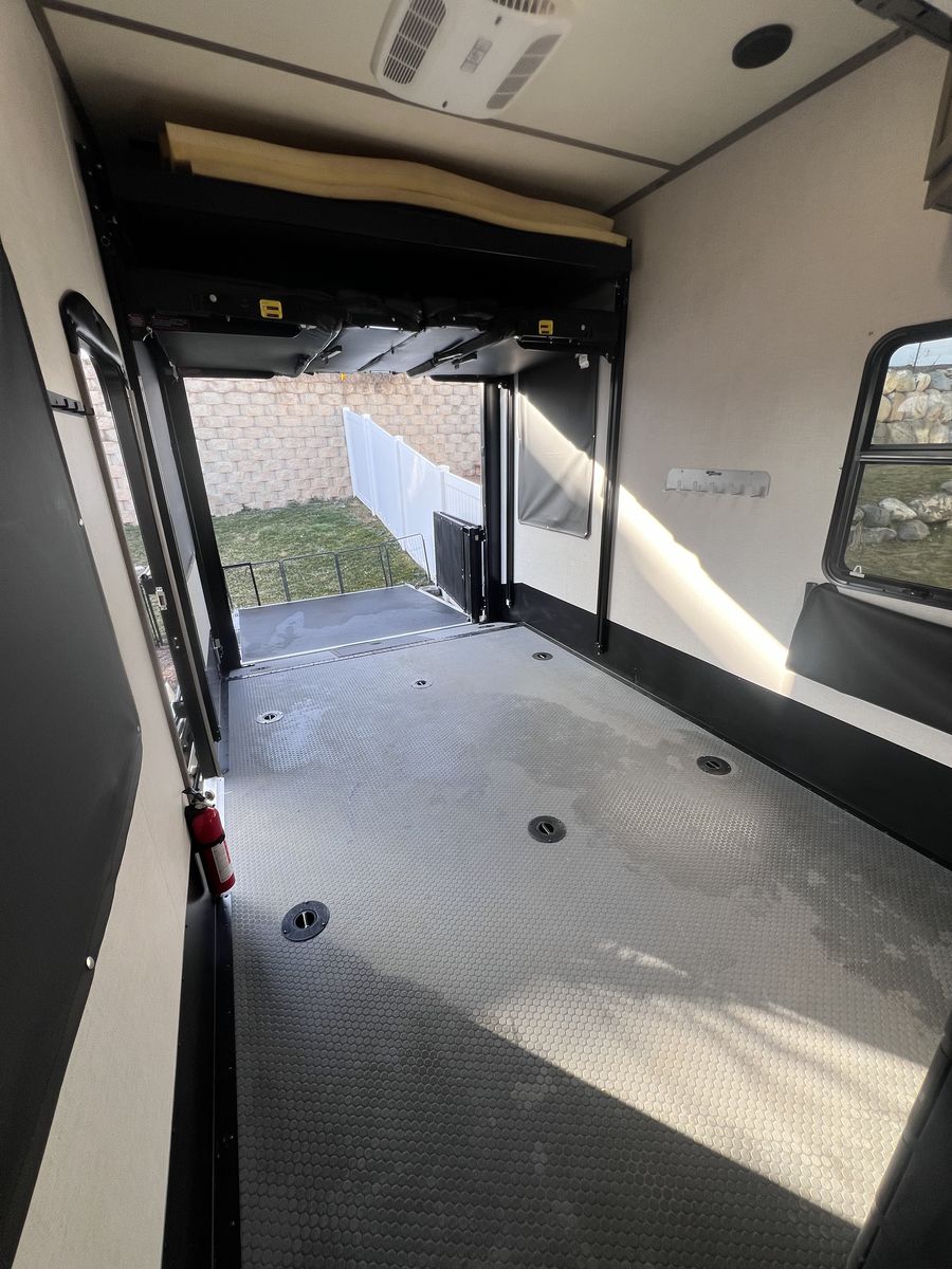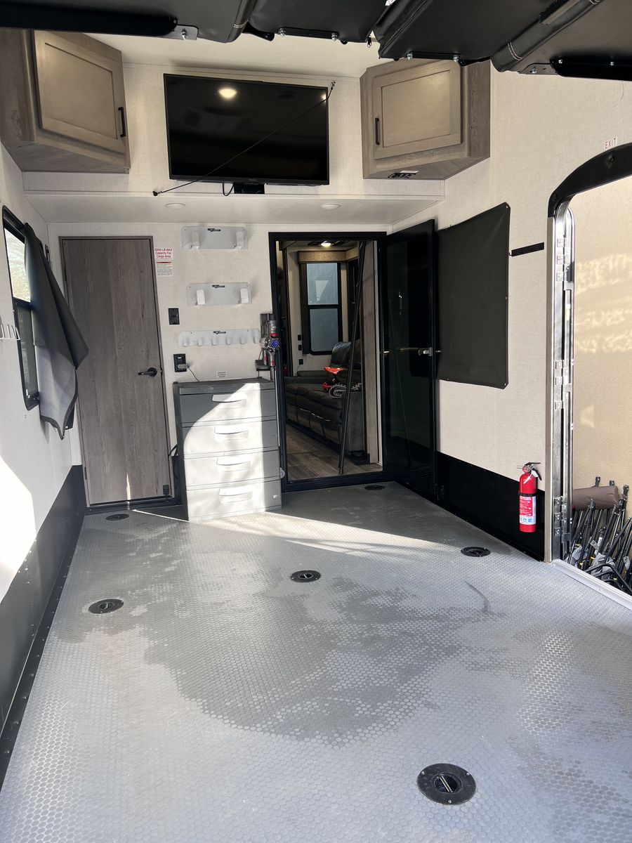 15 foot garage!! This toy hauler has been an awesome unit and we have maintained it very well. Everything works great with no issues and comes with every option for the year. Easily fit any 4 seat sxs with dirt bike in the garage. This trailer tows smooth down the highway. Also included is an Anderson hitch rated at 24,000 lbs. Some options include: *100 gal fresh water *Tankless water heater *Electric fire place with heat *3 TV’s *King size master bed with under storage *massage sofa with heat *LED interior lighting throughout *Glass storm doors in garage (removable) *5,000 watt onboard generator \