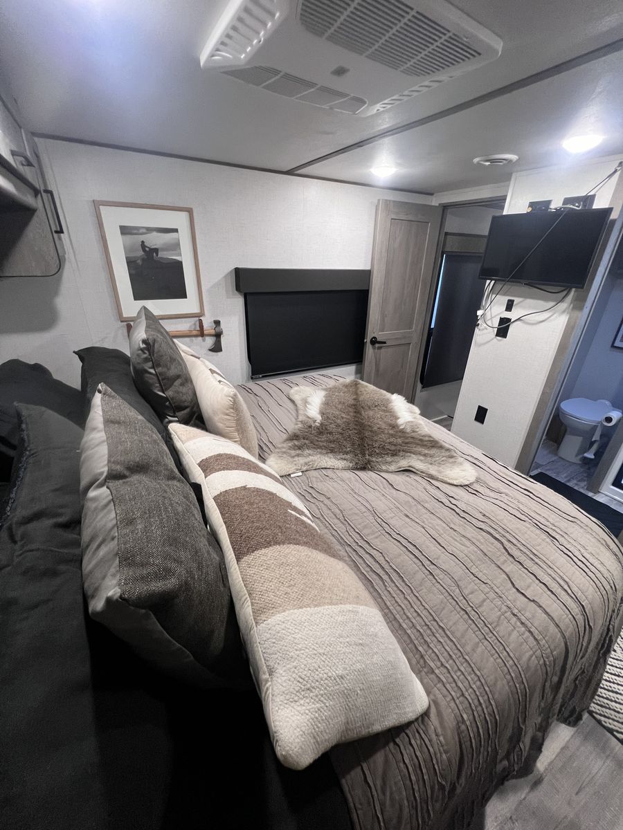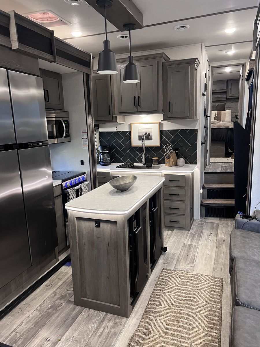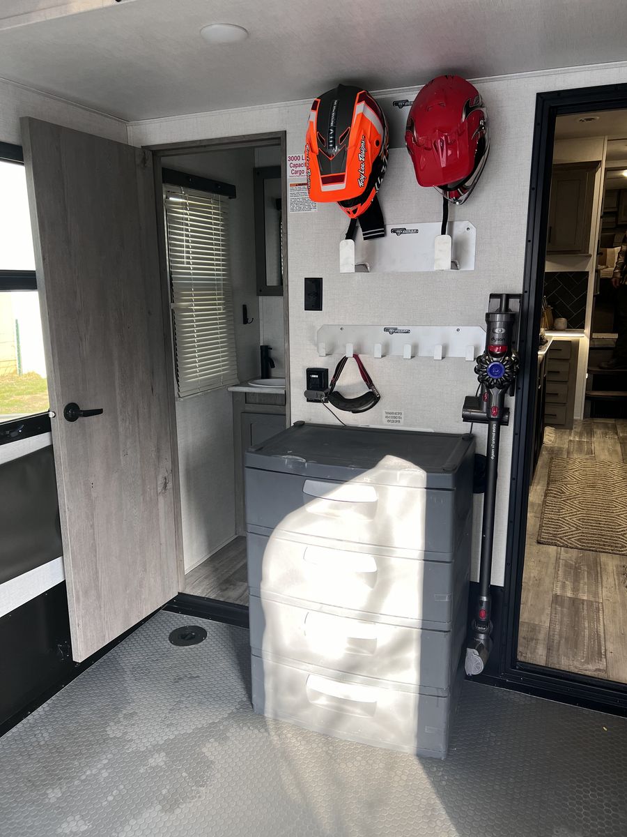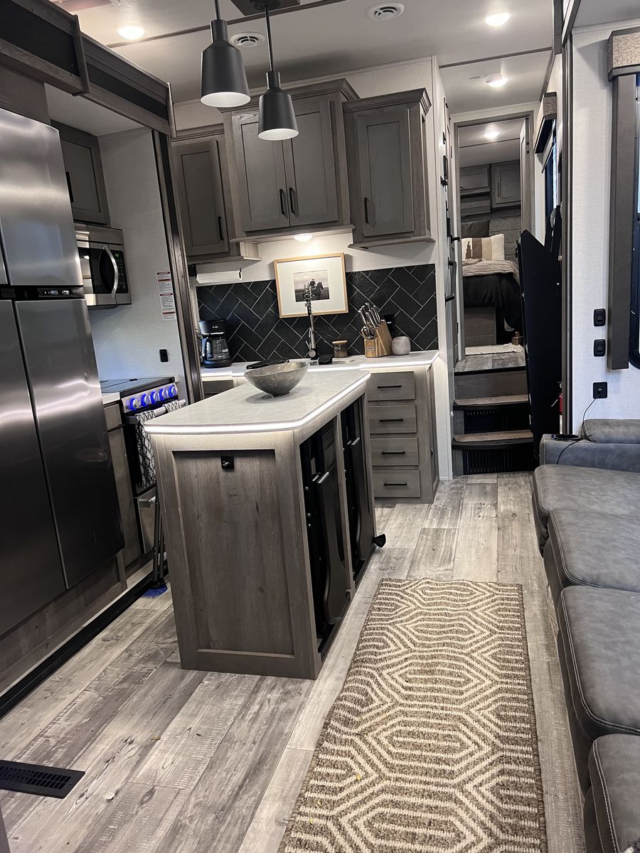 15 foot garage!! This toy hauler has been an awesome unit and we have maintained it very well. Everything works great with no issues and comes with every option for the year. Easily fit any 4 seat sxs with dirt bike in the garage. This trailer tows smooth down the highway. Also included is an Anderson hitch rated at 24,000 lbs. Some options include: *100 gal fresh water *Tankless water heater *Electric fire place with heat *3 TV’s *King size master bed with under storage *massage sofa with heat *LED interior lighting throughout *Glass storm doors in garage (removable) *5,000 watt onboard generator \