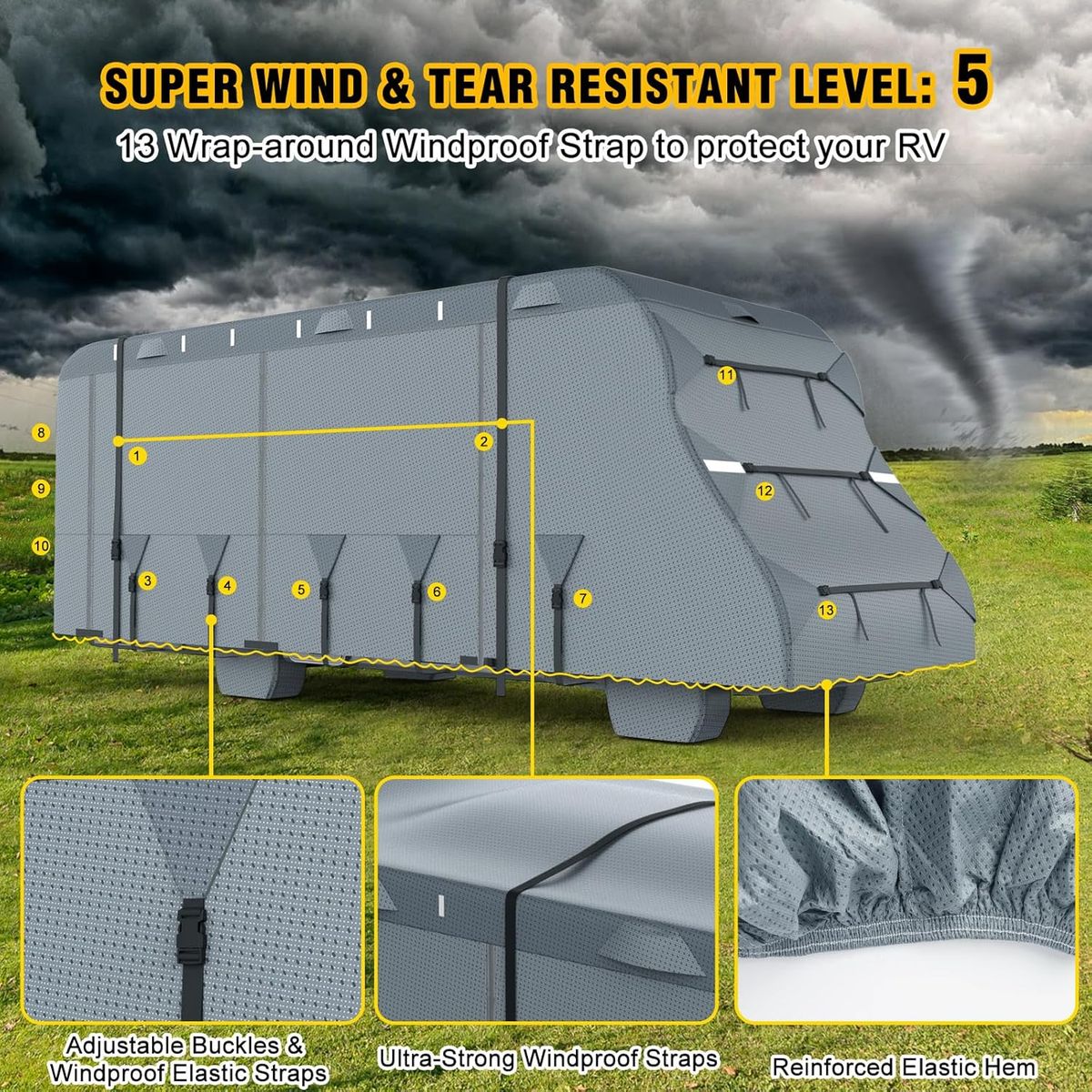 WINDPROOF & WATERPROOF: DenForste RV cover features extra-long Windproof reinforced straps, front/back straps, and side buckle straps for strong wind resistance and adhesion, preventing it from being blown away or torn. And with super waterproof features, it has passed the 3000mm waterproof test.