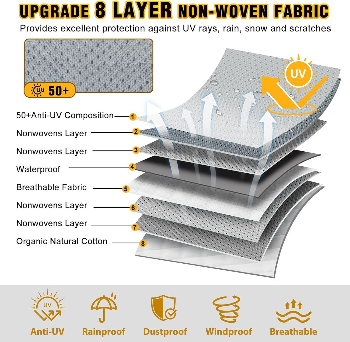 PREMIUM MATERIAL: Class C RV covers are designed with a 8-layer thick non-woven fabric for a sturdy construction that provides protection from bird droppings, snow, dirt, dust, scratches, and harmful UV rays. DenForste blocks 98.5% of UV-A and 99.8% of UV-B rays which can cause significant damage to your RV. Reinforced edges and corners further increase the tear-resistance of the cover.