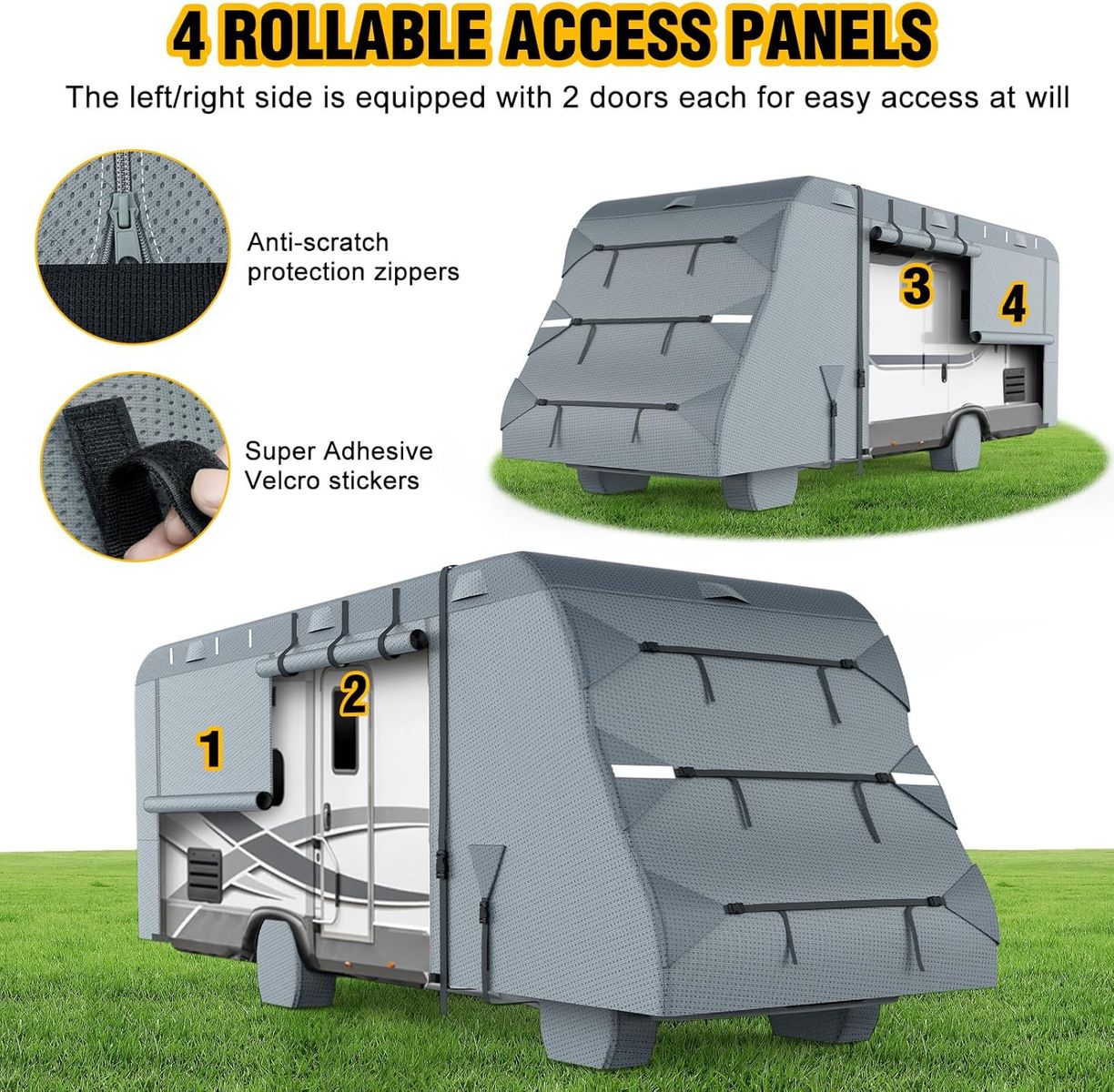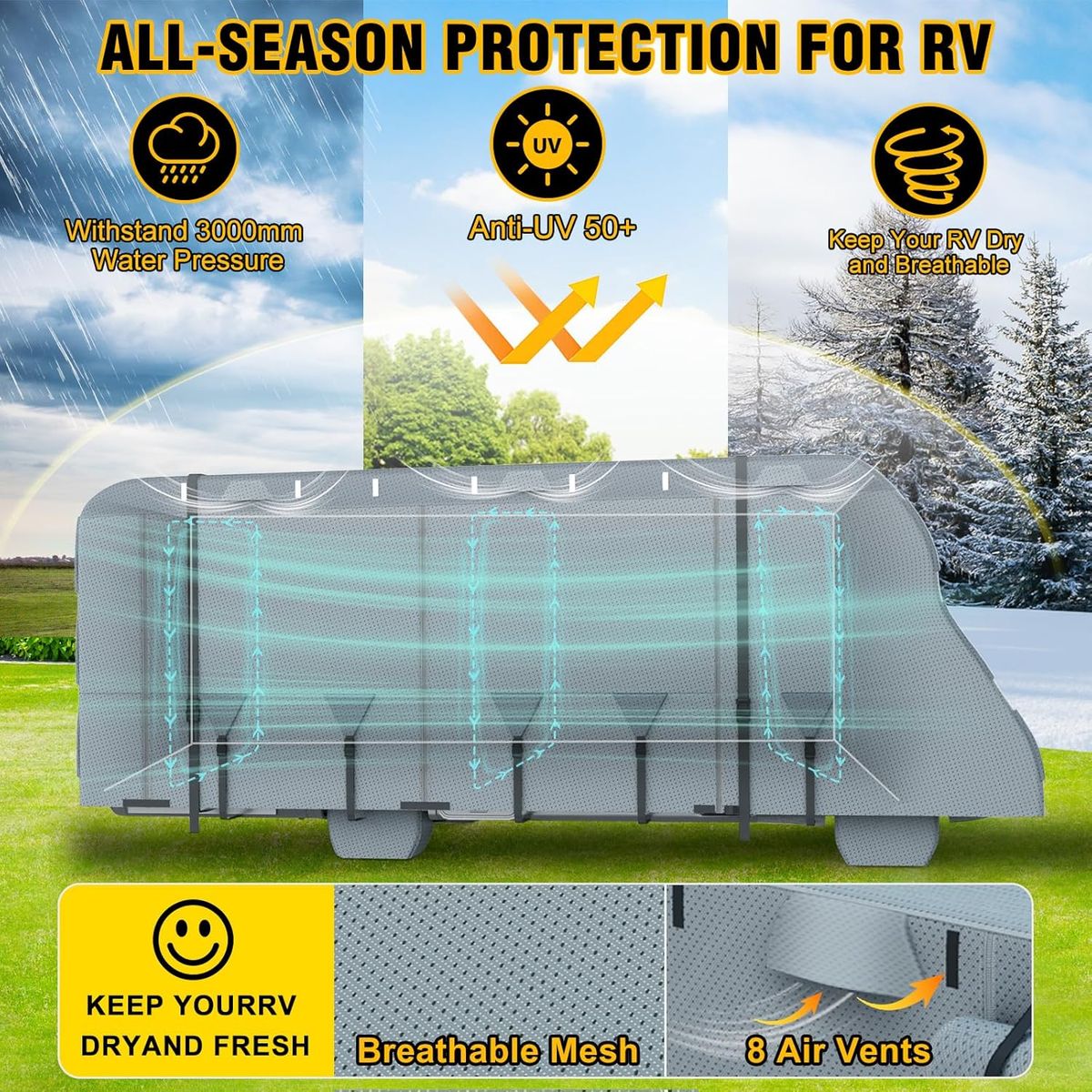 VENTILATION: The total of 8 air vents could effectively reduce the wind pressure and discharge the internal moisture, keeping your RV dry and safe whether it’s rain or snowstorm. And with 4 reflective strips on the front and back, which can prevent collisions at night. Features the roll-up zipper door allows for convenient access to the RV.
