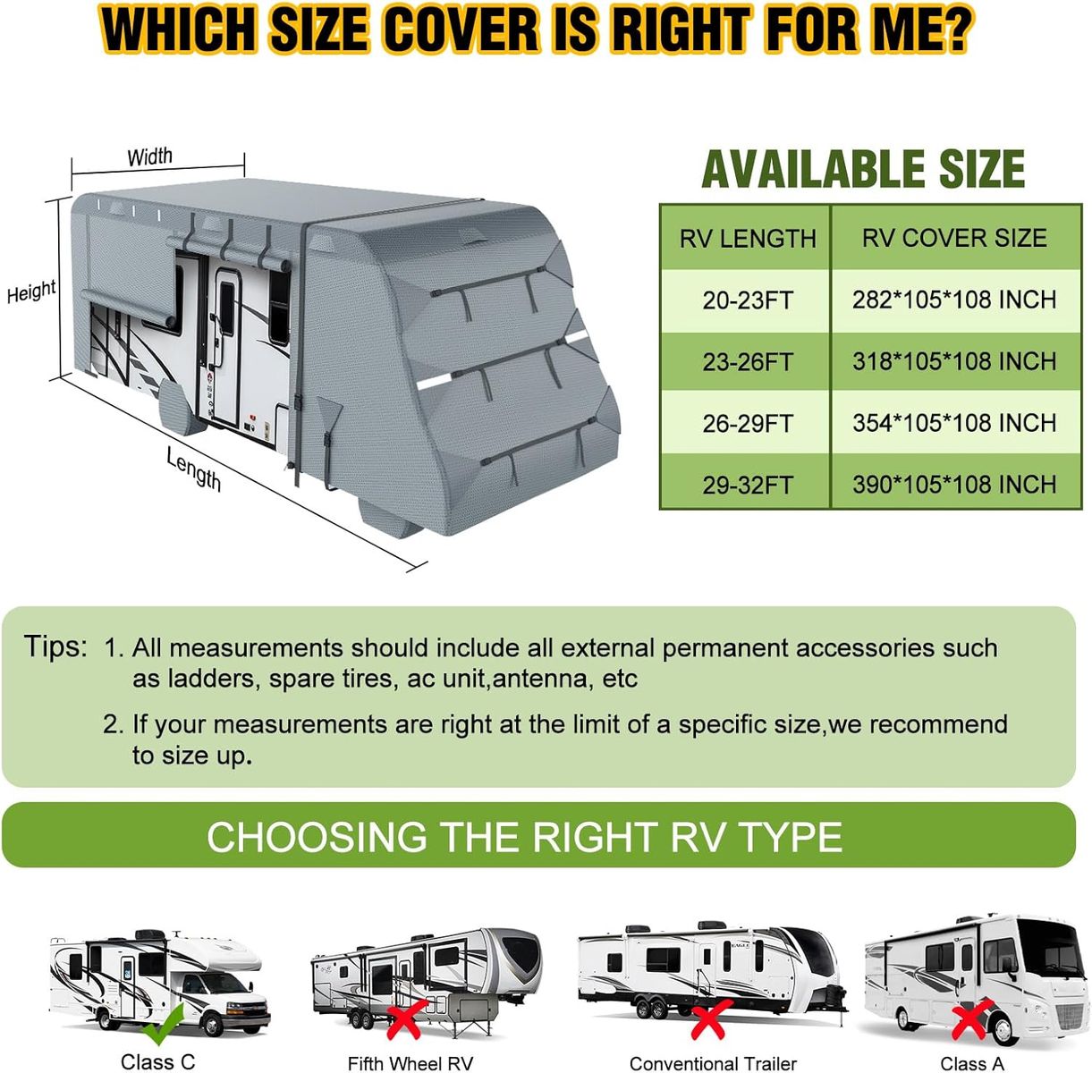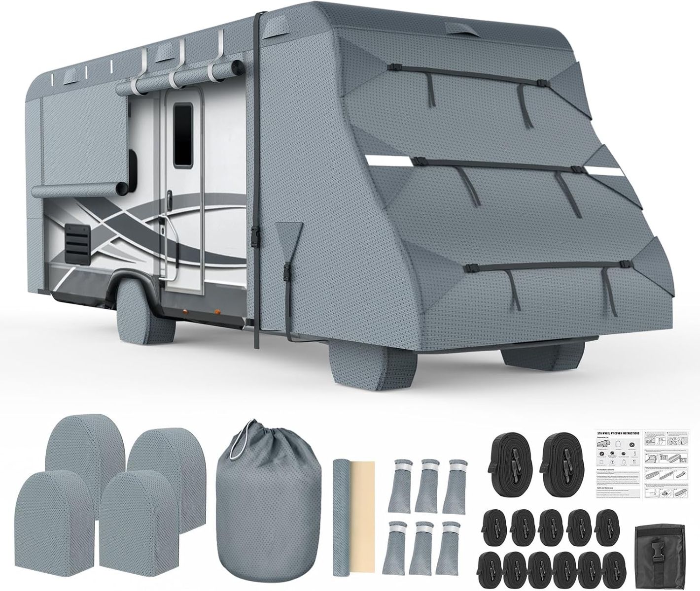 WHAT YOU GET: Included 1rv cover fits 20-23 ft Class C RV Cover, 1user manual, 2reinforced straps, 4tire covers, 6front/back straps, 5side buckle straps, 1adhesive repair patche, 1toss bag, 1storage bag, 6gutter covers with sponge design for sharp areas of your RV.