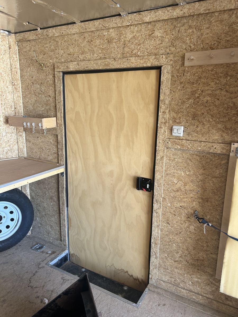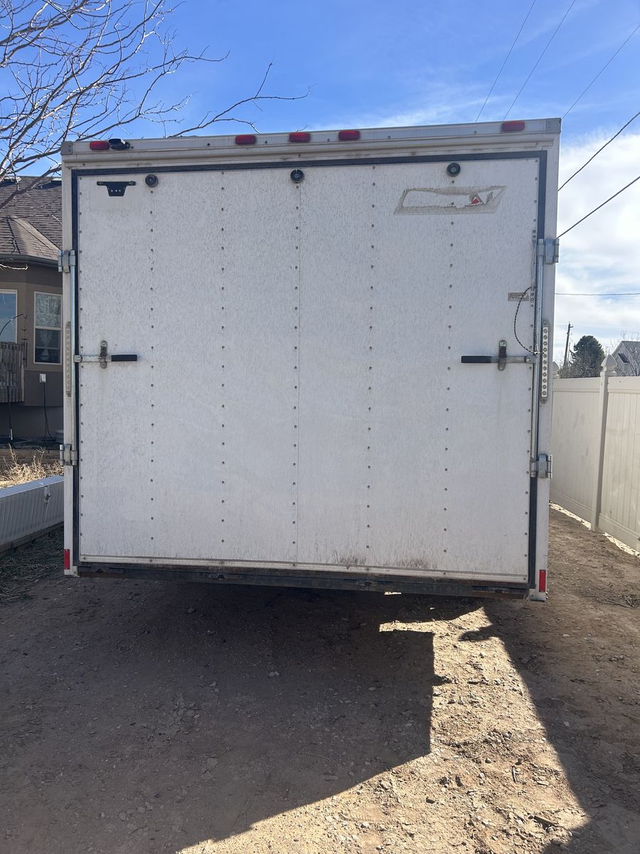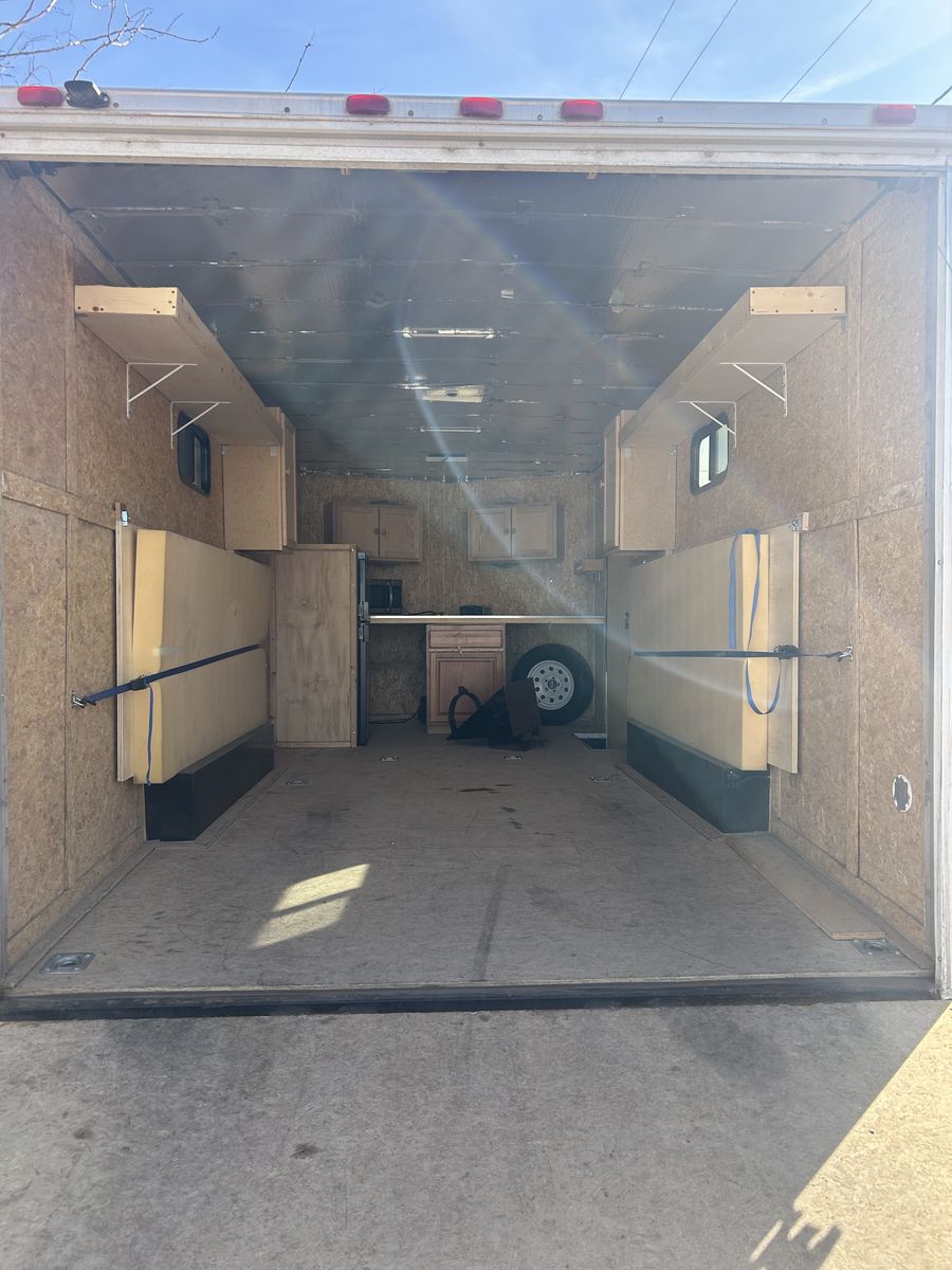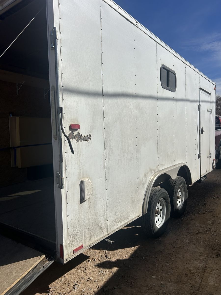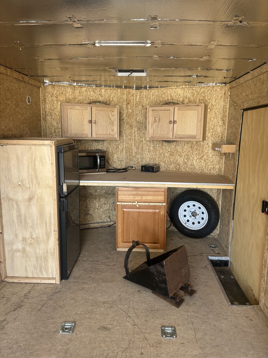 Venmo18' enclosed trailer, with insulated installed, has a new fridge/freezer installed; an axle flip on it, so it's 4 or 5" taller than it was. Has a bracket for a propane tank in the front. Two fold down beds with microwave and cabinets. Title in hand OBO.