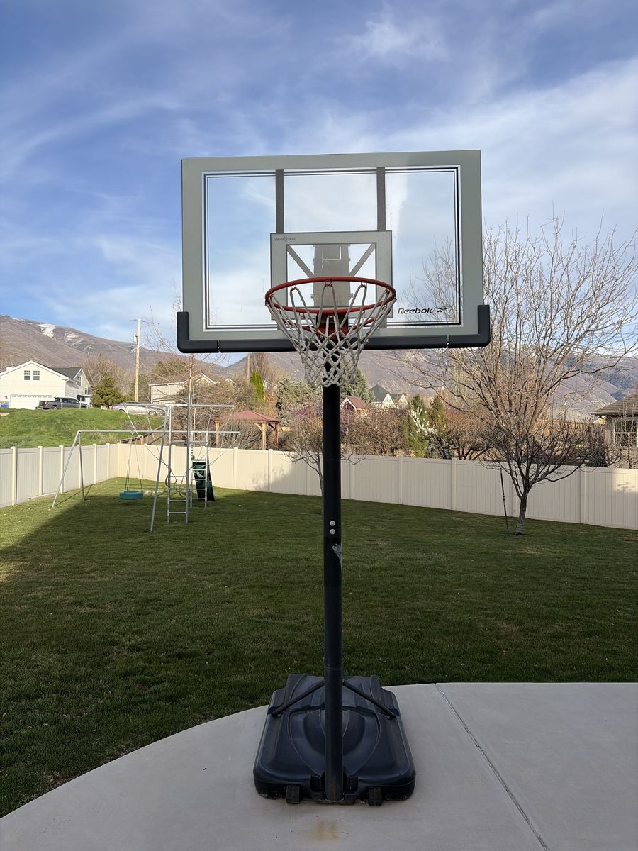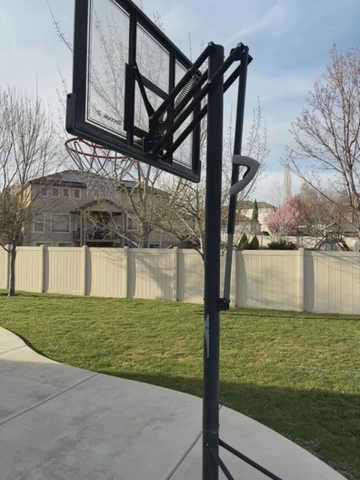 VenmoGreat basketball standard. The base has wheels for easy repositioning.