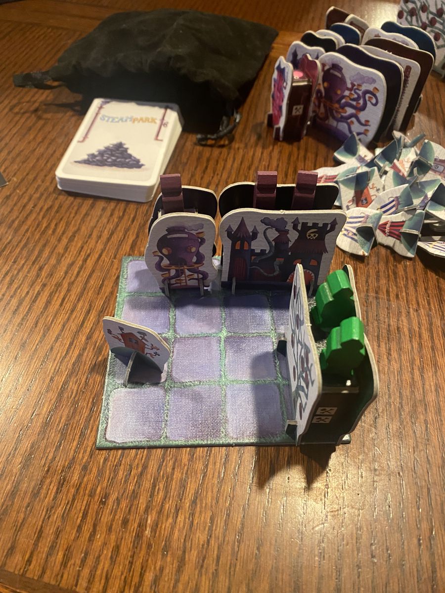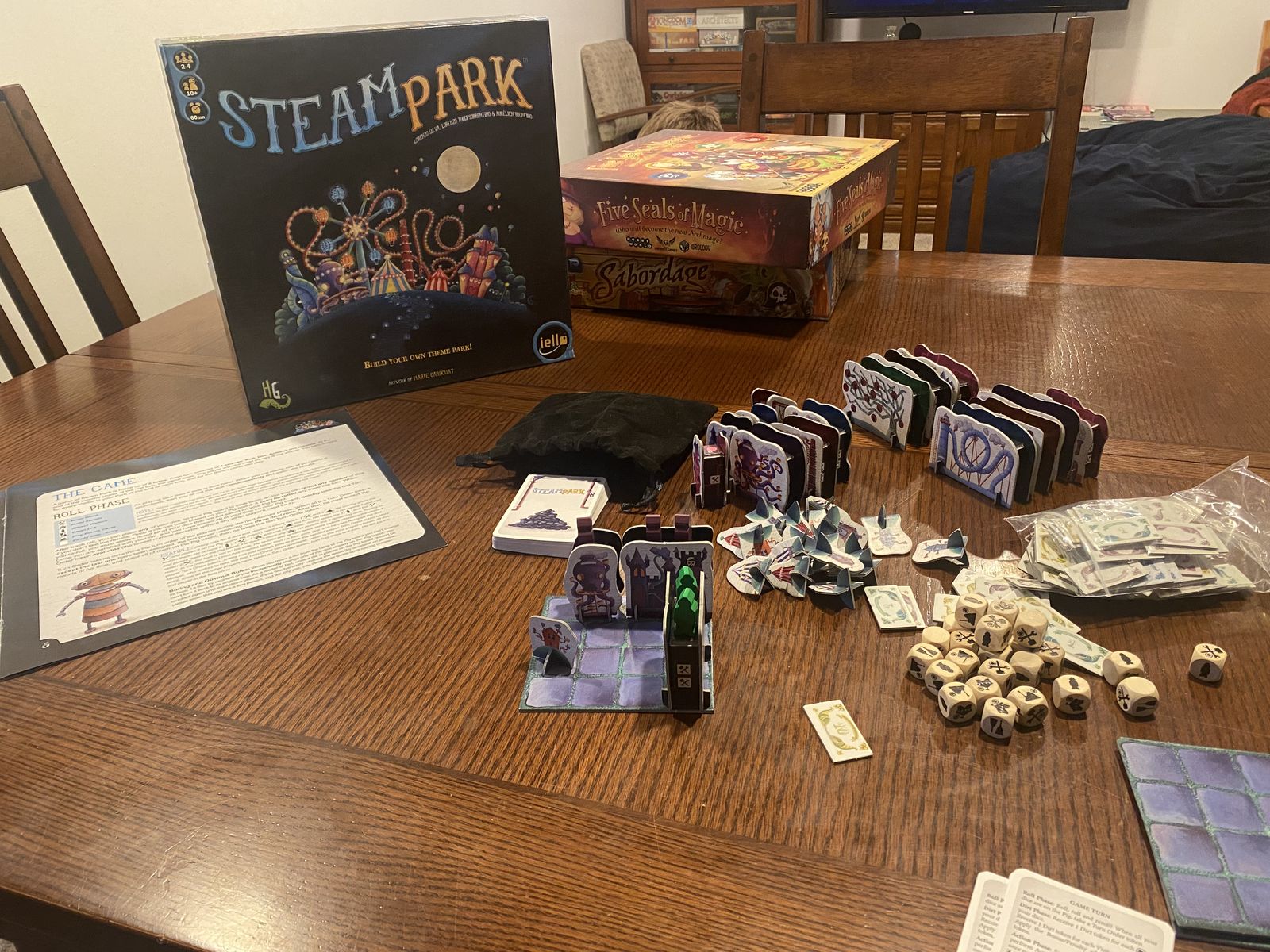 Steam Park is an easy-to-learn game with two difficulty levels: one for the less experienced gamers and a more strategic one for those who want a more exciting challenge. In this management game, you'll have to build your own amusement park and make it the largest and most profitable in the region. By constructing the three-dimensional, wonderful rides designed by Marie Cardouat, you will see your park grow right before your eyes. Choose your strategy! Build Stands to attract more Visitors, or Toilets to keep the Dirt under control. Whatever decision you take, take it quickly: The less time you spend planning, the more time you'll have to maintain your park. Thanks to a clever, original action-choosing mechanism, winning in Steam Park is as much a matter of being the best as of being the fastest!