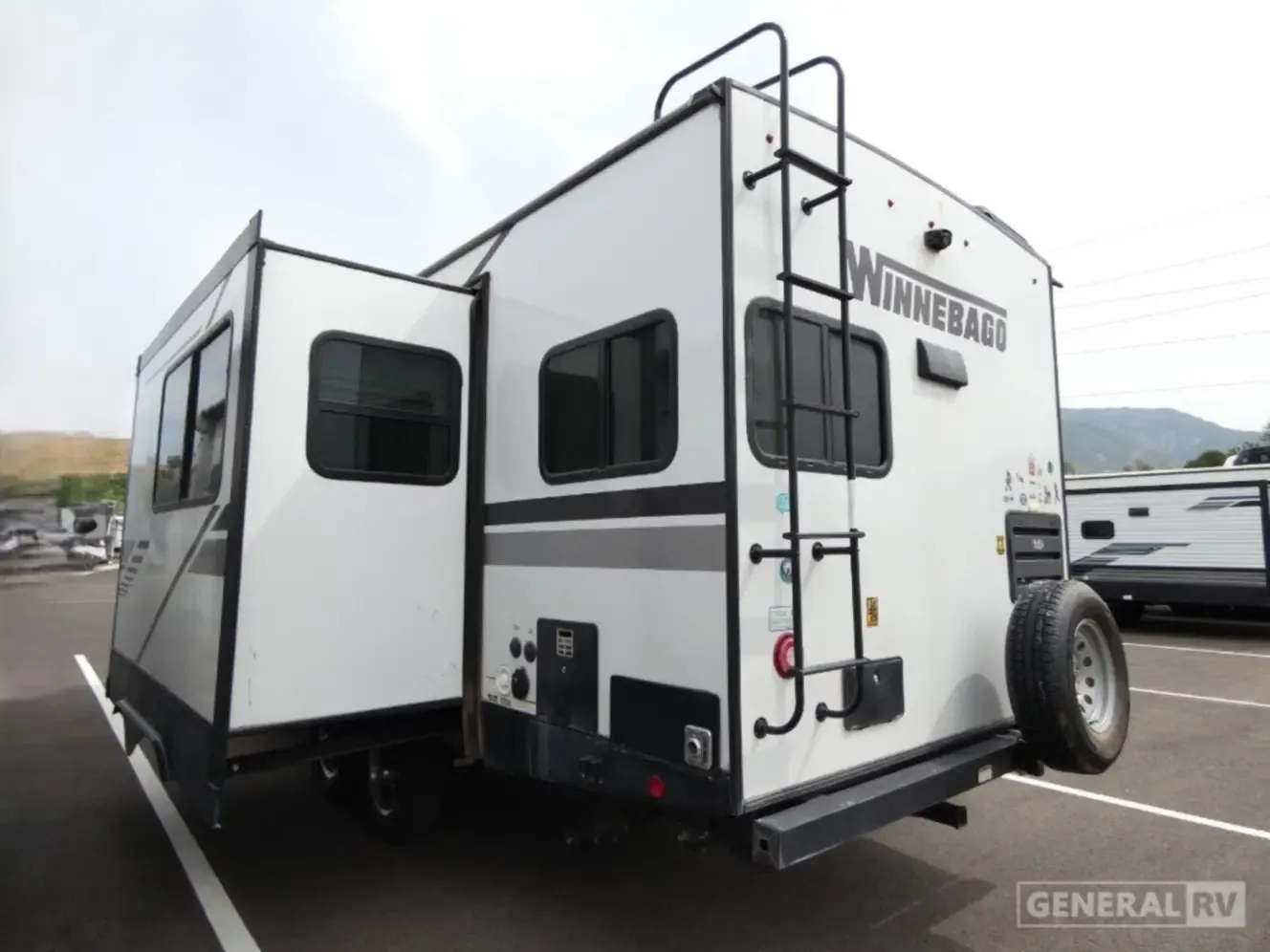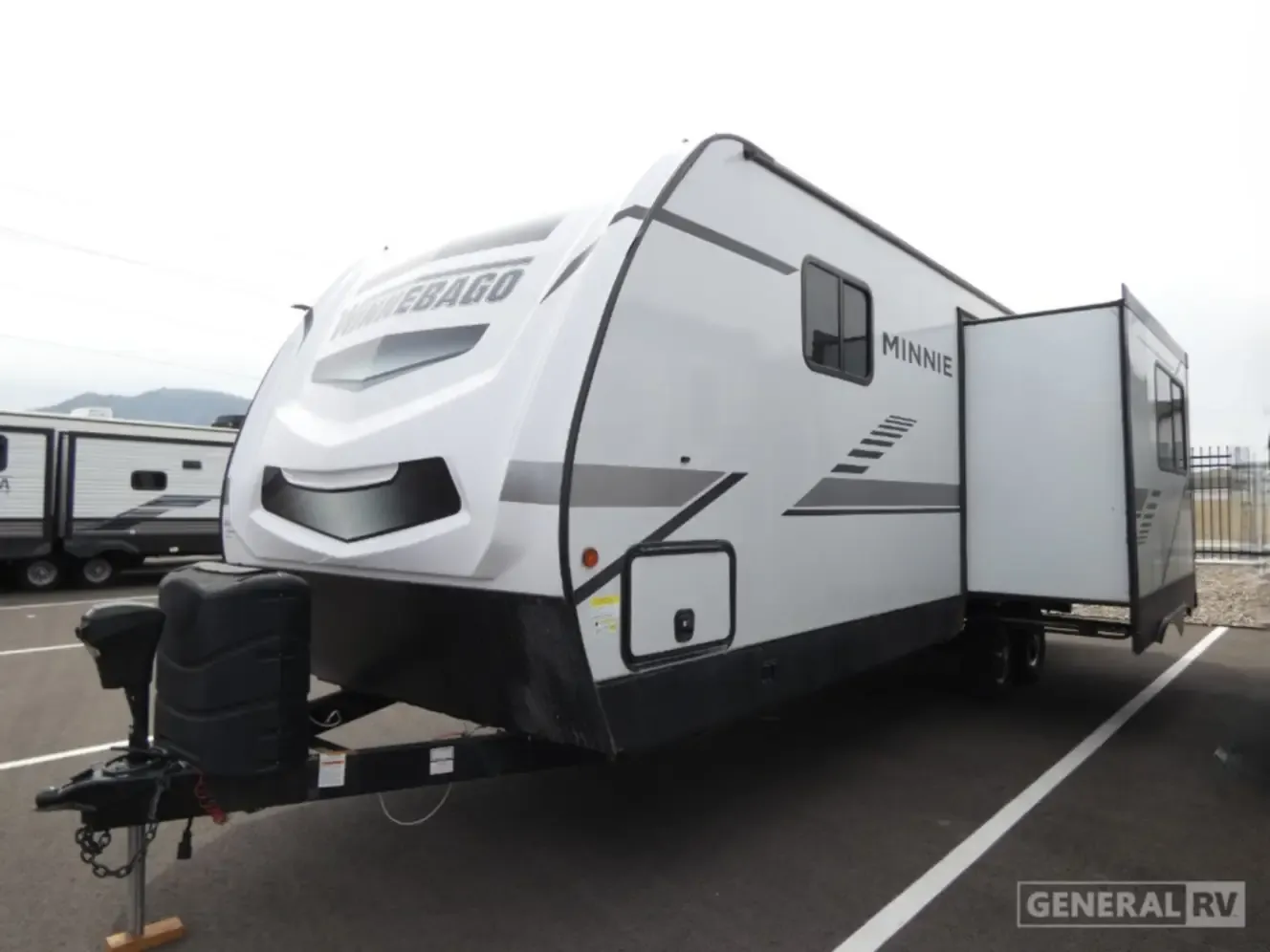 The 2021 Winnebago Minnie 2529RG is a 28'7" rear-kitchen travel trailer sleeping 3-4, featuring a 5,948-lb dry weight, 648-lb hitch weight, and 8,800-lb GVWR. It offers a 10.3 cu. ft. 12V refrigerator, 30,000 BTU furnace, and a queen bed. Highlights include dual entry doors, a slide-out, and electric stabilizer jacks.