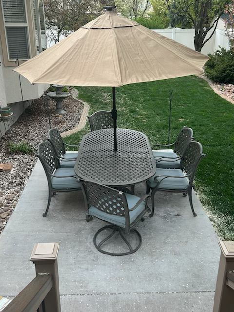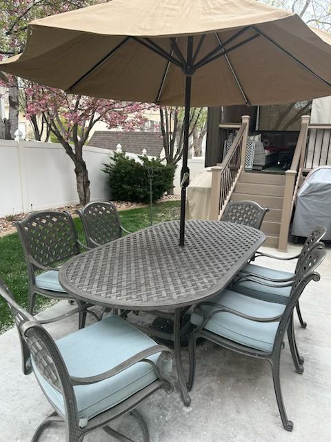 Patio Table set for 6, 6 cushions, lighted umbriella solar rechargeable,other photos to follow only used it twice This is from RC Willeys paid 2,400.00 2 years ago