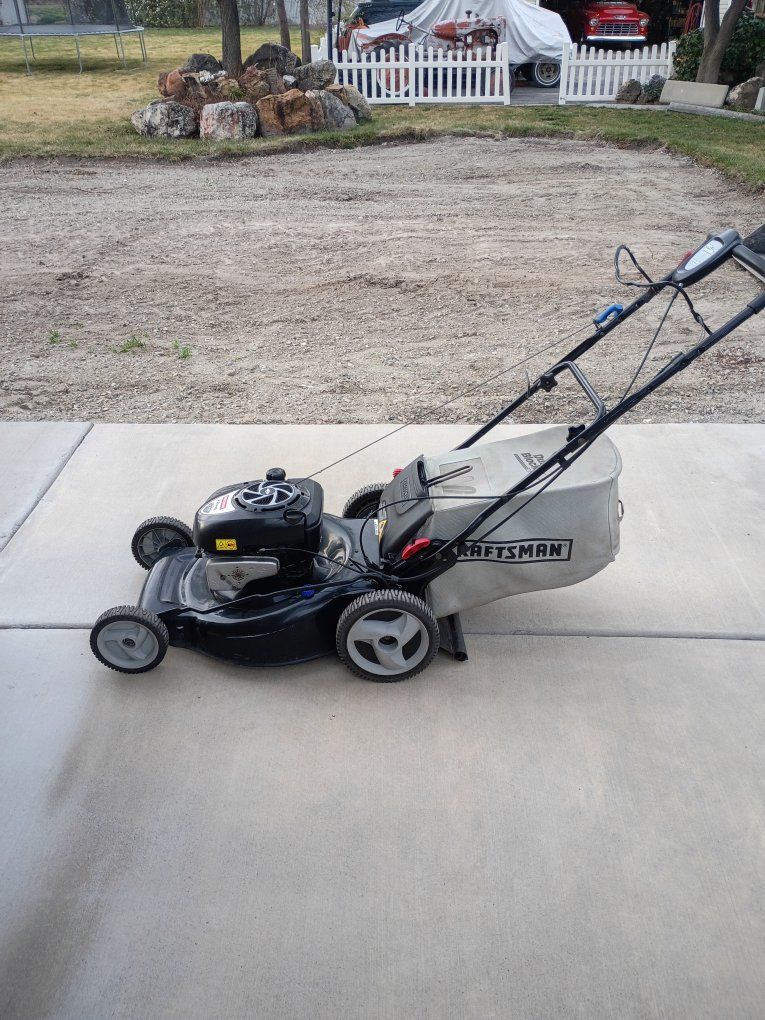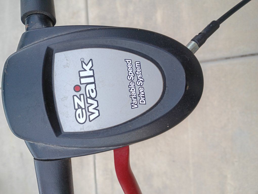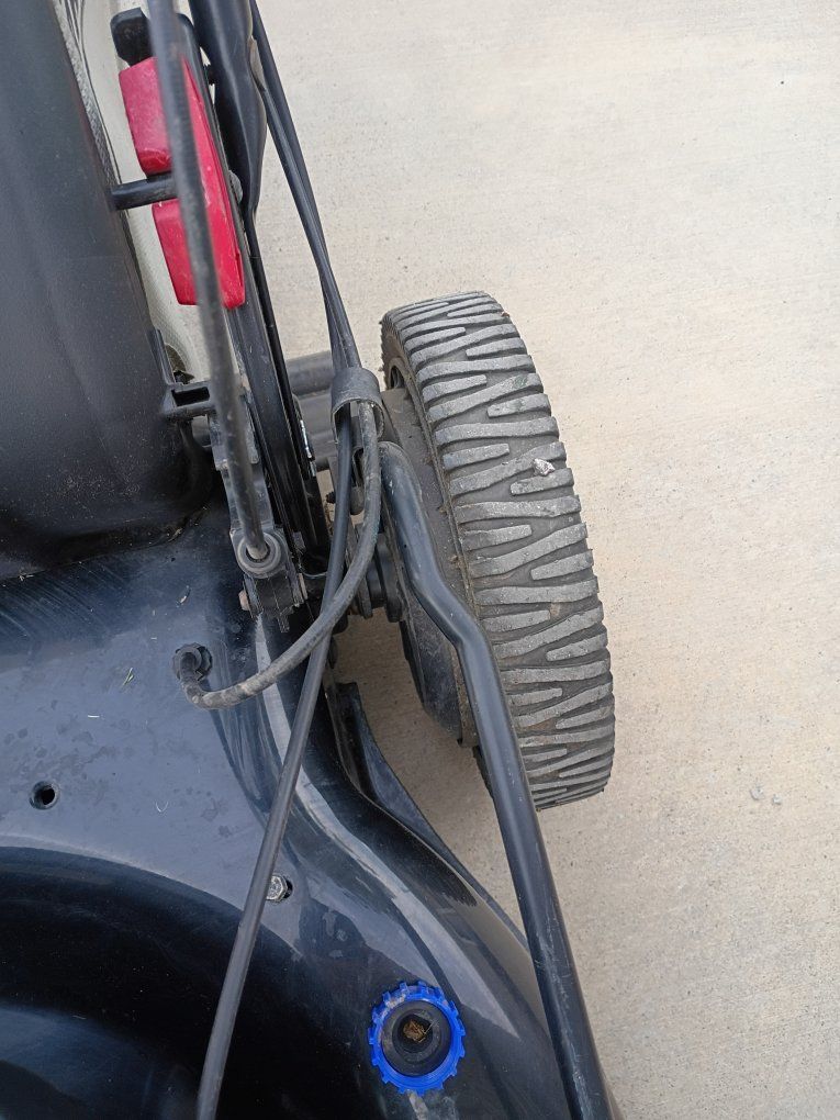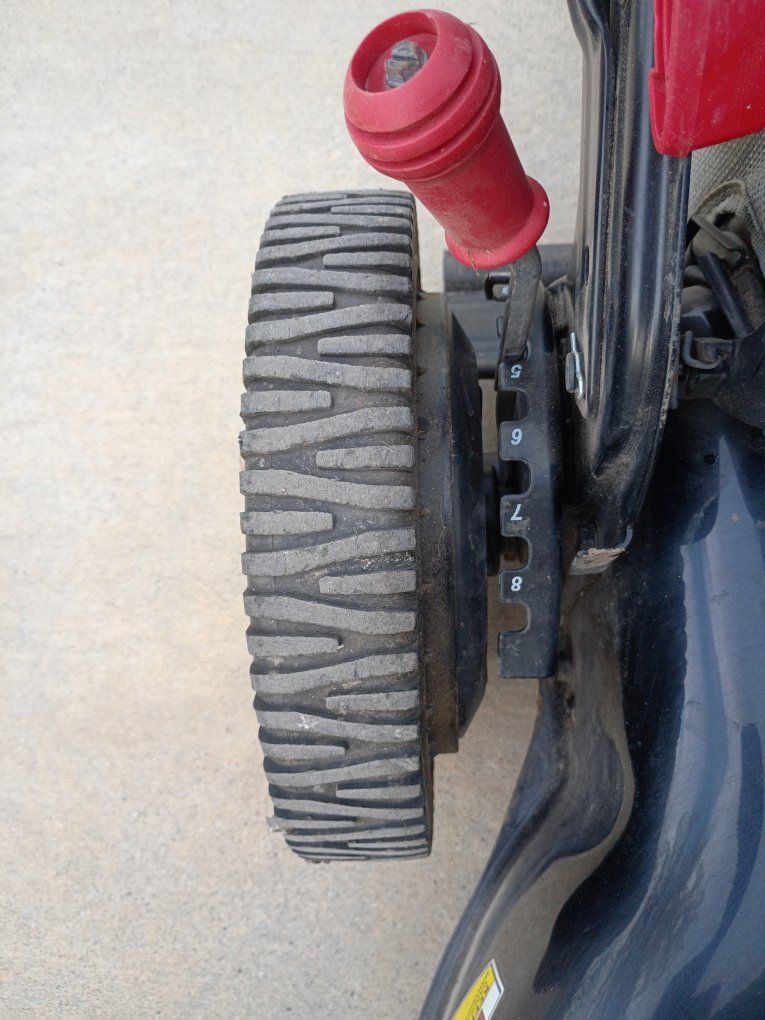 Venmo7 horsepower engine. starts first pull. one handle adjusts the height of all four wheels. the tires don't show hardly any wear. it has the easy walk system so the harder you pull back the faster it goes but it we'll also go very slow rear drive system with the bigger Wheels on the back I believe it is a 22 inch blade. it measures 23 and 1/2 in outside of the cutting area. great mower!