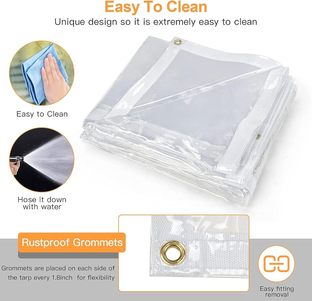 EASY TO INSTALL: The edges of our outdoor Vinyl clear cover is equipped with grommets, which are convenient for you to install and disassemble, and can also firmly fix the clear trap. This windproof trap curtain is also easy to clean, you only need to wash it with water and dry it.