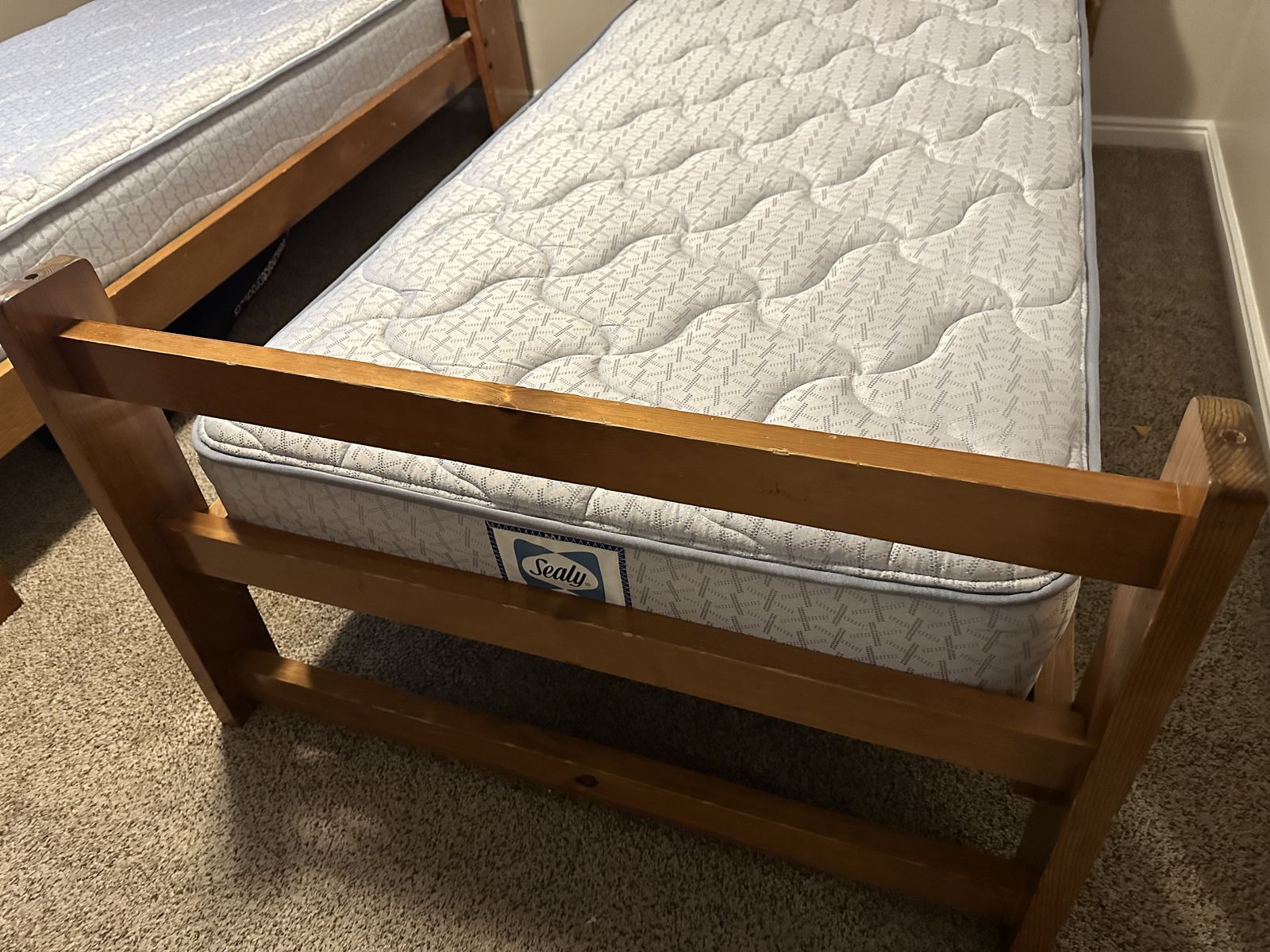 VenmoGreat condition. Solid wood. Mattresses are clean with no stains! These can be separate or you can connect them into bunkbeds. There are some scratches.