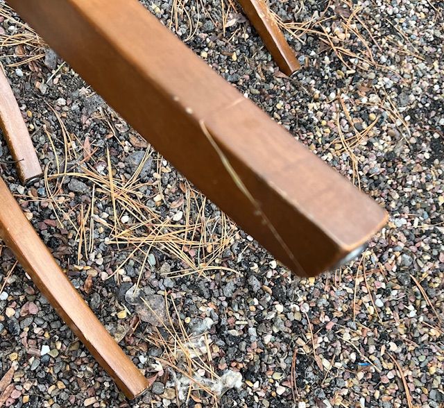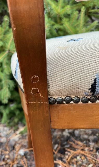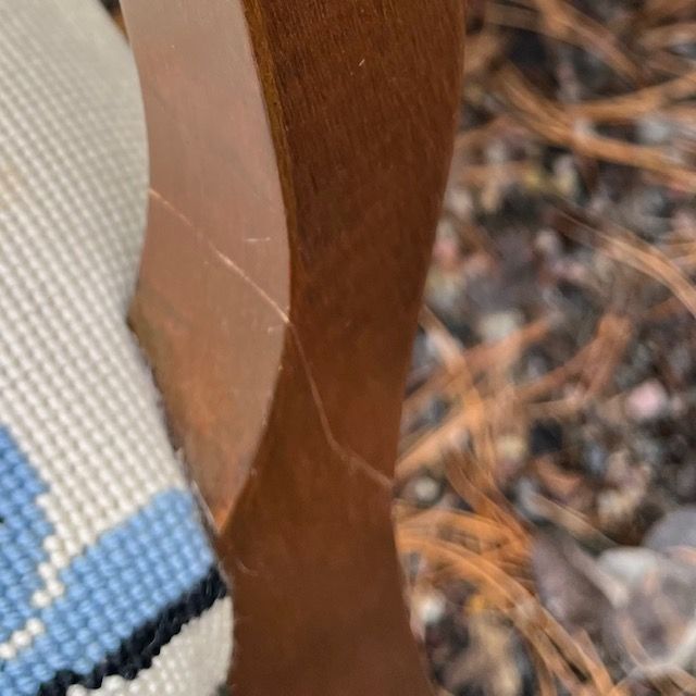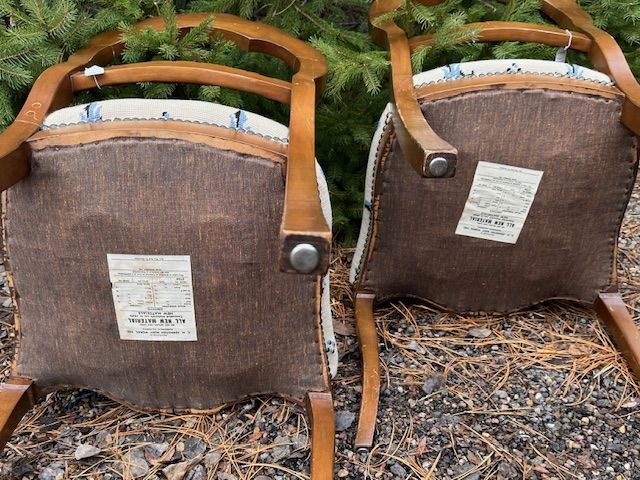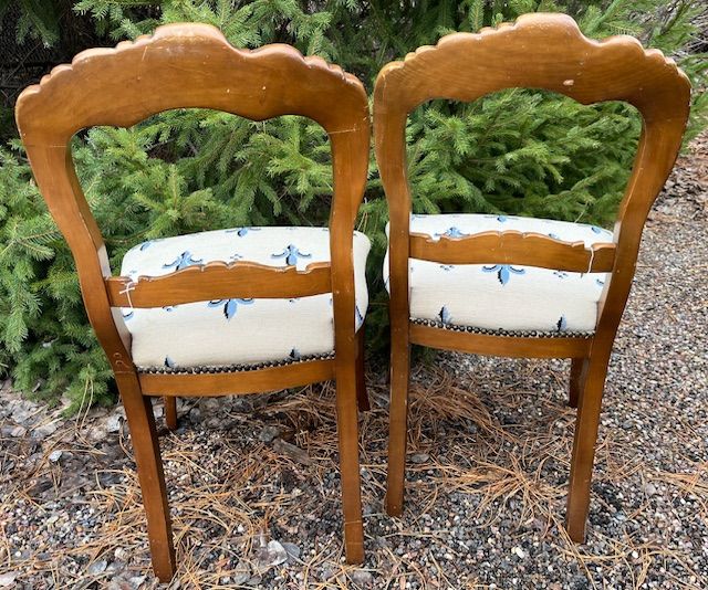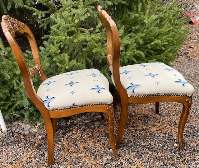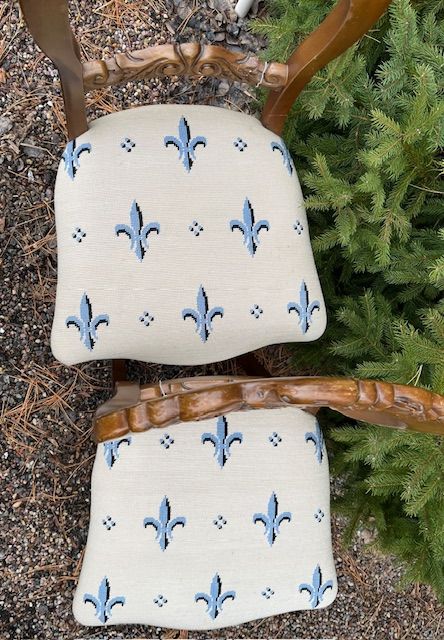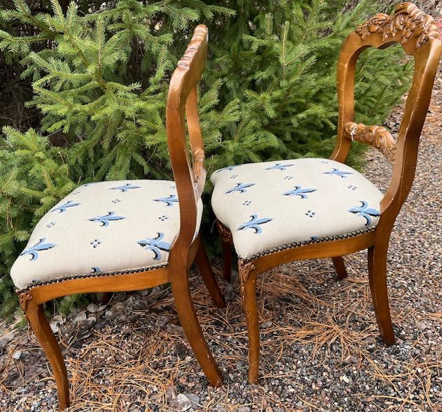 VenmoThis is a lovely pair of vintage matching dining chairs a w/ blue fleur-de-lis embroidered pattern on the seat covers. One chair has had a minor repair to one of its legs.