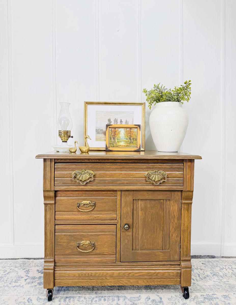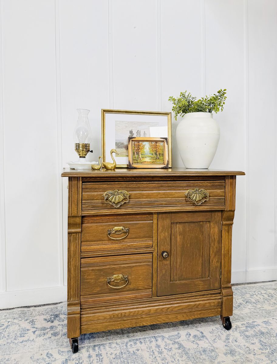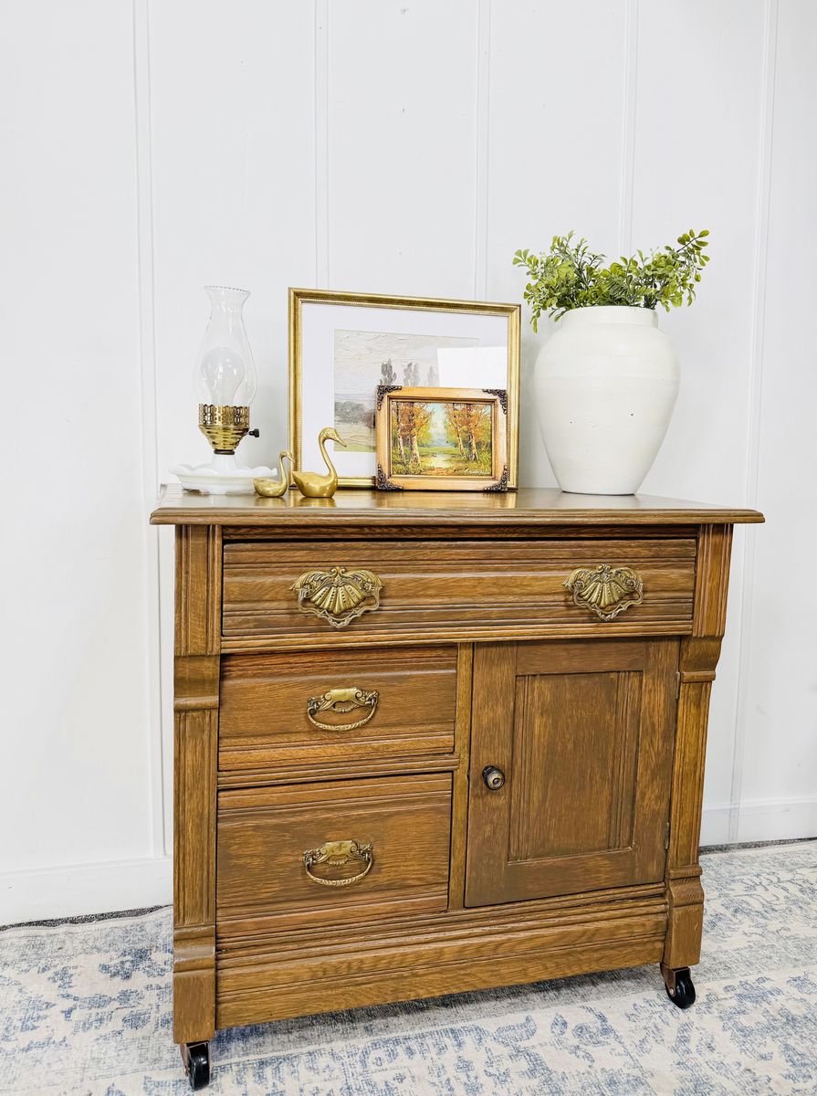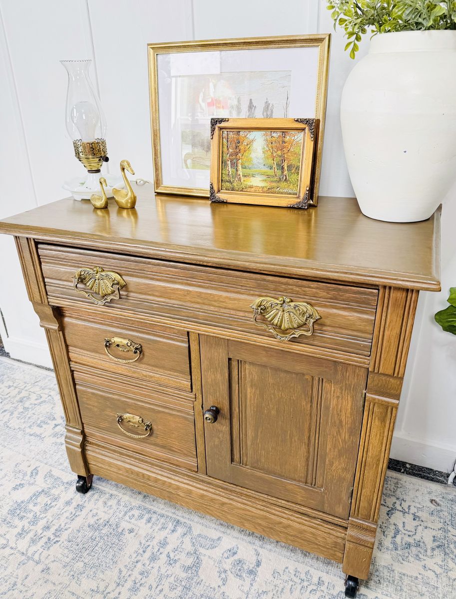 VenmoElevate your space with this exquisite vintage wash stand, crafted from solid wood and adorned with ornate brass hardware and delicate carved detailing. This piece is a true testament to craftsmanship—sturdy, functional, and brimming with old-world charm. Excellent vintage condition with minimal wear consistent with age. Clean, solid, and ready to enjoy.