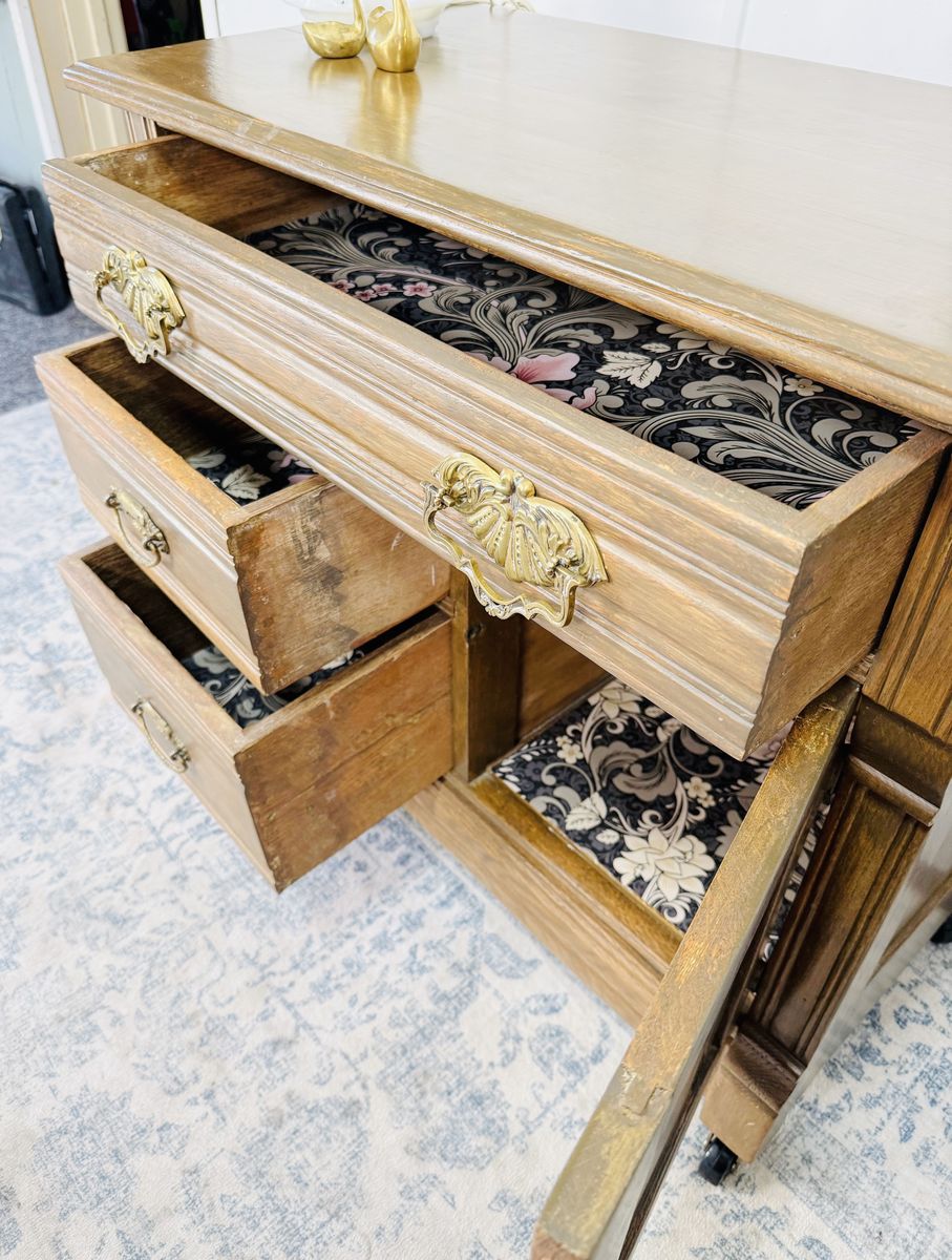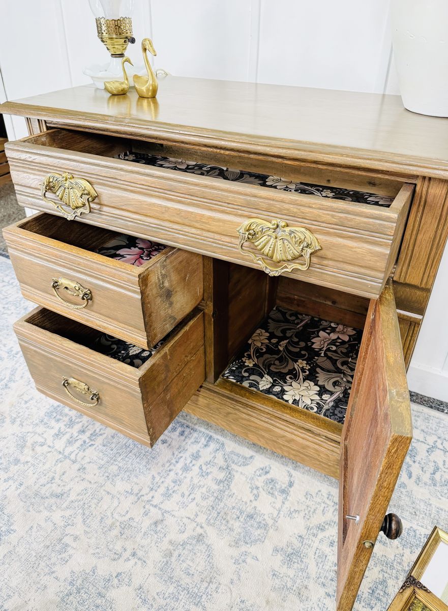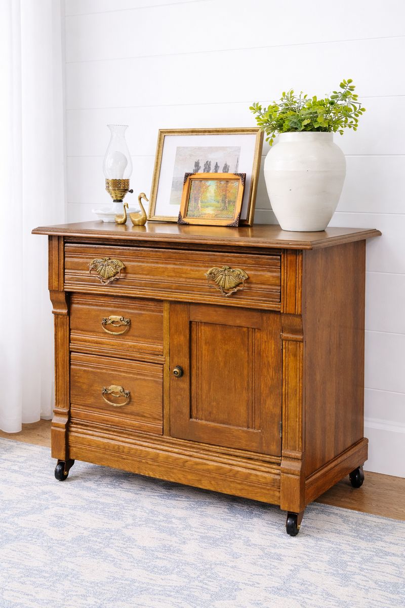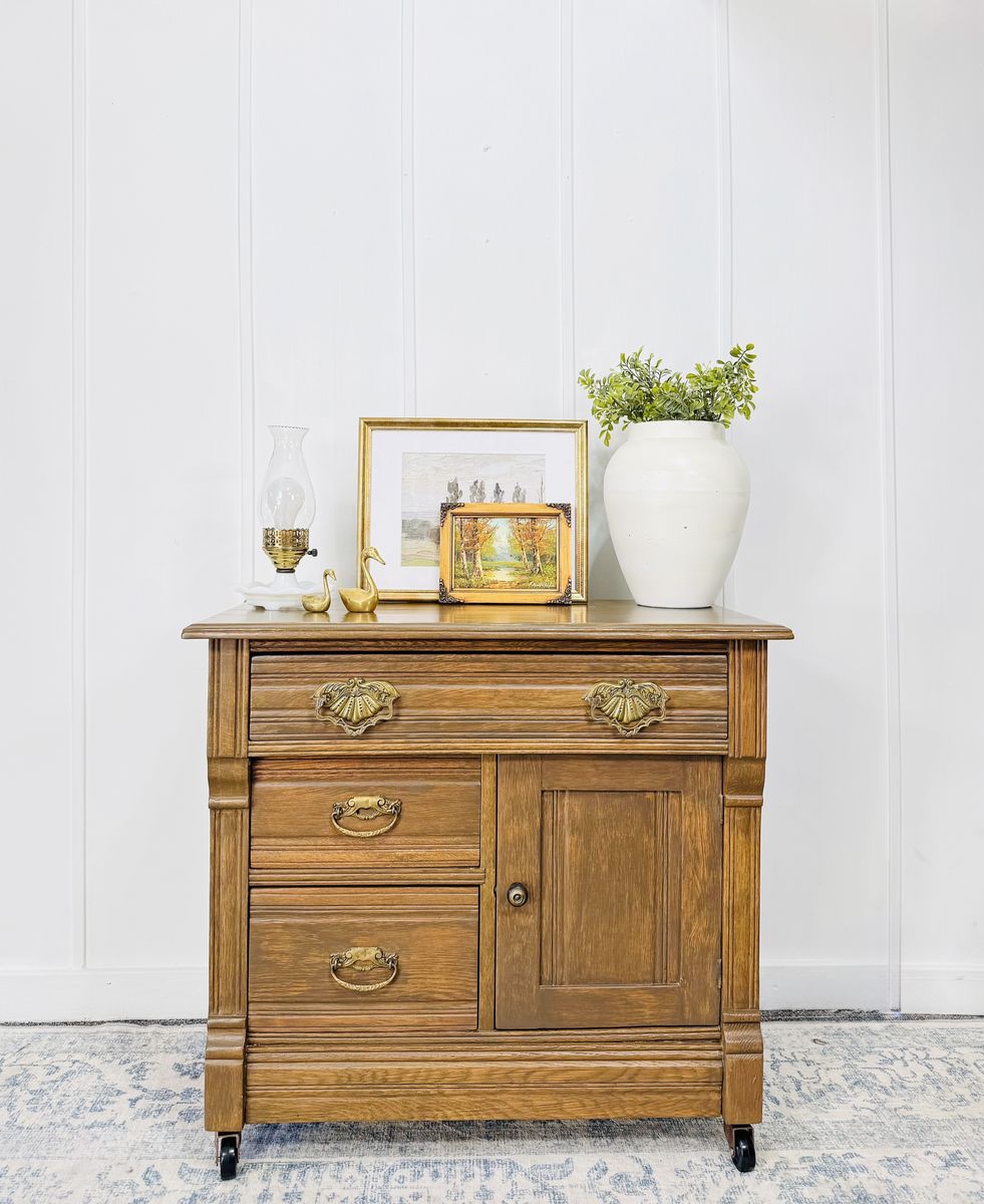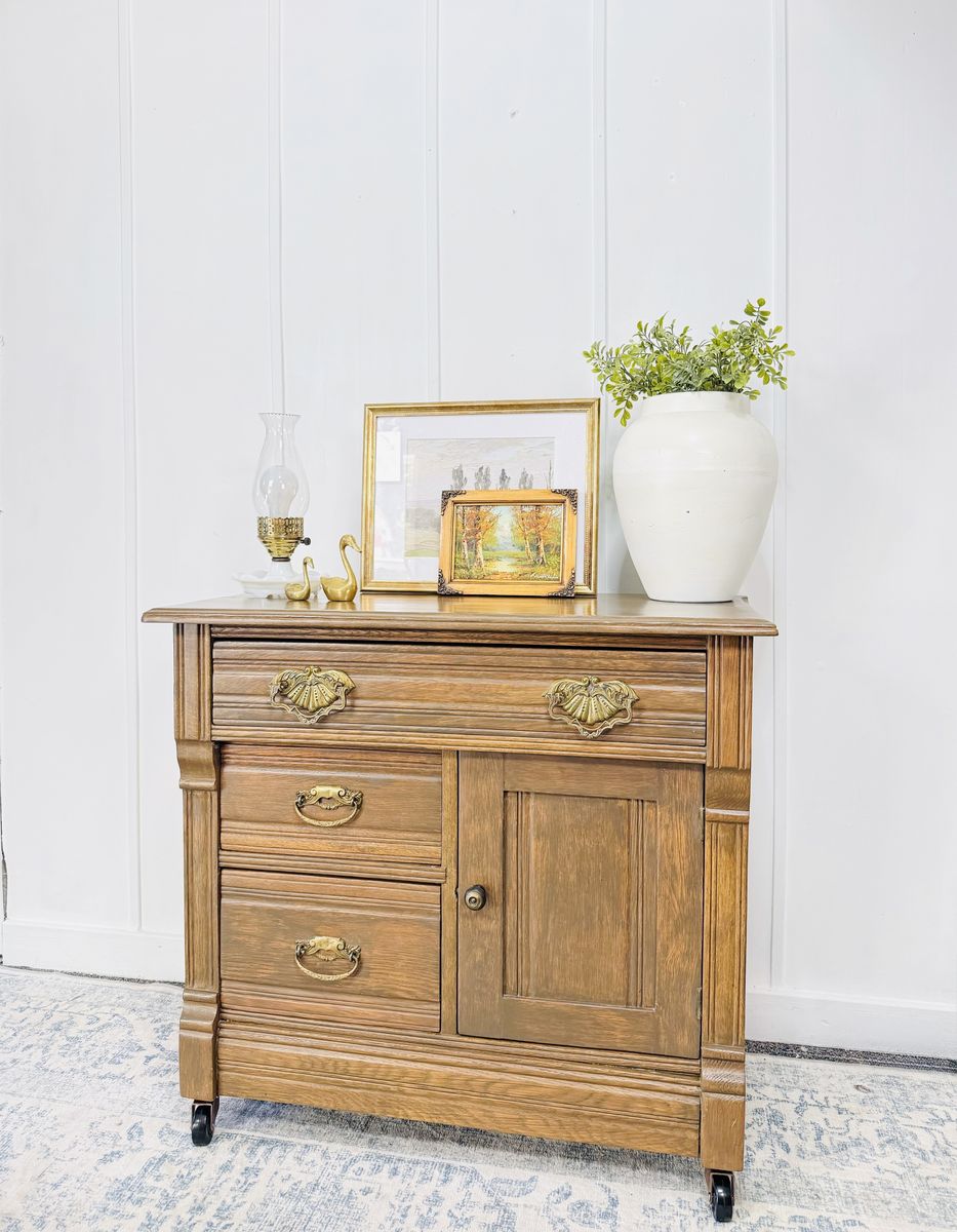 VenmoElevate your space with this exquisite vintage wash stand, crafted from solid wood and adorned with ornate brass hardware and delicate carved detailing. This piece is a true testament to craftsmanship—sturdy, functional, and brimming with old-world charm. Excellent vintage condition with minimal wear consistent with age. Clean, solid, and ready to enjoy.