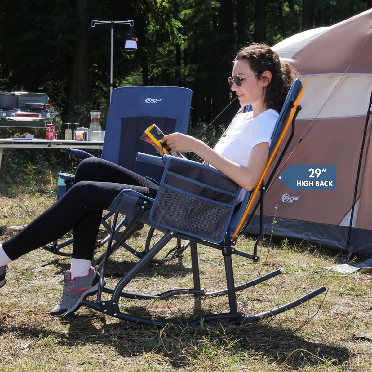 29" High Padded Back: This camping rocking chair has a 29" padded backrest which will provide full support to your shoulders and head. The padded back is specially designed to provide enough coziness for you to relax and chill. It also has pockets and a cup holder on the sides for your convenience