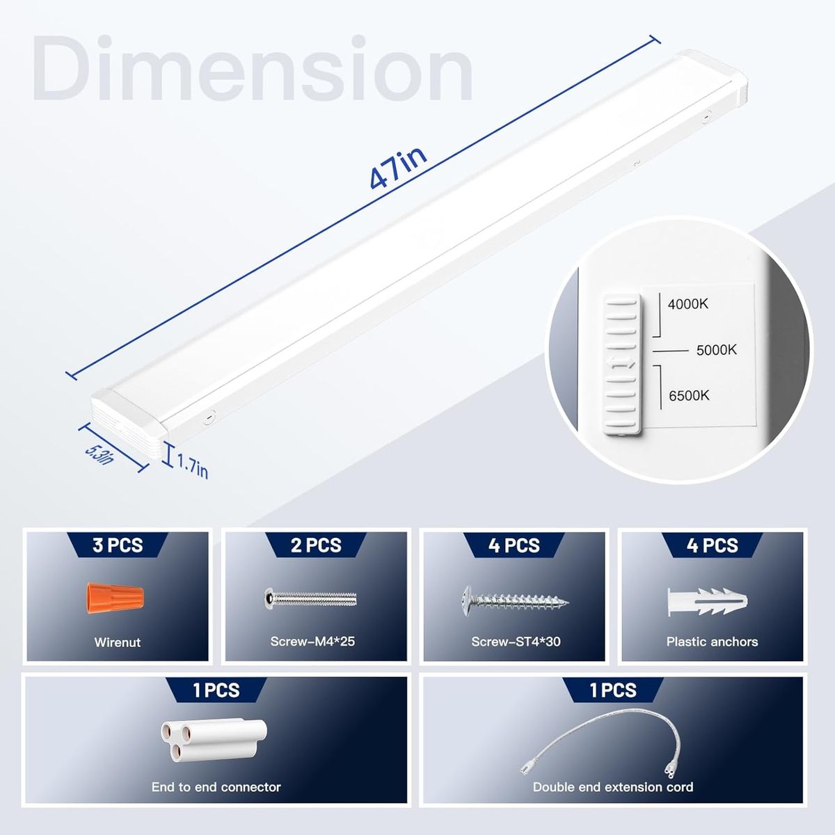 3CCT selectable: Our 4ft LED wraparound light fixture offers the option to choose between three different color temperatures - 4000K, 5000K, and 6500K. You can easily switch between these options before installing the fixture on your ceiling, allowing you to select the desired lighting ambiance from warm to cool daylight-like tones.
