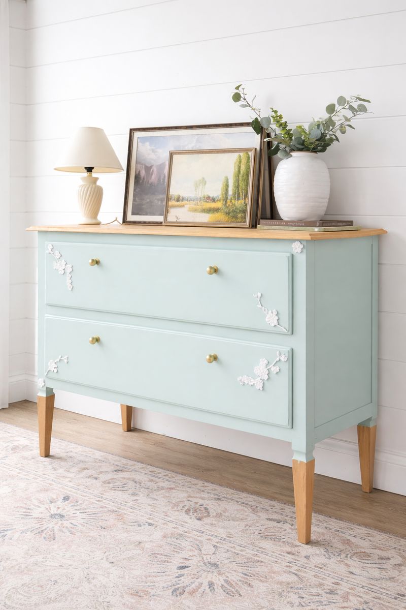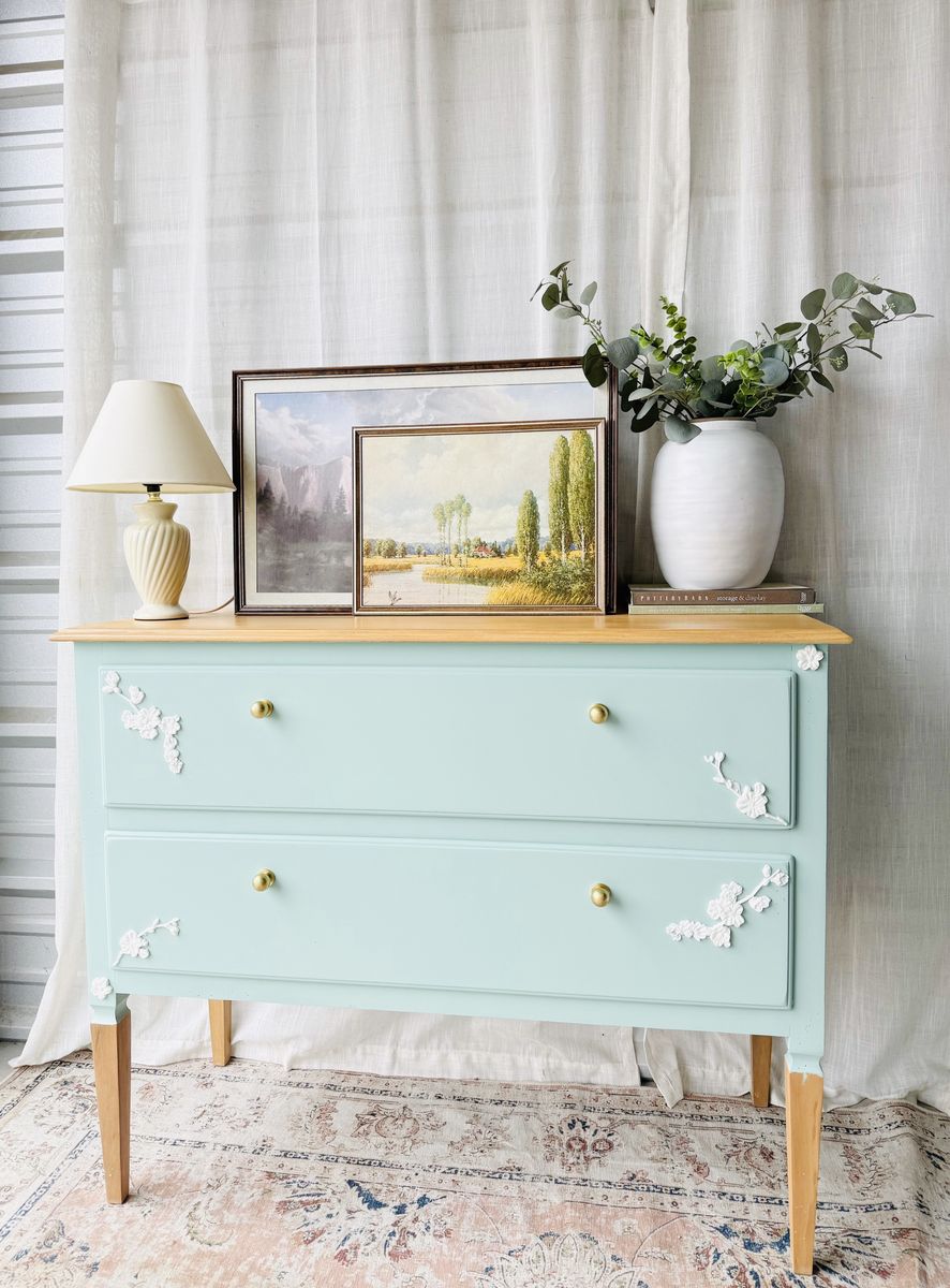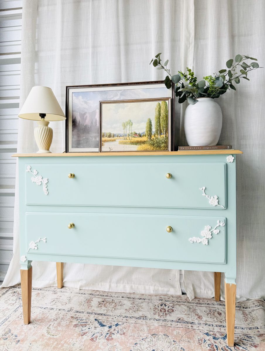 VenmoElevate your space with this stunning Drexel buffet console dresser, masterfully refinished in a serene light blue-green hue that evokes the tranquil beauty of coastal waters. Crafted from solid wood and built to last, this piece features two spacious drawers adorned with delicate white floral appliqués and gleaming gold knobs — a graceful nod to vintage charm. Could be used as a buffet, console or dresser.