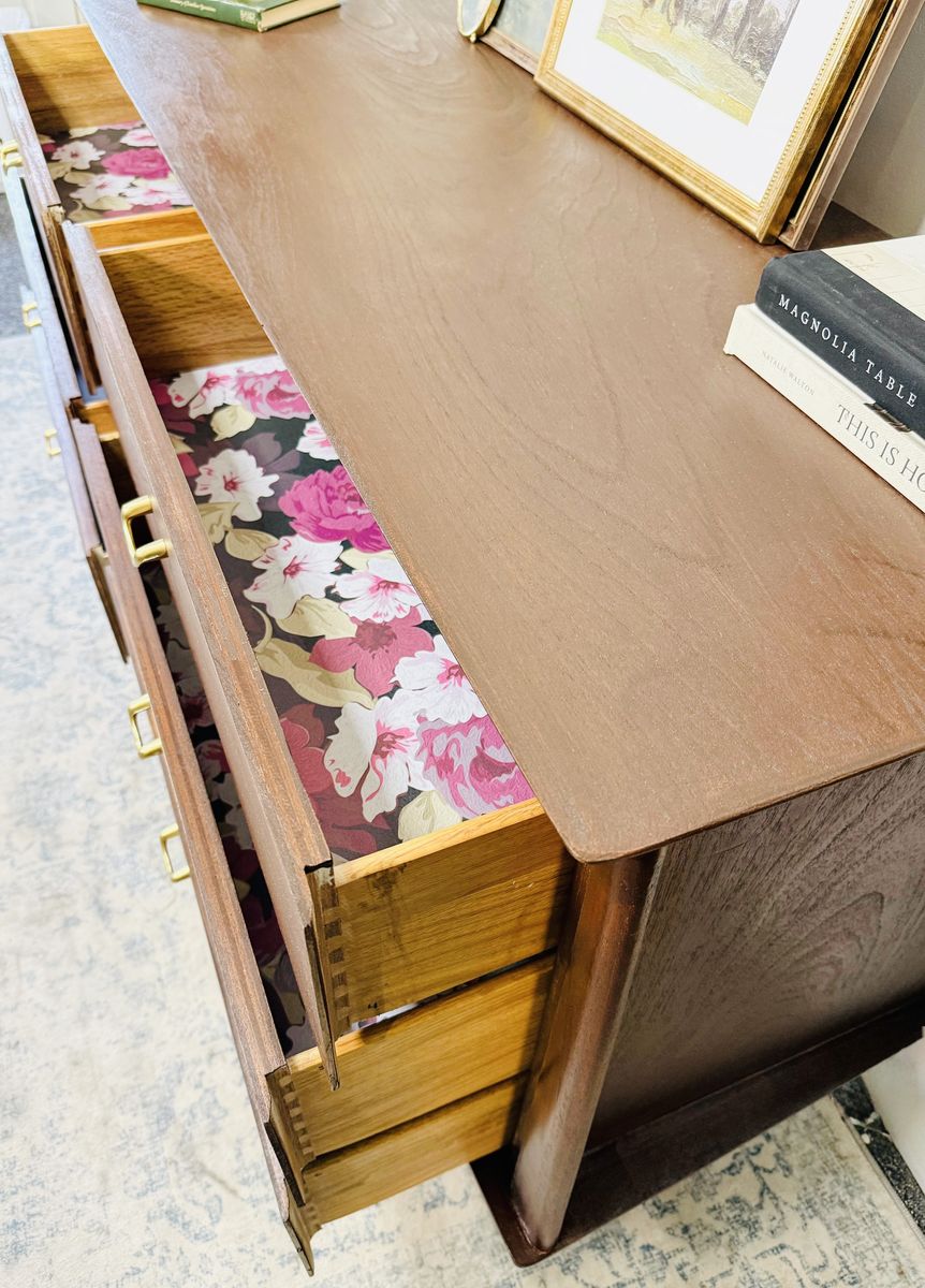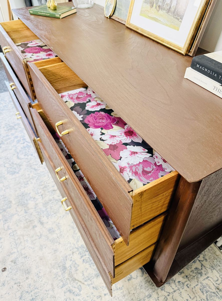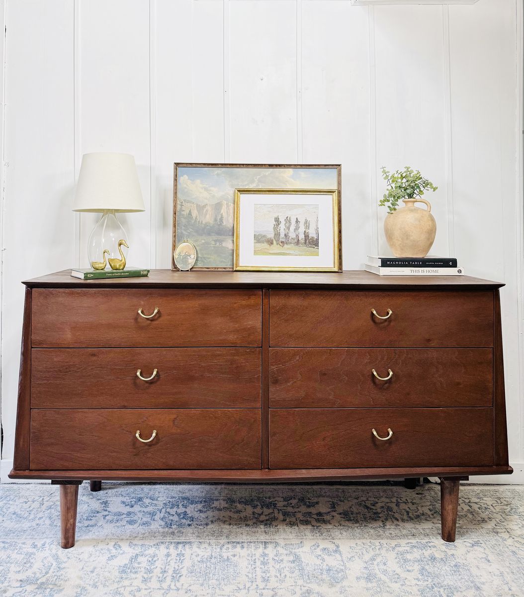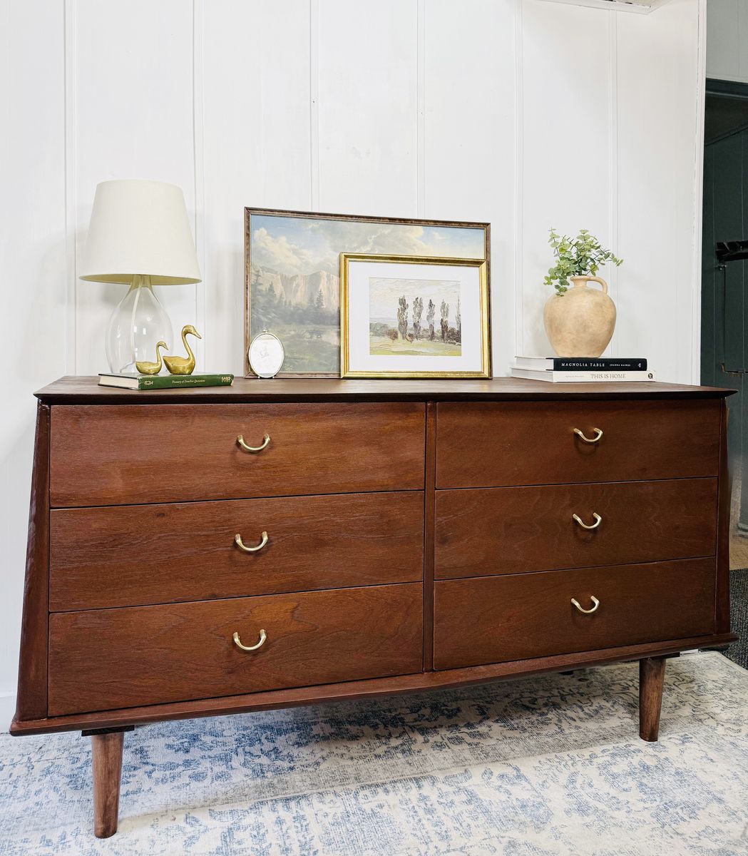 VenmoBring a piece of design history into your home with this exceptional vintage dresser from the sought-after Albert Distinctive Modern Furniture. This is a truly rare find and a prime example of high-end mid-century modern craftsmanship. Made of solid dark walnut, this dresser features a stunning, rich wood grain and iconic tapered legs. The unique curved bottom edge and the original polished brass hardware add a touch of refined elegance that sets this piece apart.