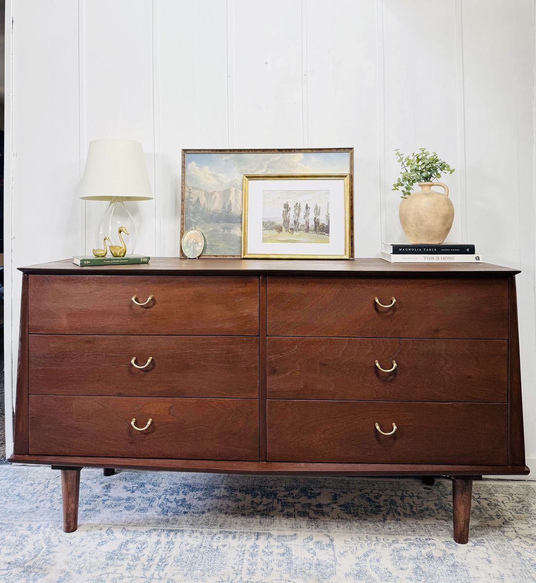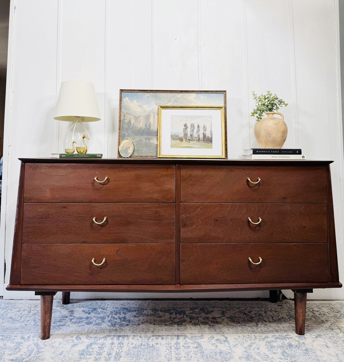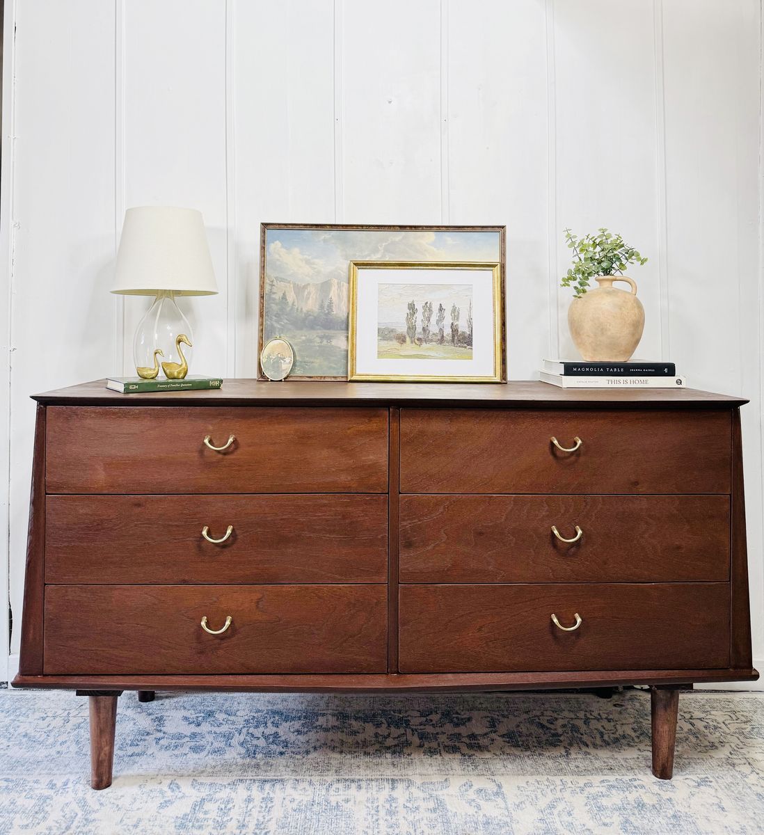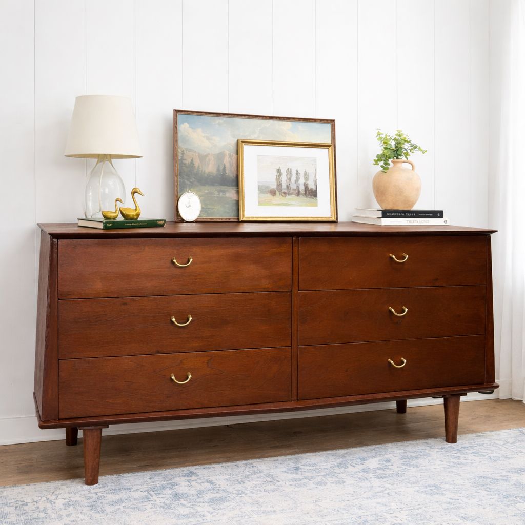 With six spacious, smoothly operating drawers, it offers ample storage for your bedroom or can function beautifully as a media console or stylish entryway piece. This dresser is in excellent vintage condition, showing only minor signs of age that add to its character. It’s stamped September 15, 1953.
