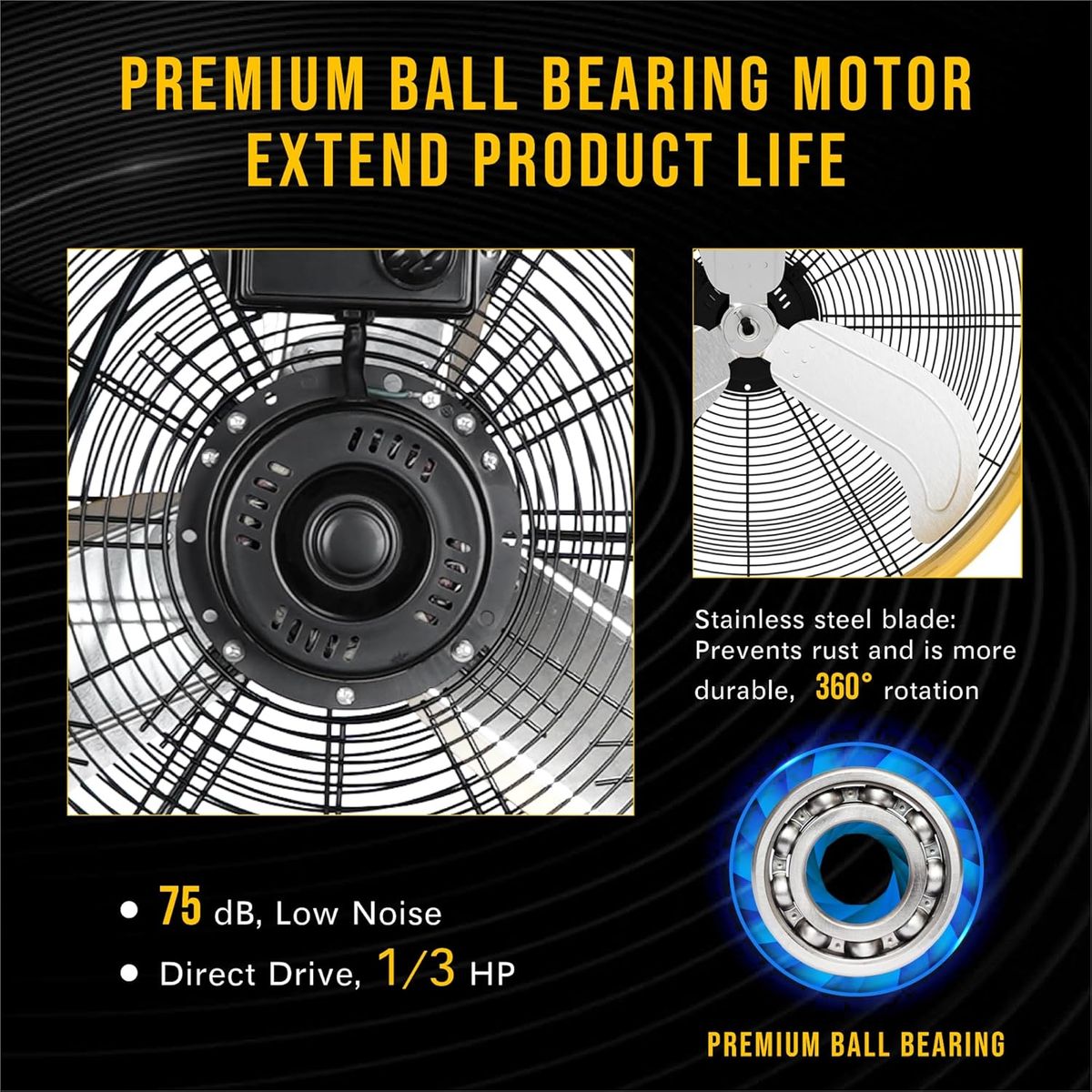 High-Velocity Airflow: With airflow options of 7700/ CFM, 6,000 CFM, and 5,000 CFM, this industrial fan provides three speed settings to suit your cooling needs. It tilts a full 360 degrees, giving you the flexibility to direct airflow exactly where it’s needed most. 75 décibel maximum.