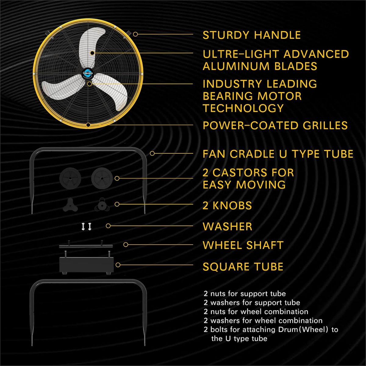 Convenience & Mobility: With two convenient handles on top and solid rubber casters, this drum fan is easy to move from one location to another. The nonskid legs ensure stability, and the speed-setting rotary switch on the back housing makes operation simple and intuitive.