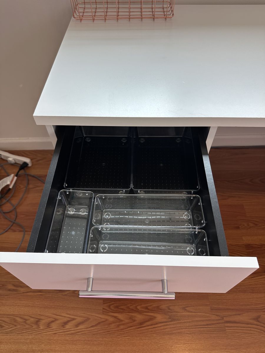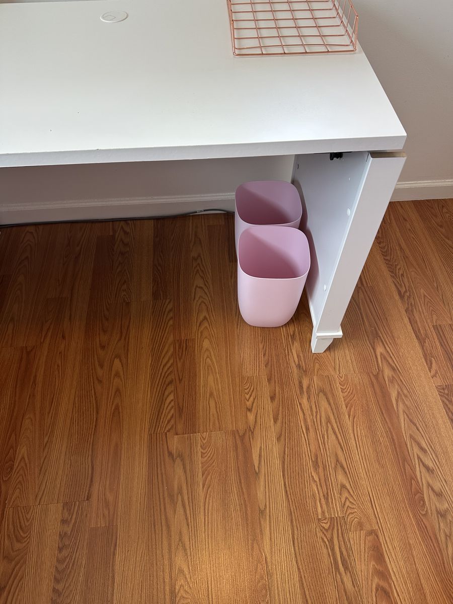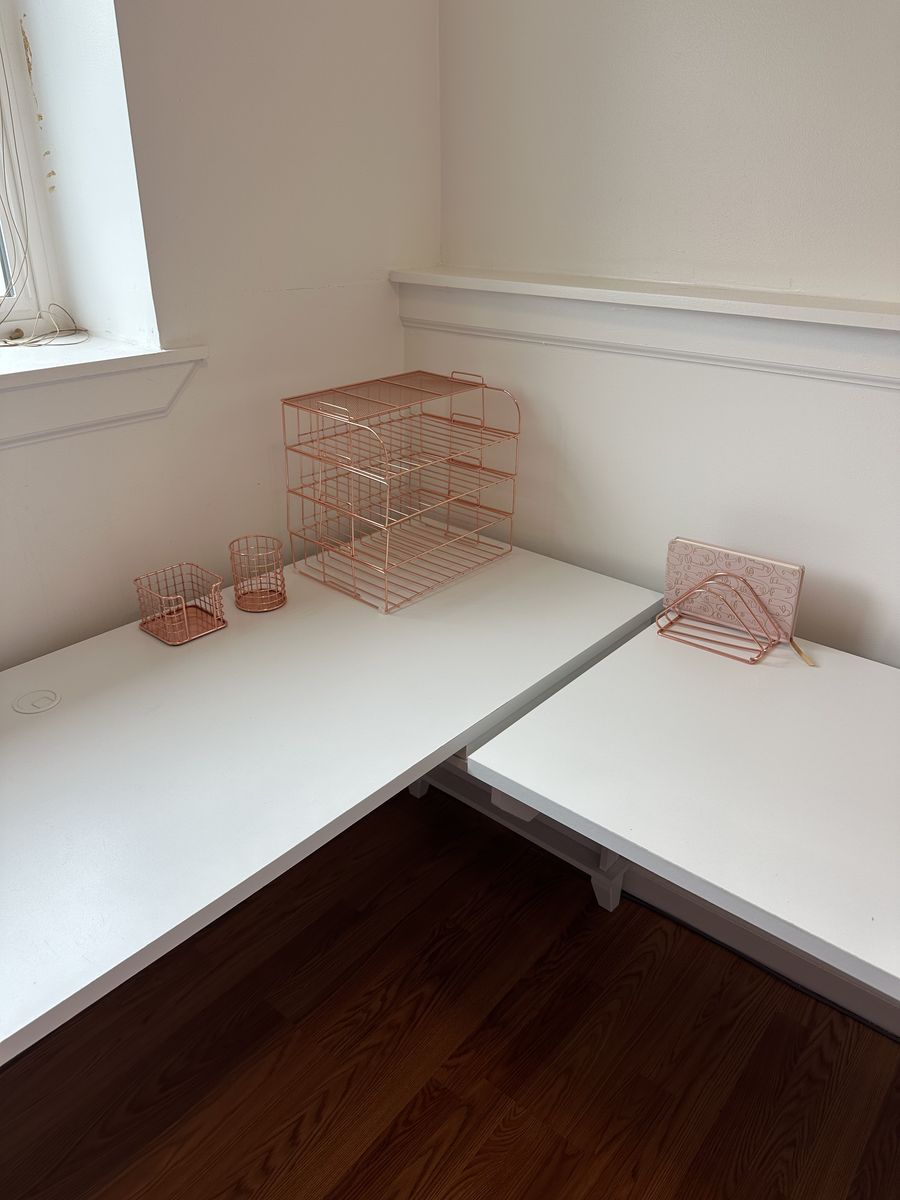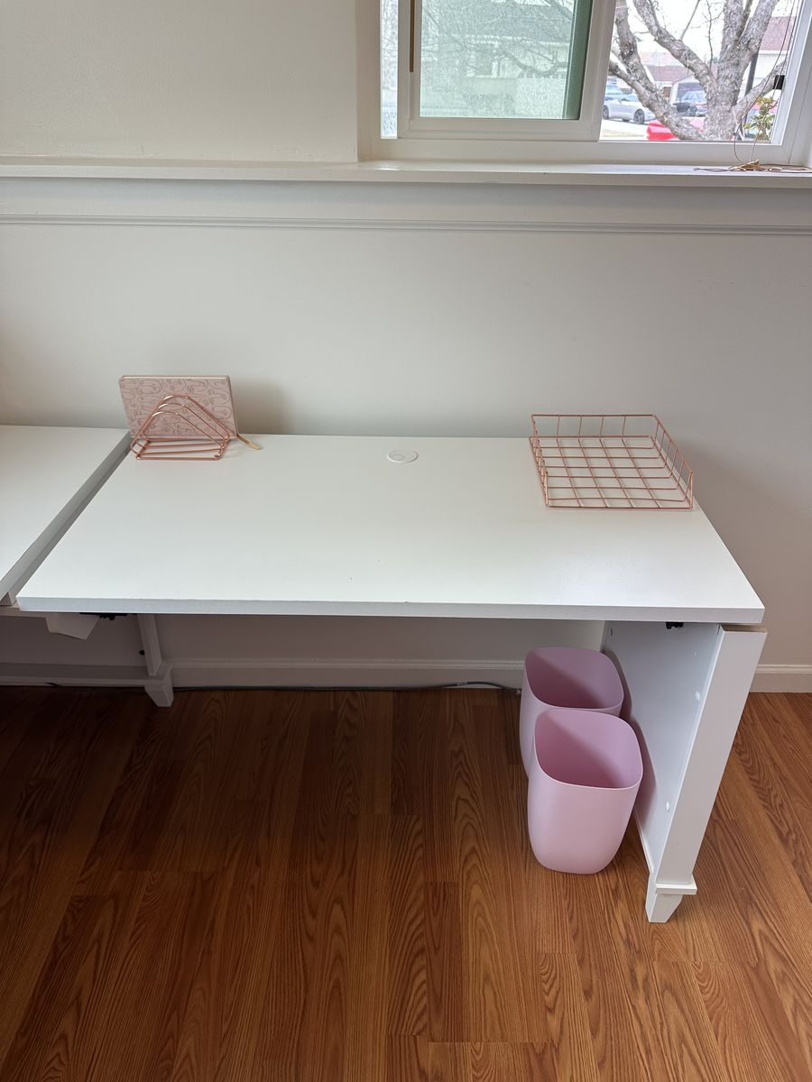 VenmoWhite L Shaped Sit and Standing Desk with drawers. Rose gold organizers included. Clear drawer organizers included. Pink alpha file included. Pink trash cans included. Must be able to dissemble and carry out on your own. Pick up only in West Valley. Cash or Venmo only. The side with the drawers is 71 inches. The side that stands is 42 inches. And it is 27 inches tall.