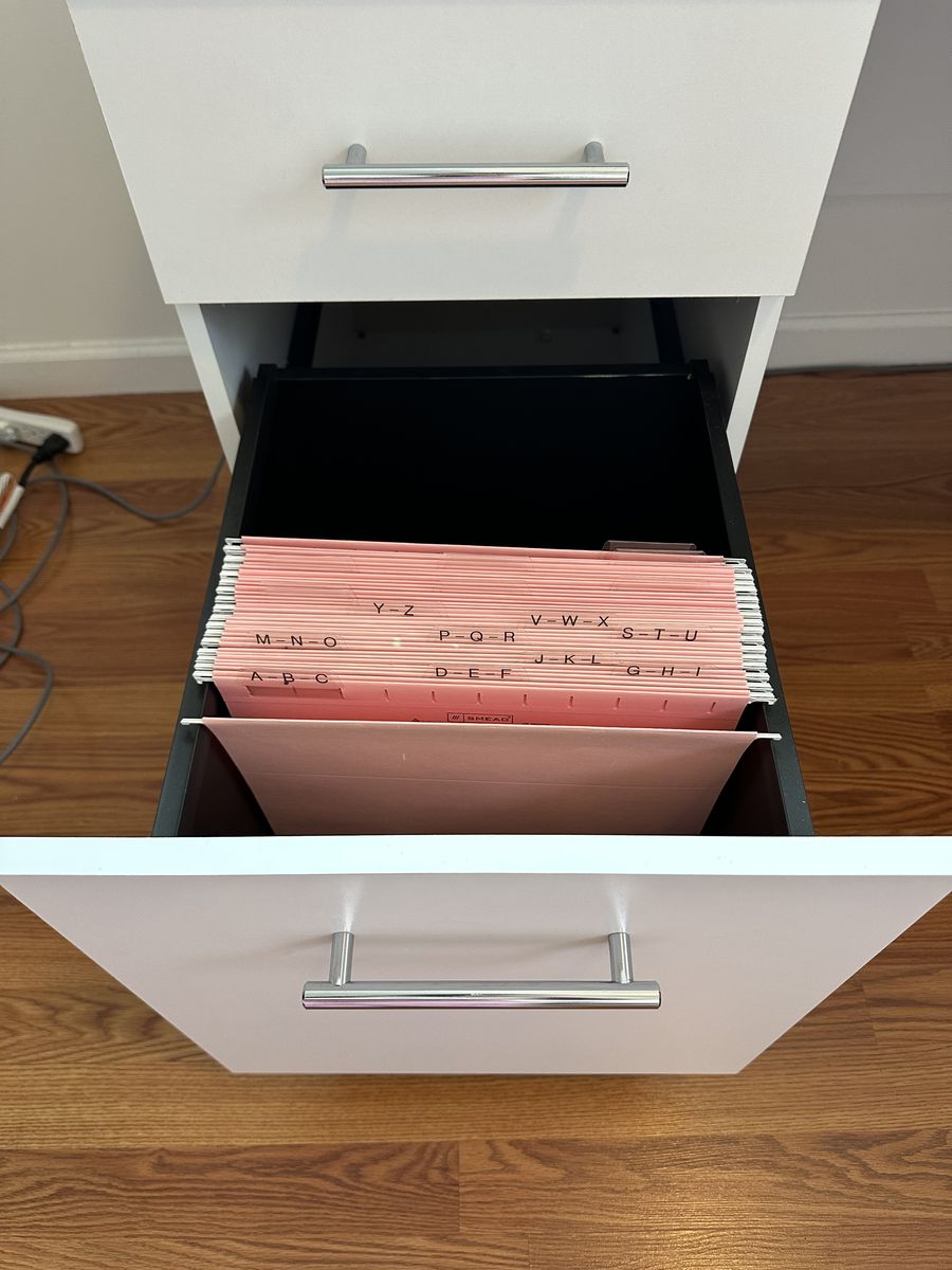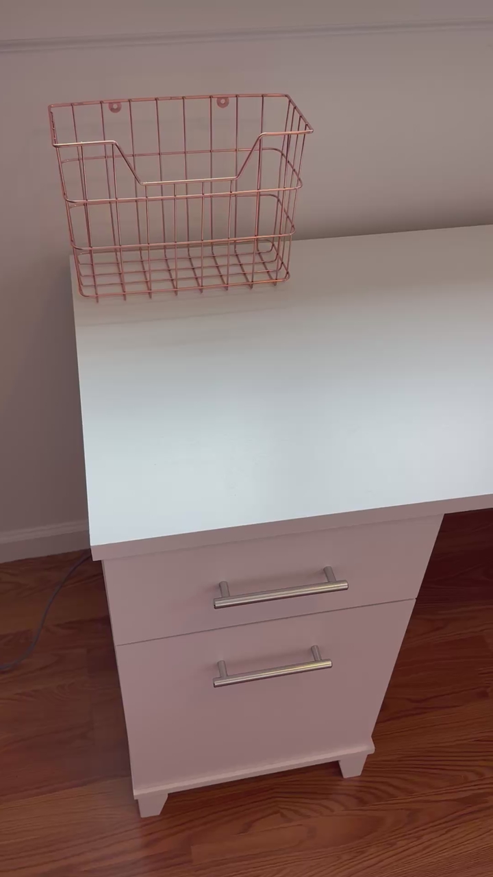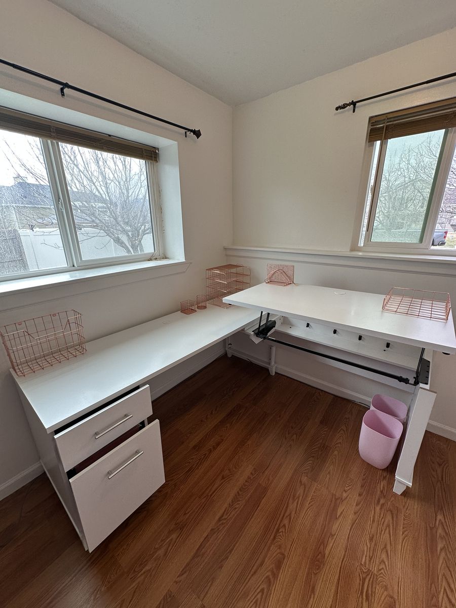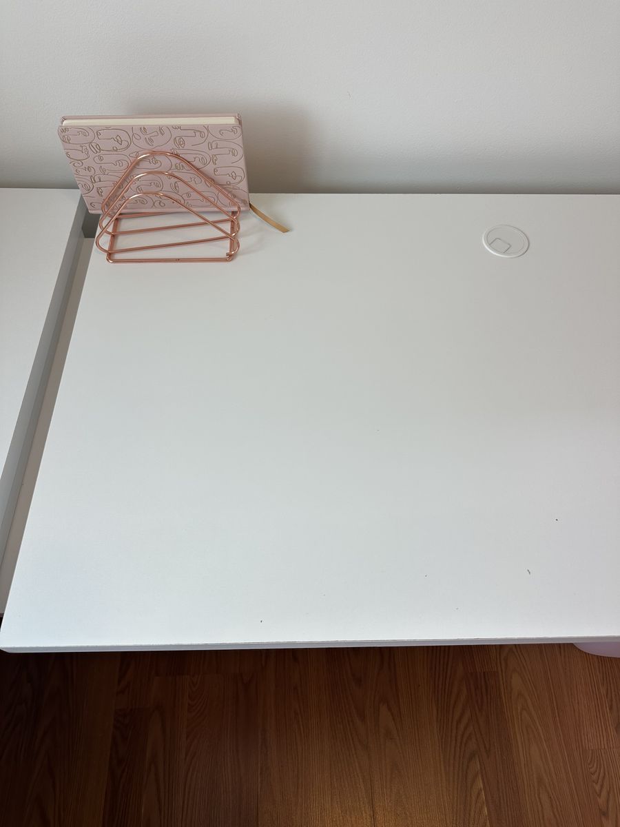 VenmoWhite L Shaped Sit and Standing Desk with drawers. Rose gold organizers included. Clear drawer organizers included. Pink alpha file included. Pink trash cans included. Must be able to dissemble and carry out on your own. Pick up only in West Valley. Cash or Venmo only. The side with the drawers is 71 inches. The side that stands is 42 inches. And it is 27 inches tall.