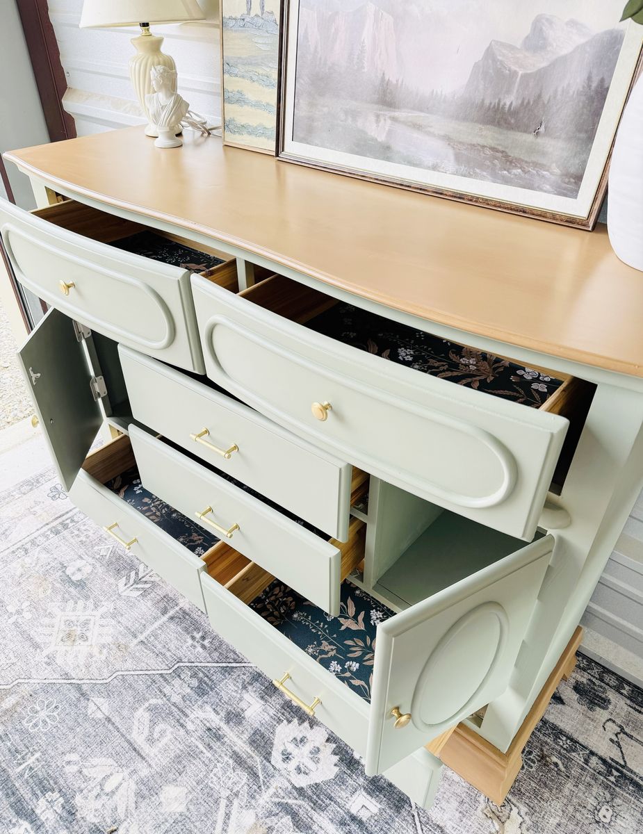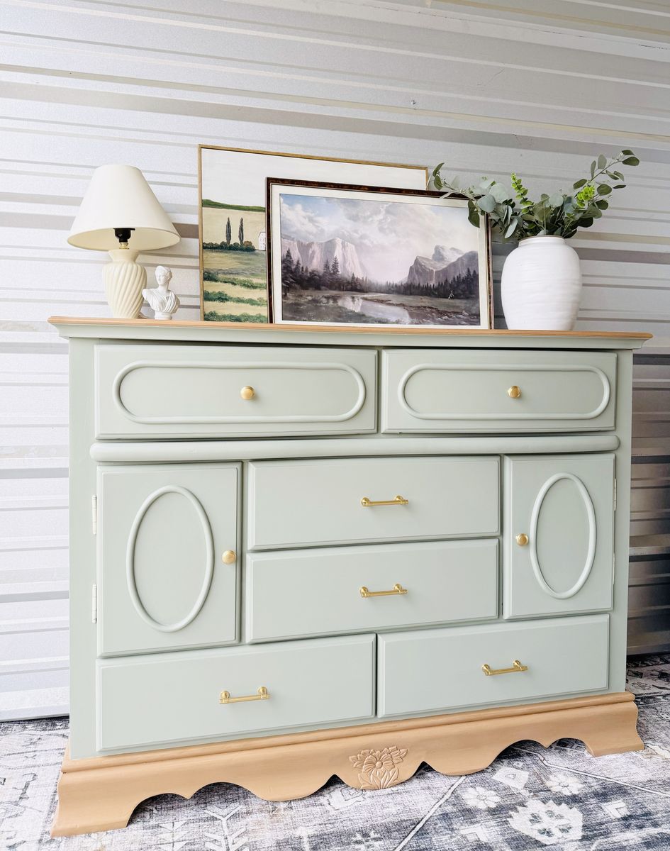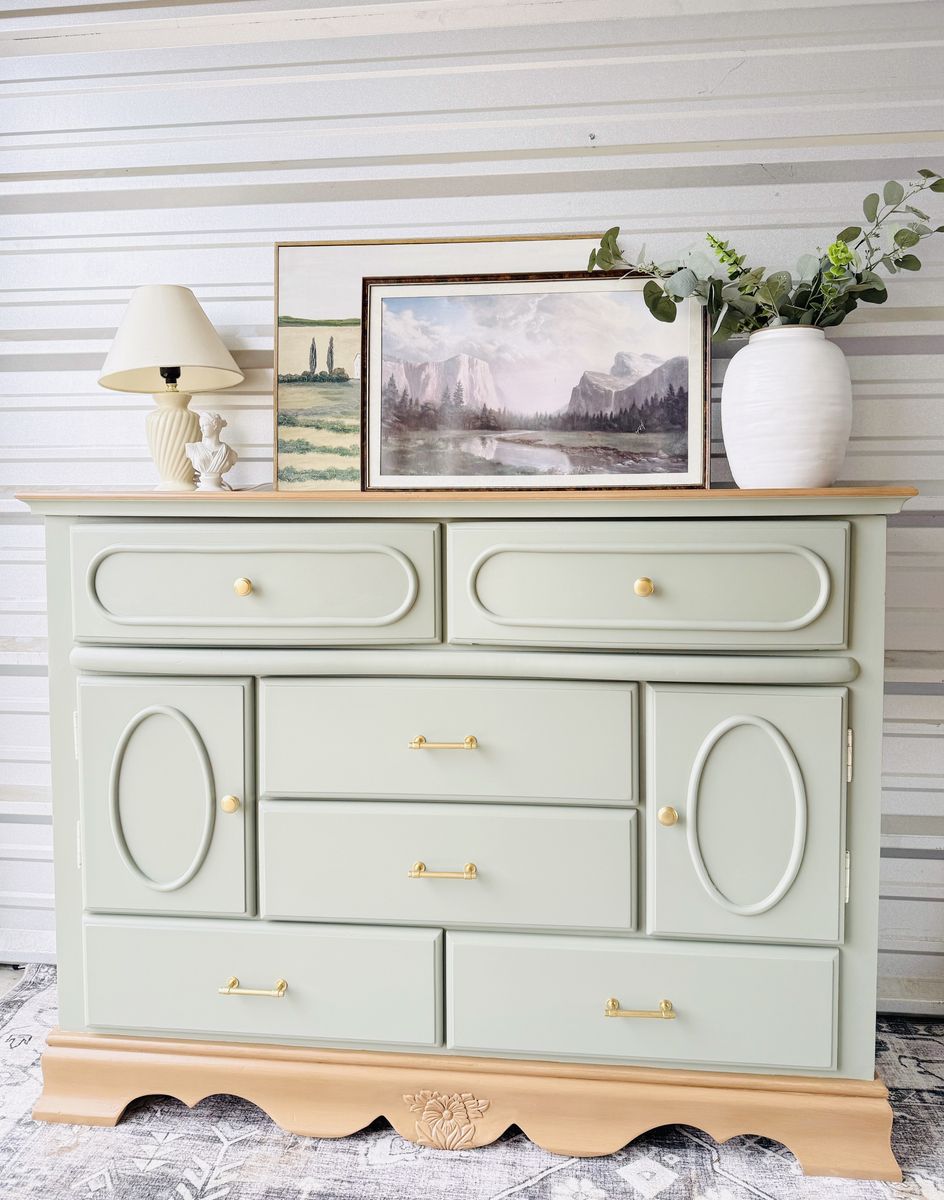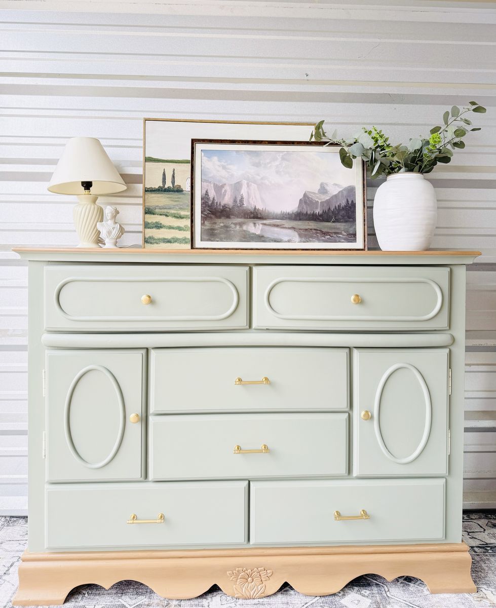 Refinished in a minty light blue sage green with a faux wood stained top & base. This piece brings a fresh yet timeless charm to any space.