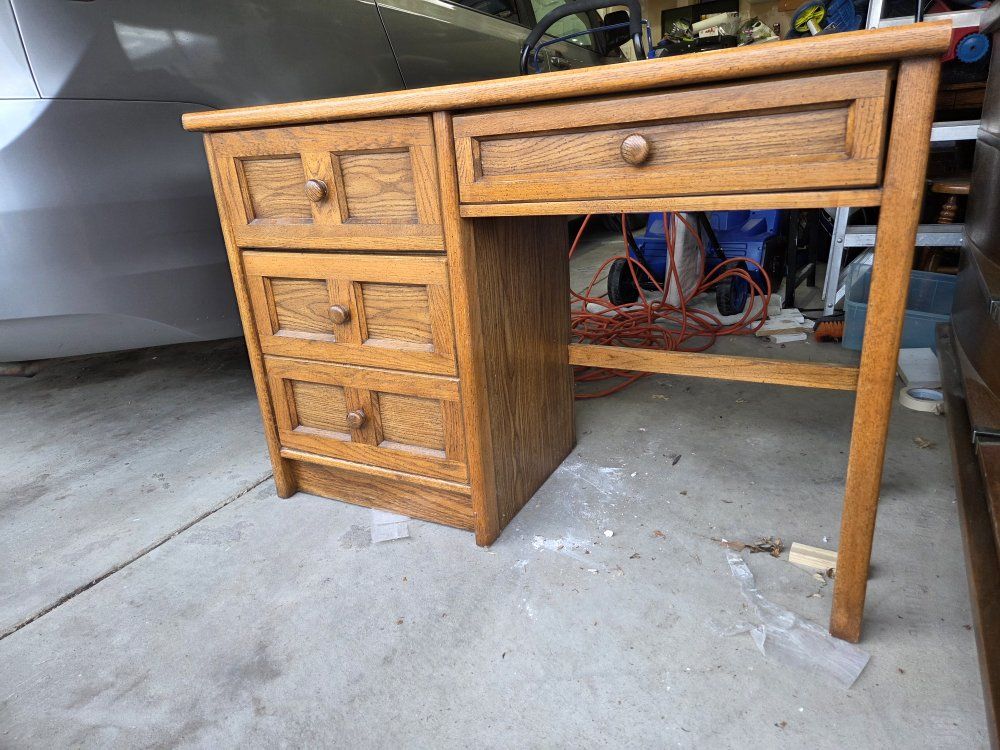 VenmoVintage Oak 4-Drawer desk with solid top inlay. Stanley Furniture.