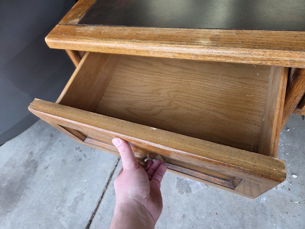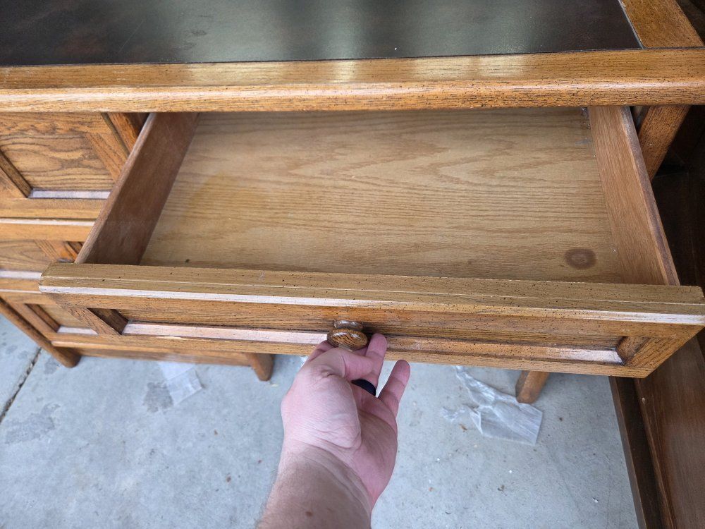 In good condition consmetically, very solid. The center and two of the side drawers are missing drawer stops, but function normally otherwise.