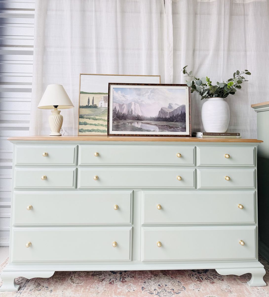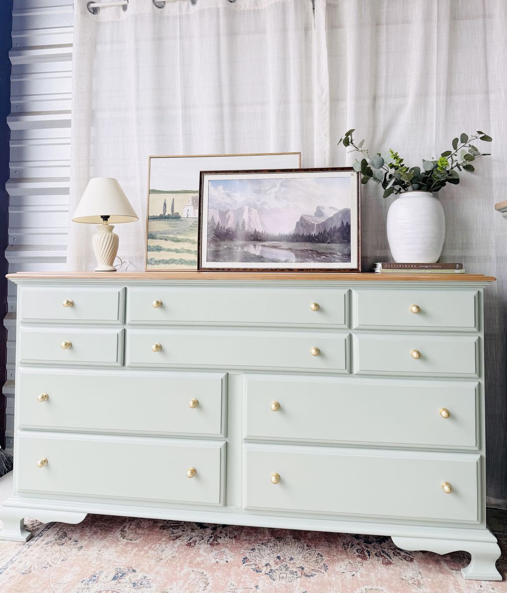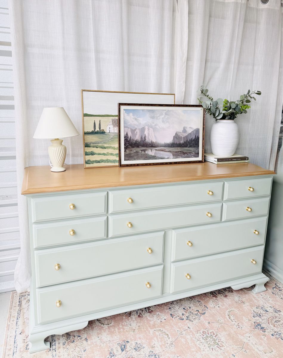 Refinished in a custom mix dark pale minty green blue with a faux stain top. This piece brings a fresh yet timeless charm to any space.