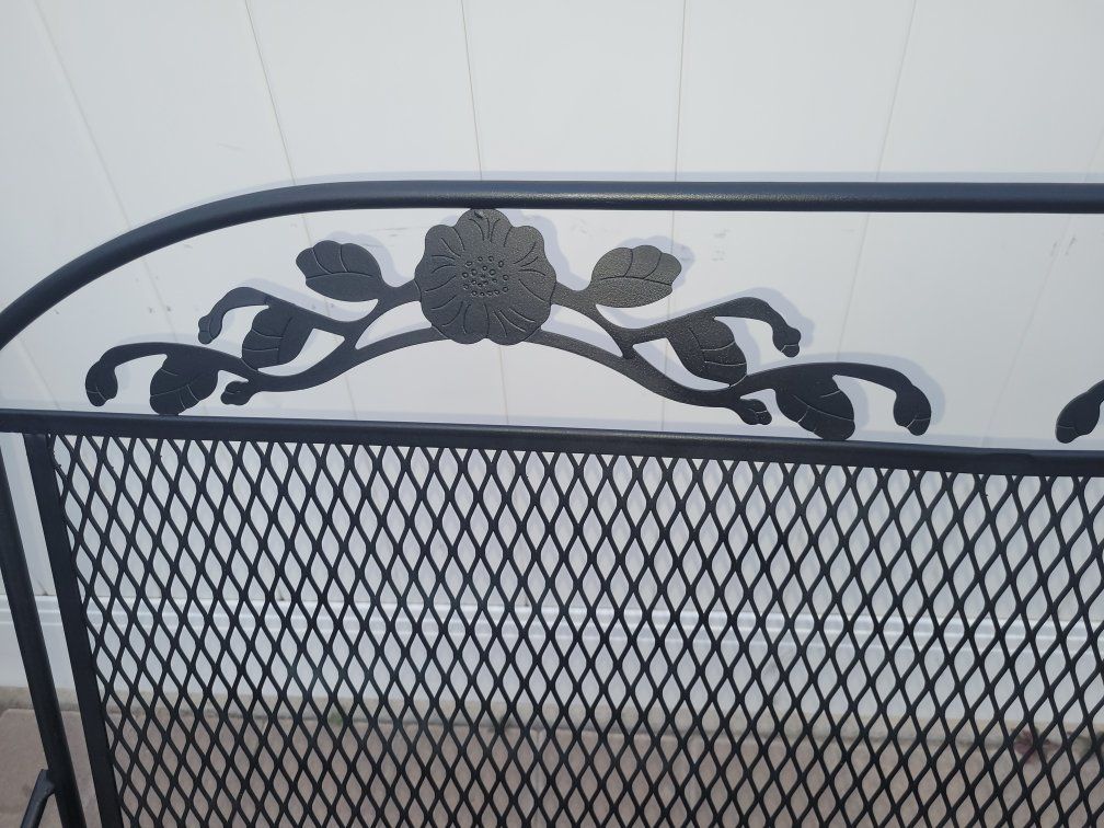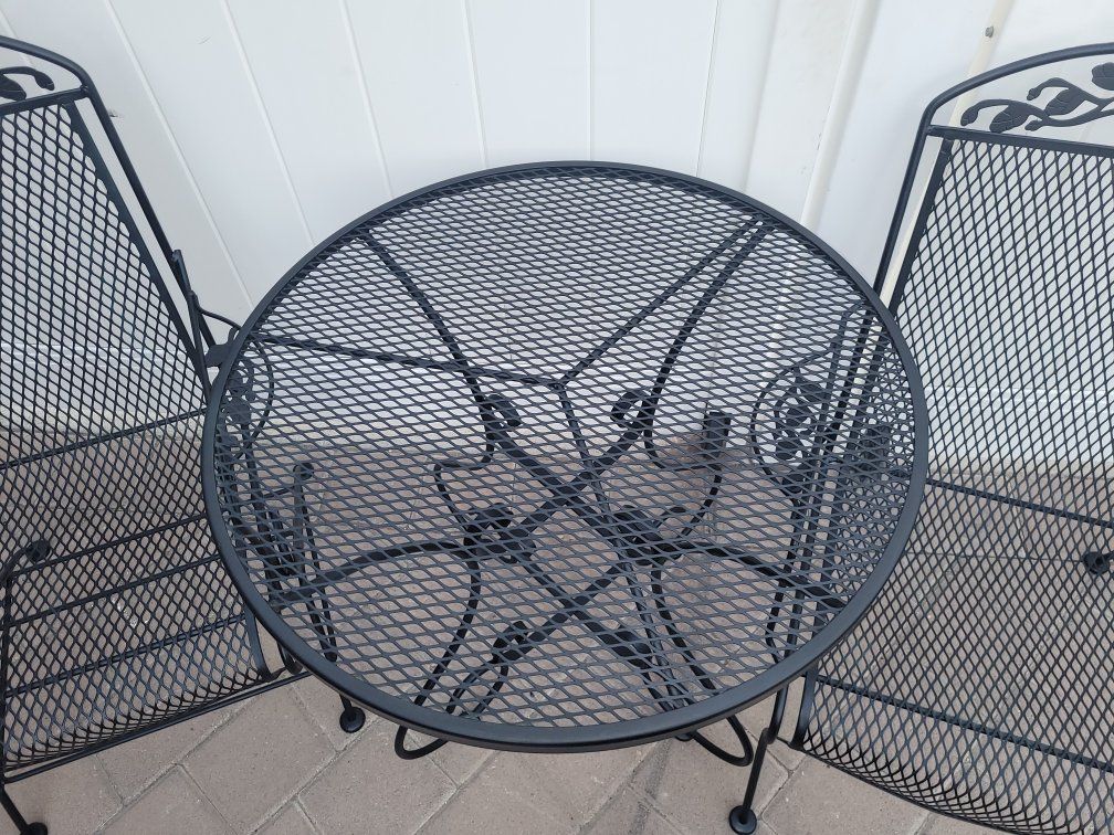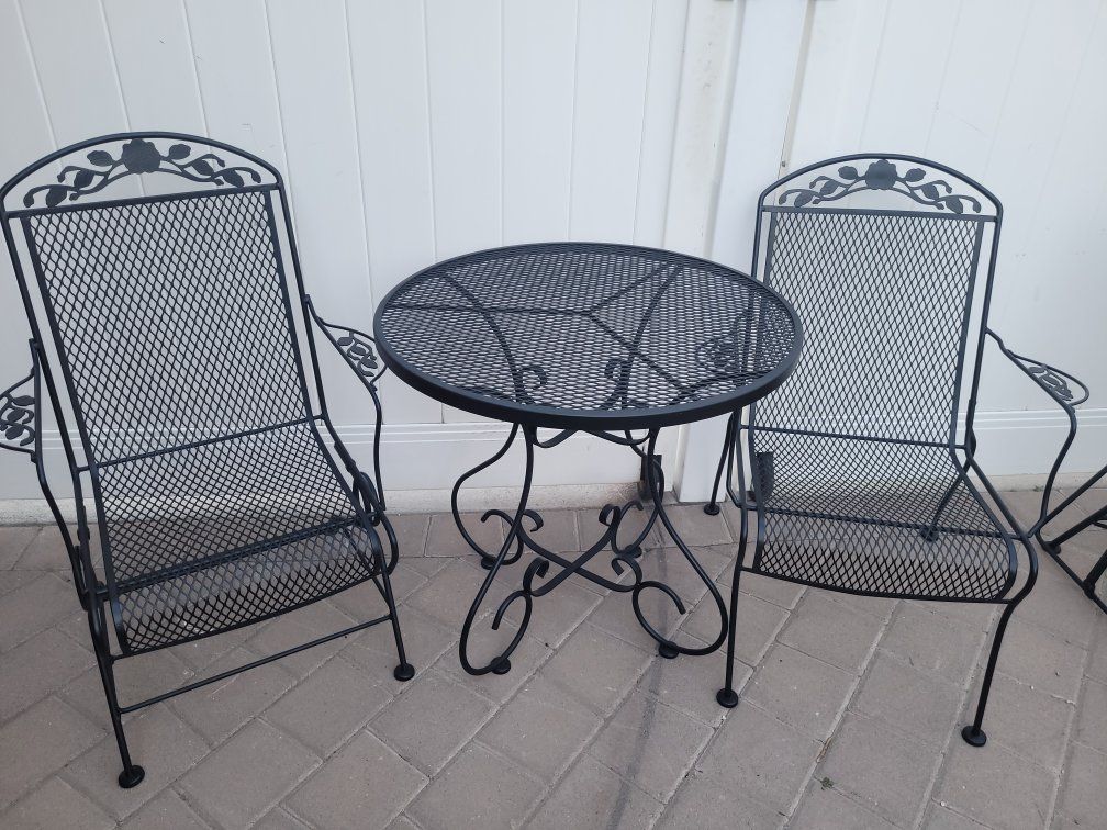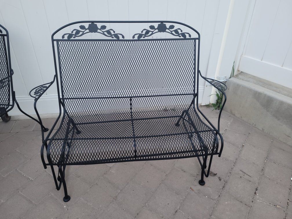 Wrought iron patio set includes glider- rocker bench, 2 chairs (one rocks) and a round bistro table. $300 for everything or $150 for bench $150 and $150 for 2 chairs and table