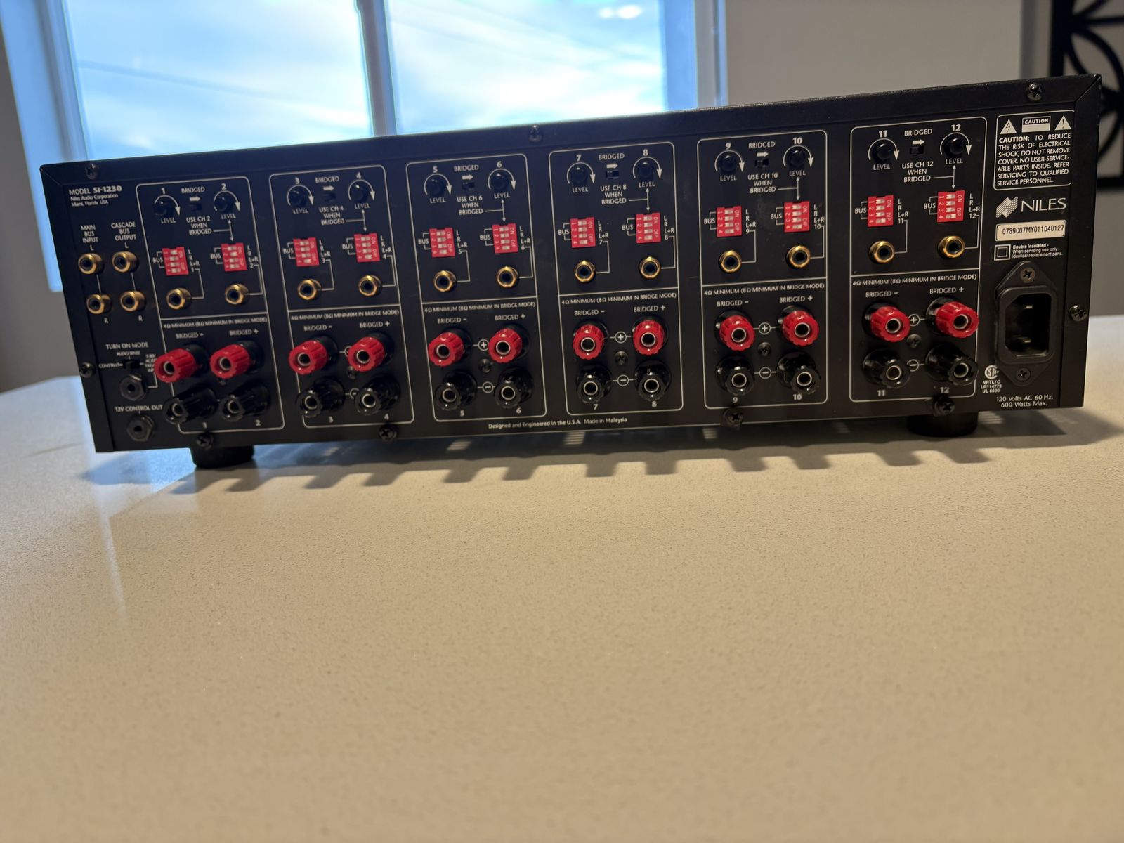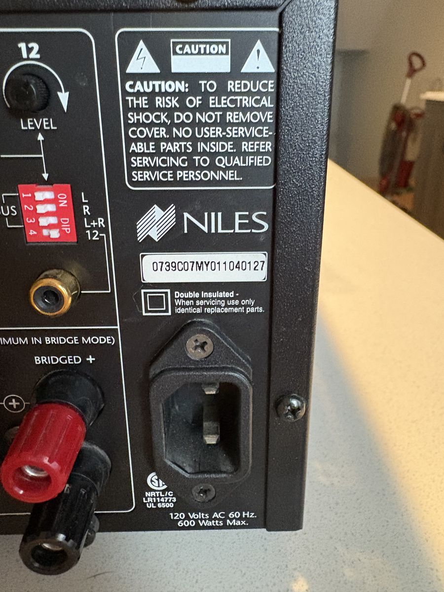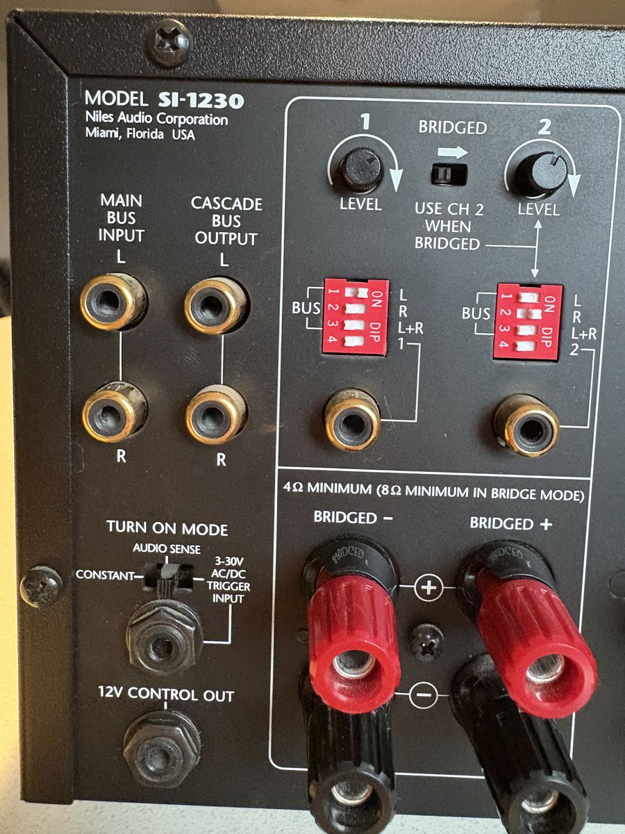 30 watts RMS per channel into 8 Ohms, all channels driven 42 watts RMS per channel into 4 Ohms, all channels driven adjacent channels are bridgeable to 80 watts RMS into 8 Ohms, all channels driven four audio options for each channel: left, right, left plus right (mono), or the channel's dedicated input independent level controls for each channel three turn-on modes: music sense, voltage trigger and manual binding posts spaced to accommodate dual banana plugs 6 independent turn-on circuits for multi-zone applications cascade outputs for "daisy-chaining" amplifiers independent protection circuits for each channel UL/CSA approved detachable AC power cord 17"W x 51/2"H x 15"D