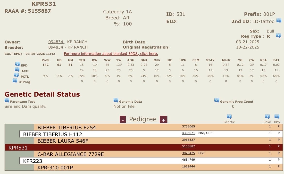 Great heifer prospect with growth! He has an impressive maternal and carcass trait profile . He has multiple traits in the top 30% of the breed. Long bodied with a good foot set.