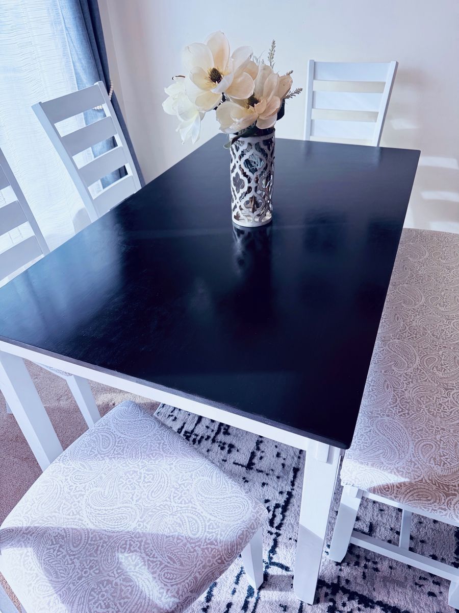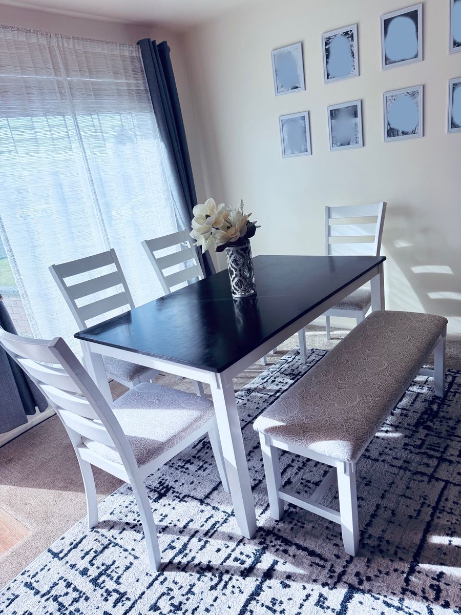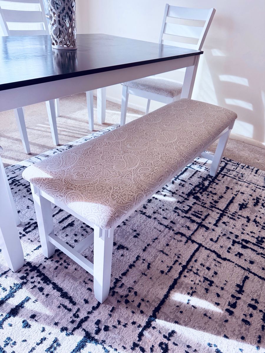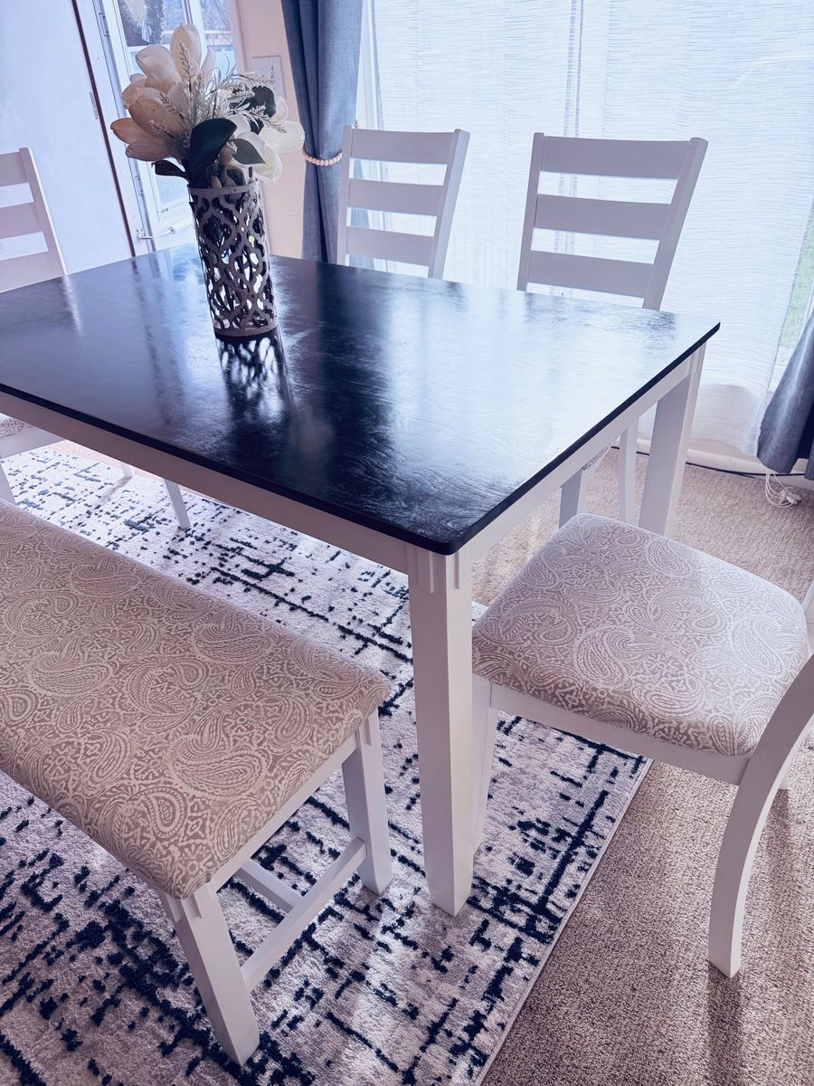 Beautiful dining set with a sleek black tabletop and white base. Includes table (5 ft x 3 ft), 4 cushioned chairs, and a matching bench.