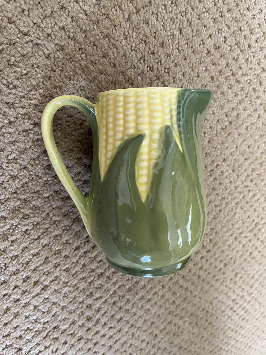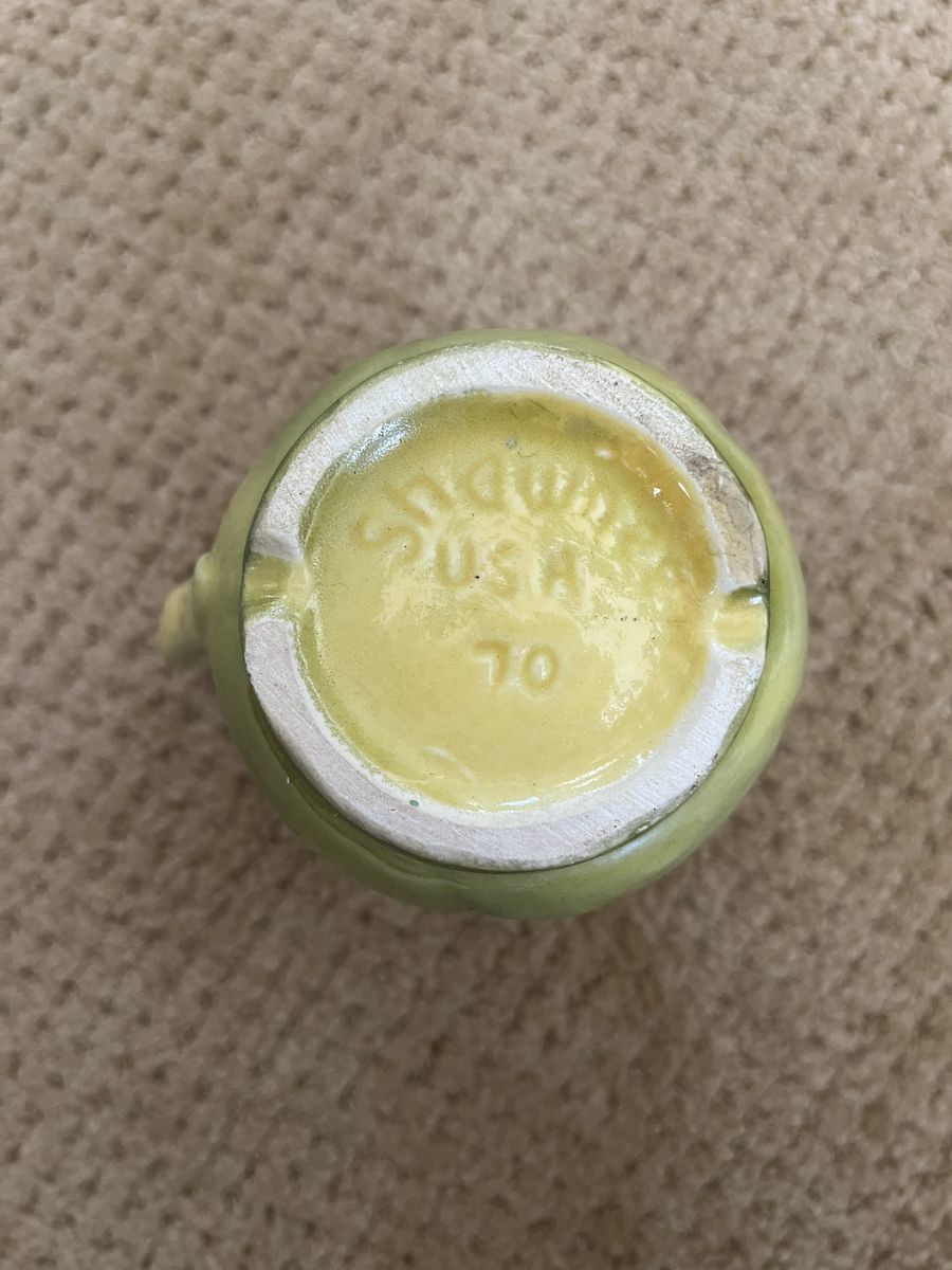 VenmoHow cute is this?! So cute! This is a really nice yellow and green corn pitcher. It is marked Shawnee USA 70. This measures 4 3/4 inches tall. It is almost 5 inches from the spout to the most outer part of the handle. It is 2 1/2 inches in diameter across the top. I believe this was made in Ohio. It is very clean inside, like it was never used. A really fun display item to add a pop of color. It would also be perfect to use. Thinking it was used to hold cream. As far as I can research this was made in the 1940's - 1950's. A great collector item. Price is firm.